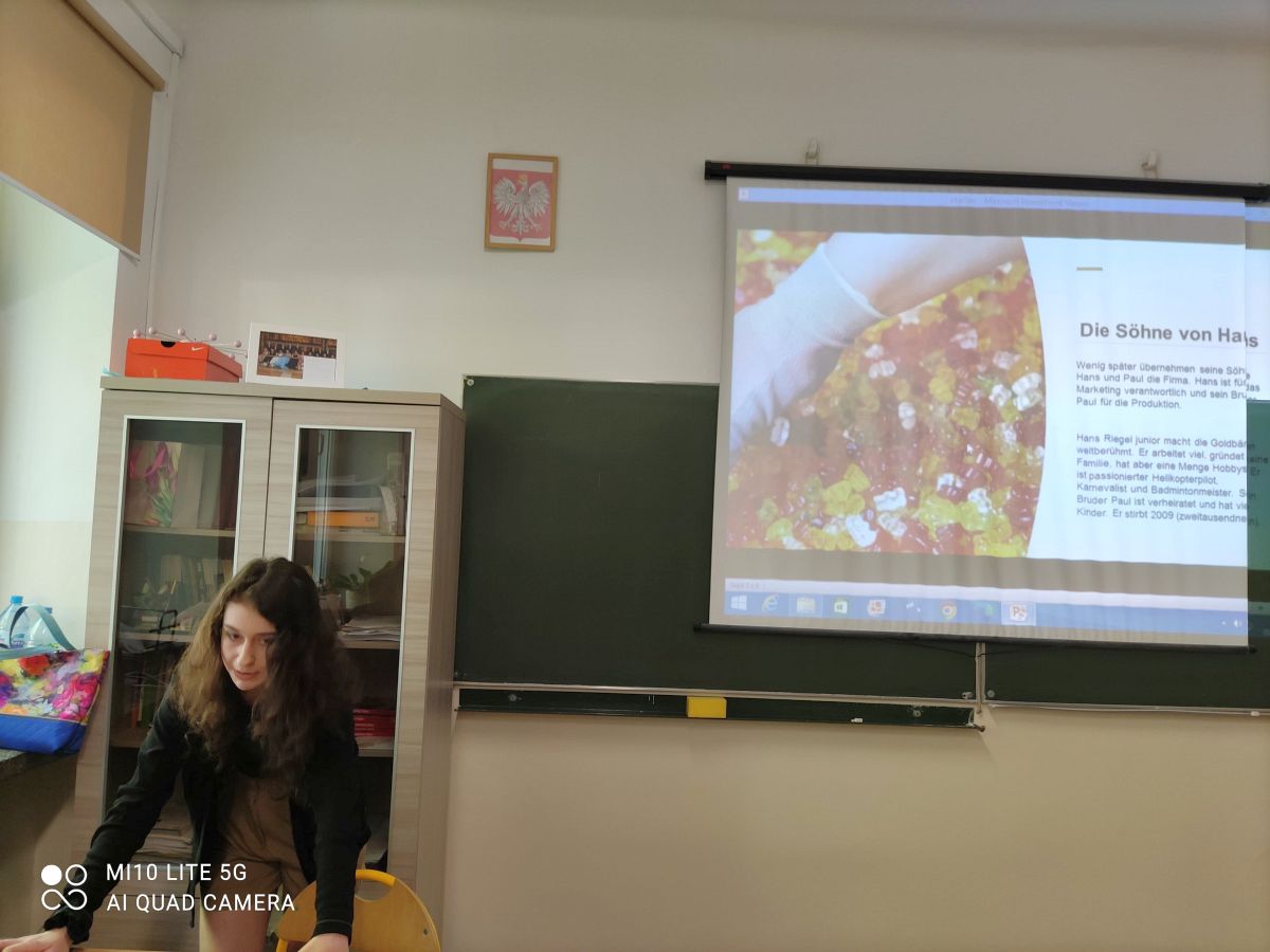 Uczennice klas pierwszych Klaudia Kańczugowska z 1a i Wiktoria Rumczyk z 1c przeprowadziły 8 czerwca. autorską lekcję języka niemieckiego. W bardzo ciekawy sposób przybliżyły swoim koleżankom i kolegom historię znanych wszystkim żelków - „ Złotych Misiów” niemieckiej firmy Haribo, które są produkowane od 1922 roku.