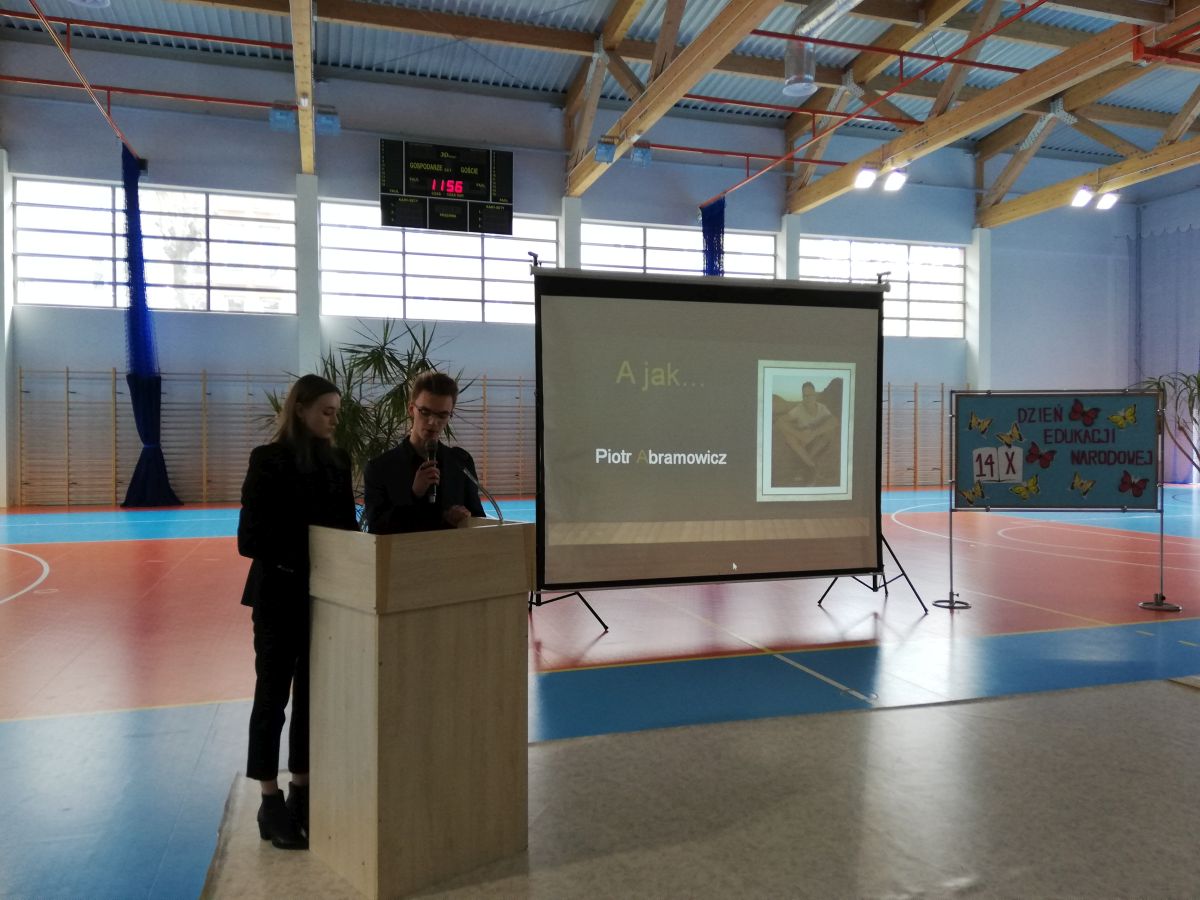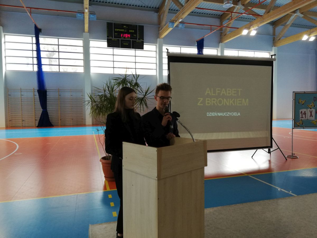 W zeszłym, trudnym roku pandemii uczniowie spotkali się ze swoimi nauczycielami zdalnie, aby złożyć im życzenia i przedstawić ALFABET NAUCZYCIELI BRONKA. W tym roku, gdy możemy świętować razem, uczniowie, Karina Kozieł, Maciek Dudzik i Zosia Boguta zechcieli powtórzyć ten program artystyczny, aby wybrzmiał wśród całej społeczności Bronka. W uroczystości wziął udział starosta powiatu świdnickiego p. Ł. Reszka. Bardzo ważnym momentem akademii było także ślubowanie uczniów. Do nauczycieli popłynęły pełne ciepła i życzliwości słowa wytrwałości w pracy, zdrowia i sił.