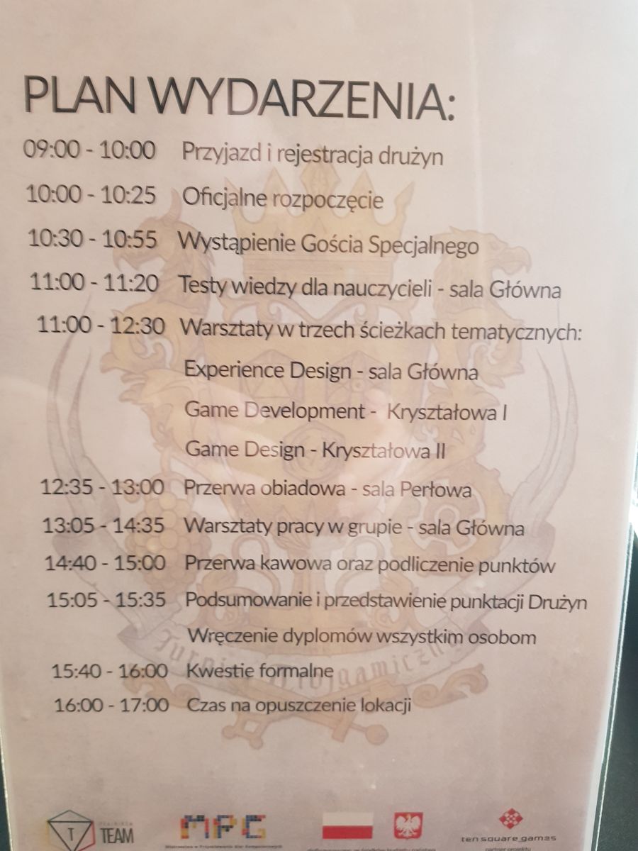 Plan wydarzenia był bogaty, po rejestracji i oficjalnym rozpoczęciu było wystąpienie Gościa Specjalnego, reprezentanta firmy PyramidGames. Następnie odbyły się testy wiedzy, nie tylko dla uczniów, ale ich opiekunów. Testy były punktowane i bardzo skrupulatnie sprawdzały wiedzę związaną z GameDev'em. Po nich przyszedł czas na poszerzenie swojej wiedzy podczas trzech warsztatów dla specjalizacji Experience Design, Game Development oraz Game Design. Tyle wrażeń oraz wytężania szarych komórek sprawiło, że kolejny punkt programu, jakim był obiad, cieszył się bardzo dużym zainteresowaniem wśród wszystkich zespołów biorących udział w turnieju.