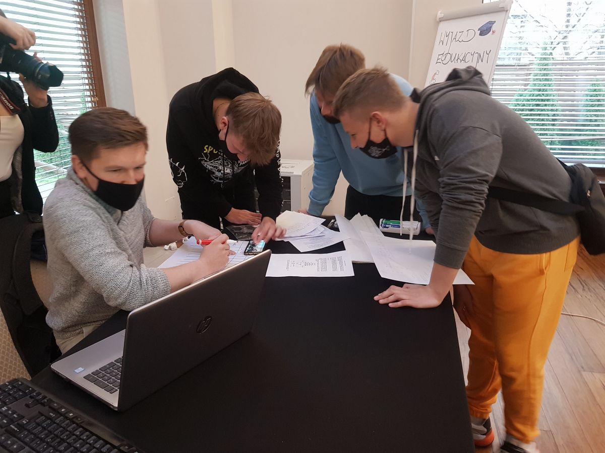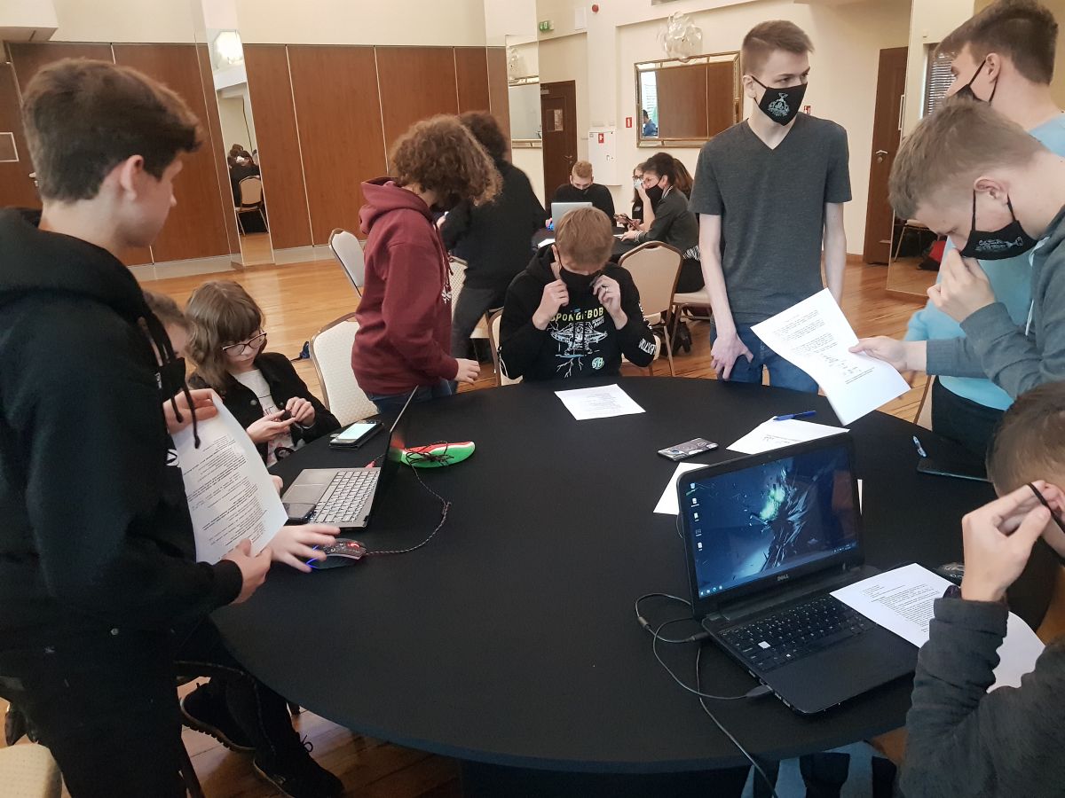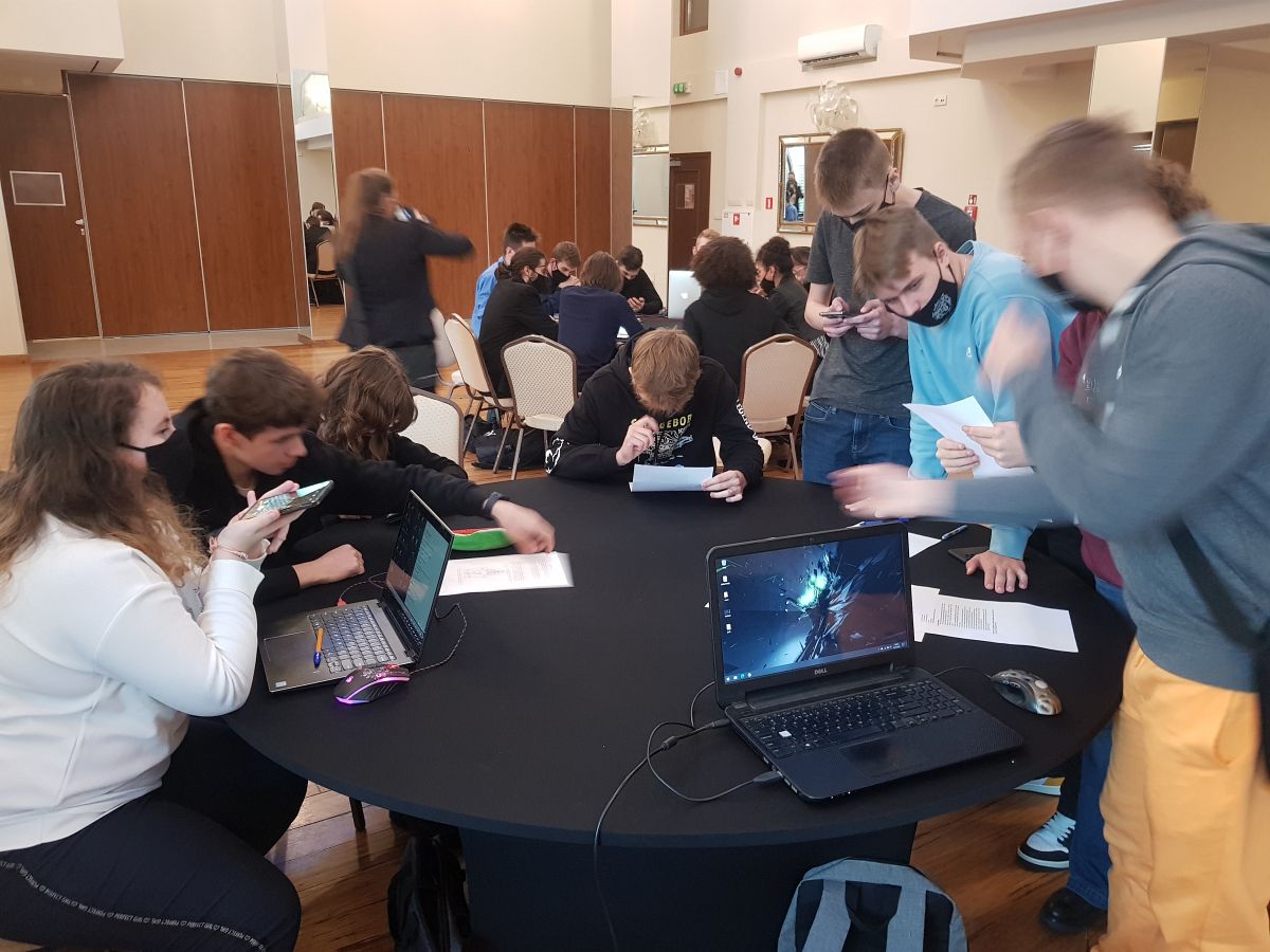 Kiedy już emocje opadły i wybiła godzina 13:05 rozpoczęły się warsztaty pracy w grupie, co było największym wyzwaniem, jakie dotąd spotkało naszych uczniów. Mieli jedną godzinę na rozwiązanie wielu zagadek matematycznych, logicznych, graficznych, sprawdzających ich wyobraźnie, intuicje oraz co najważniejsze, zdolność pracy w grupie. Zespół z "Bronka" pokazał niesamowitą klasę! Ze 100 punktów, które mogli zdobyć podczas ostatniej części zdobyli aż 88! Jest to niesamowity wynik biorąc pod uwagę trudność zagadek. Nasi uczniowie zdobyli 2 miejsce uzyskując ostatecznie 164 punkty! Dodajmy, że byli bardzo blisko miejsca pierwszego, zabrakło im zaledwie 5 punktów! Tym samym awansowali do trzeciego etapu i już 6 grudnia wyjeżdżają na 5 dniowe warsztaty z projektowania gier podczas których, oprócz zdobywania wiedzy, pracy nad swoją grą przygodową "Ardena", będą zdobywali kolejne punkty!
