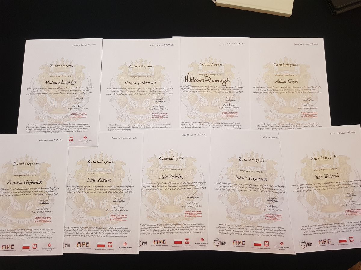 W mijającym tygodniu, 16 listopada nasi uczniowie wyruszyli na II etap Turnieju Trójgamicznego, konkursu projektowania gier komputerowych. Z zespołu liczącego 10 osób oraz 3 opiekunów pojechało 9 uczniów: Julia Wiącek, Wiktoria Rumczyk, Ada Pędzisz, Adam Gajos, Filip Klusek, Kacper Jurkowski, Jakub Trześniak, Mateusz Łagoźny (Korneliusz Szewczyk uczestniczył "duchem") oraz p. Łukasz Run.