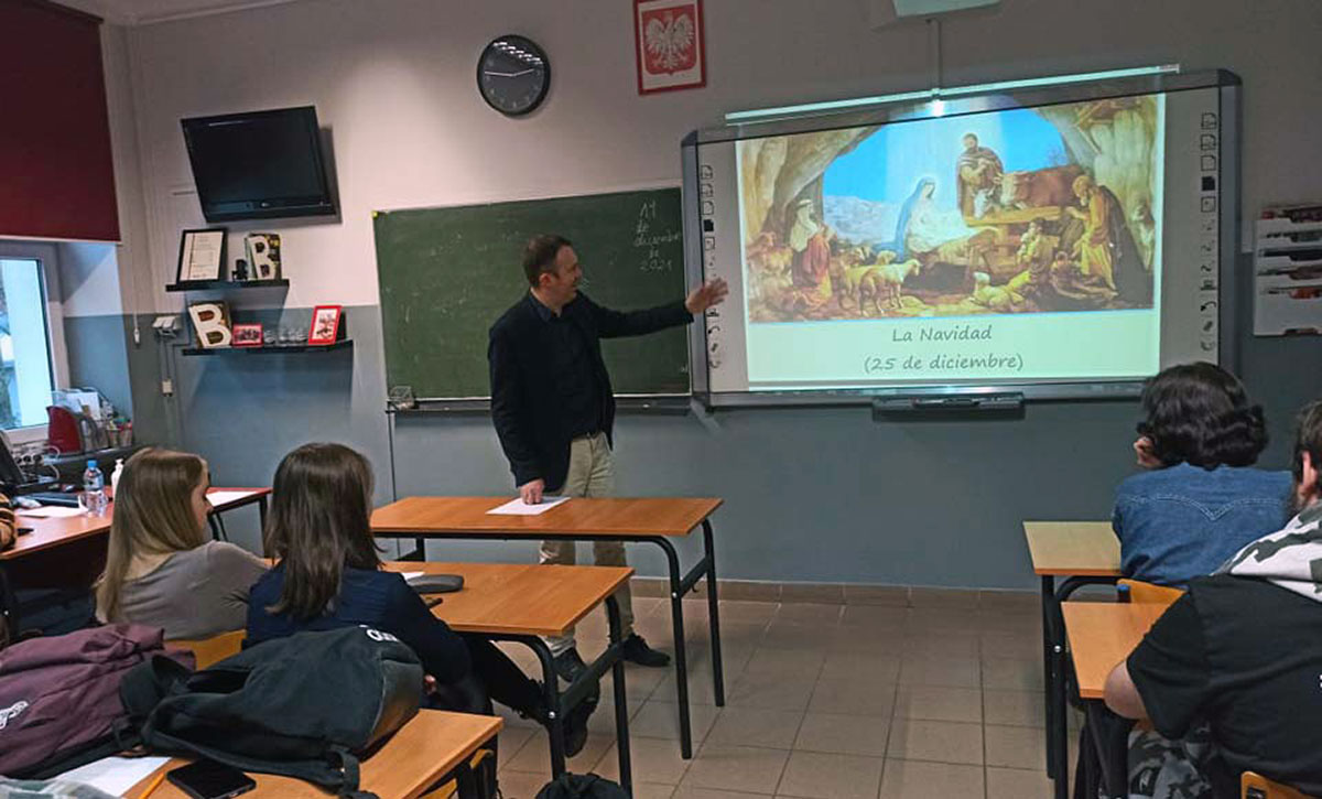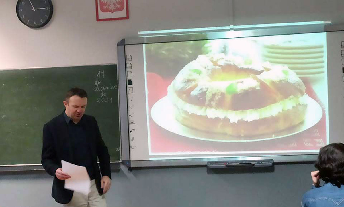 W piątek 17 grudnia naszą szkołę odwiedził dr Piotr Wasilewski - Wykładowca Akademicki KUL, Koordynator Centrum Egzaminacyjnego Madryckiej Izby Przemysłowo-Handlowej. Dzięki jego obecności mieliśmy okazję na chwilę przenieść się do Hiszpanii i zapoznać się ze świątecznymi tradycjami jej mieszkańców. Prezentacja na temat Świąt Bożego Narodzenia (La Navidad) w Hiszpanii obfitowała w informacje o tradycjach oraz ciekawostki związane z tym czasem.