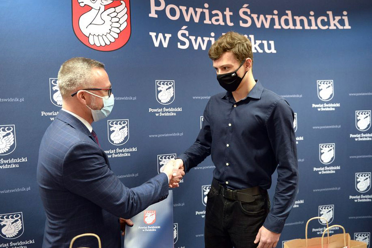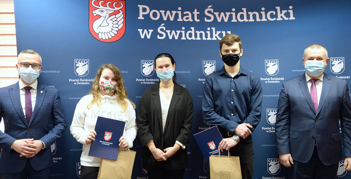 W czwartek 20 stycznia w sali konferencyjnej starostwa miało miejsce bardzo miłe spotkanie. Zostali na nie zaproszeni stypendyści Prezesa Rady Ministrów Przemek Kopeć i Wiktoria Rumczyk. Starosta powiatu świdnickiego p. Ł. Reszka oraz szef świdnickiej oświaty p. Romuald Gumieniak wręczyli im dyplomy gratulacyjne i upominki.