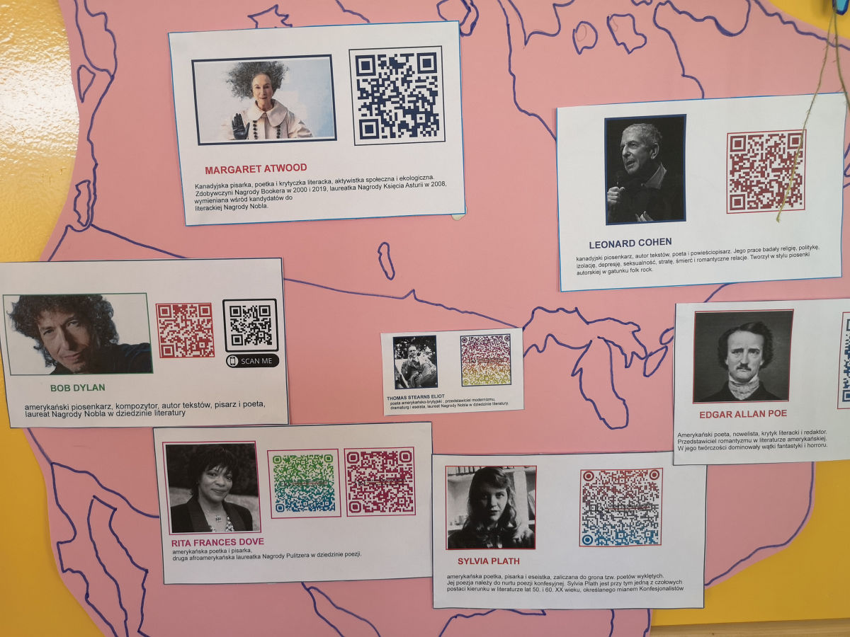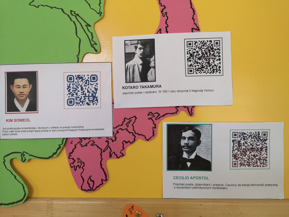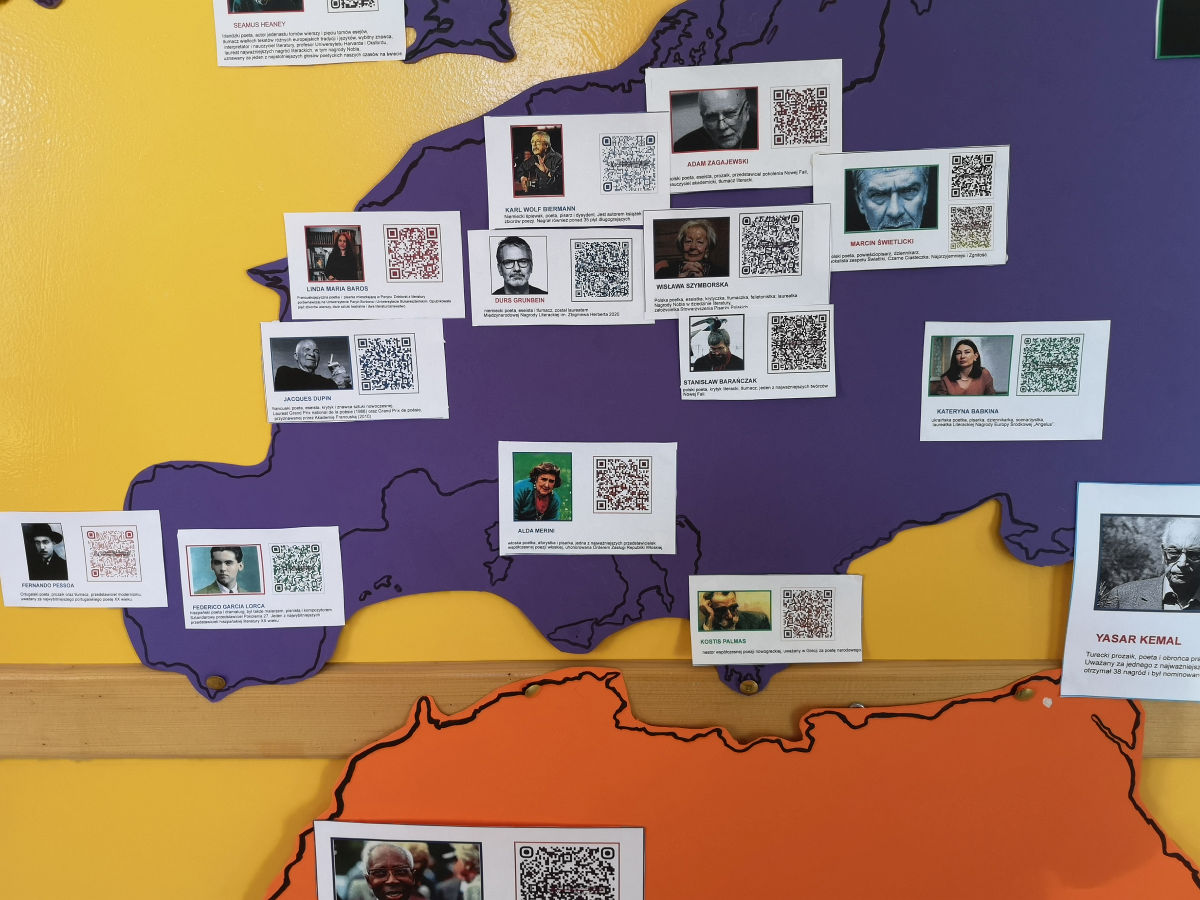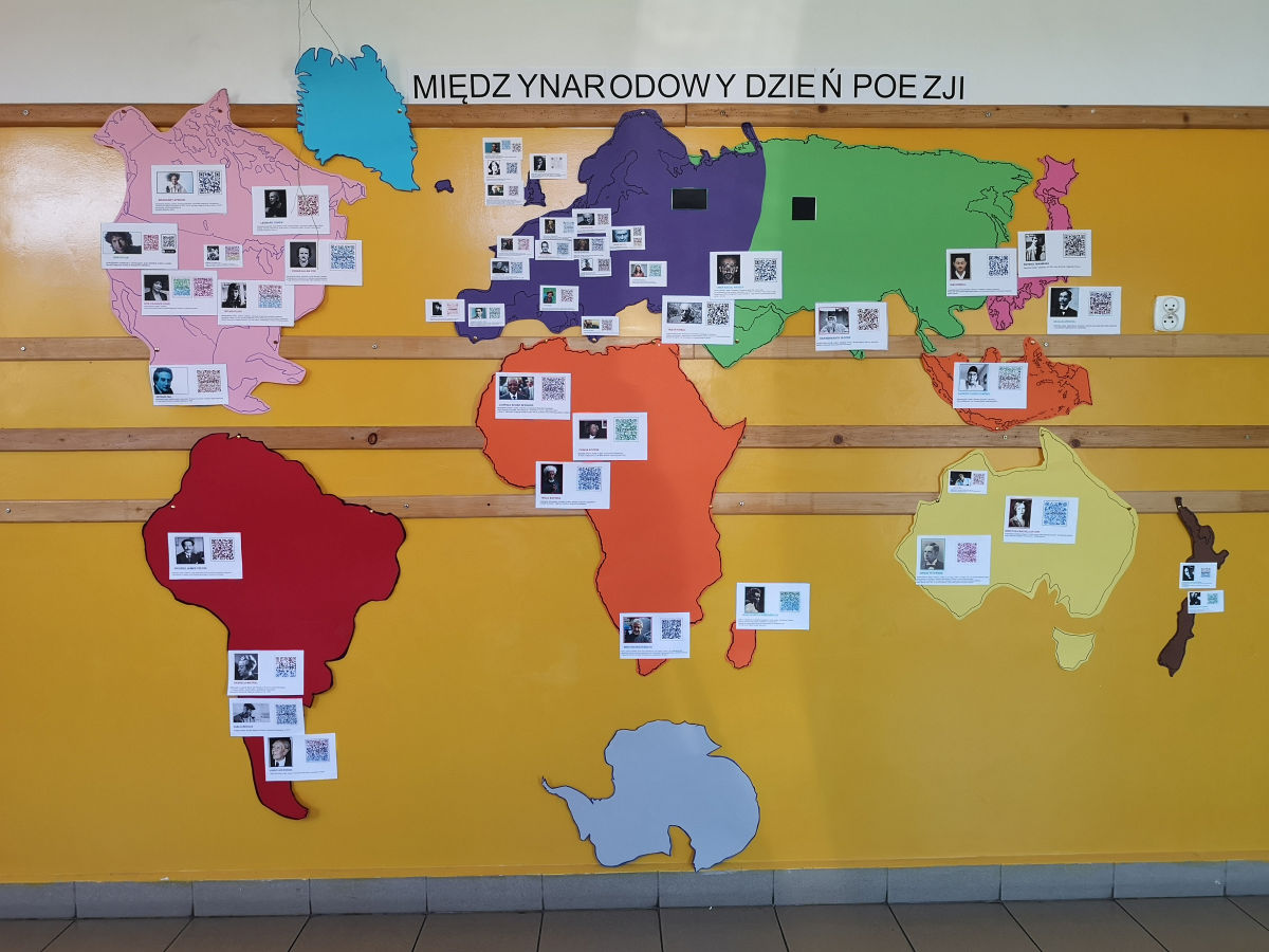 21 marca, pierwszy dzień wiosny w ILO obchodzimy poetycko, albowiem w tym dniu na całym świecie świętowany jest Światowy Dzień Poezji. Z tej okazji w naszej szkole powstała ogromna mapa świata poetów. Odczytując kody QR możecie dowiedzieć się ciekawostek między innymi na temat Chinua Achebe, Yasara Kemala, Aldy Merini, Dursa Grunbeina, Lindy Baros, Kima Soweola, Kotaro Takamury i wielu, wielu innych artystów.