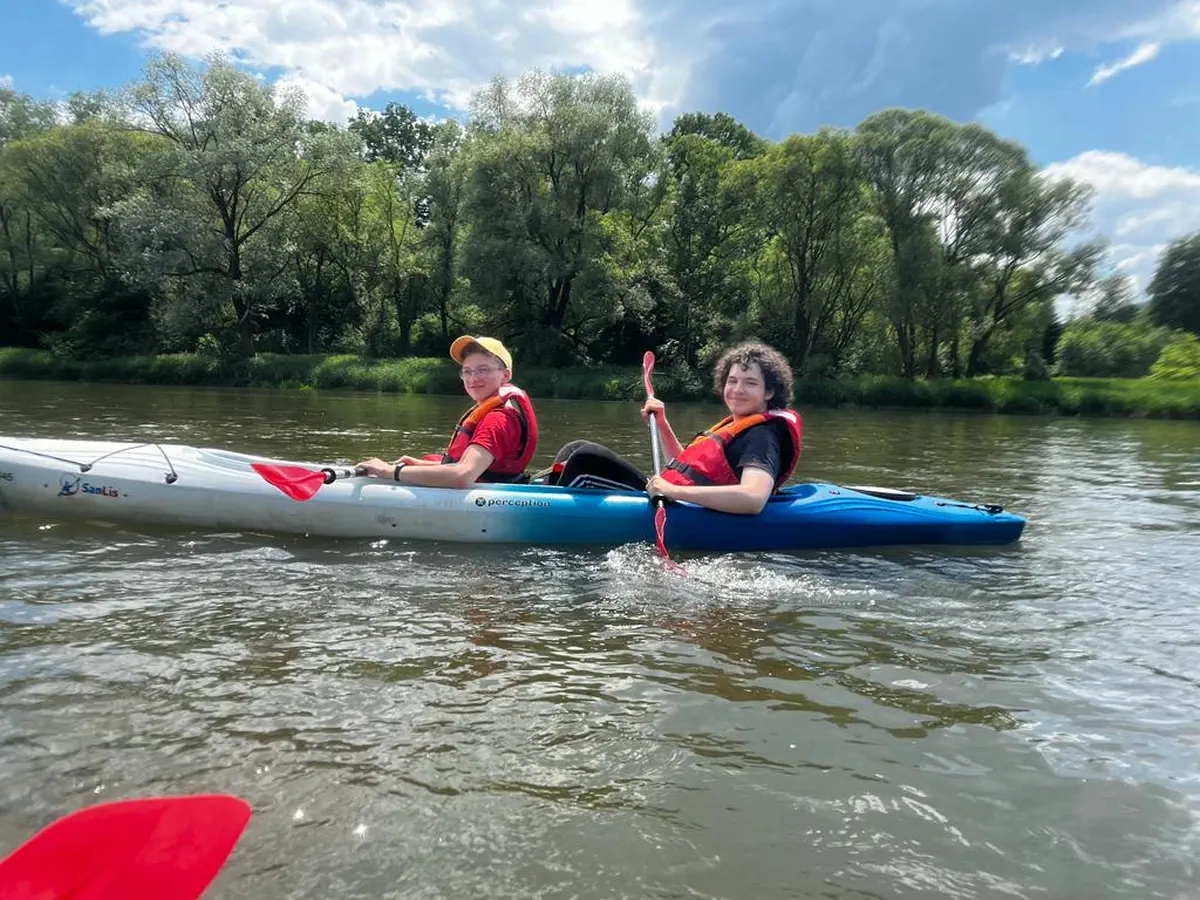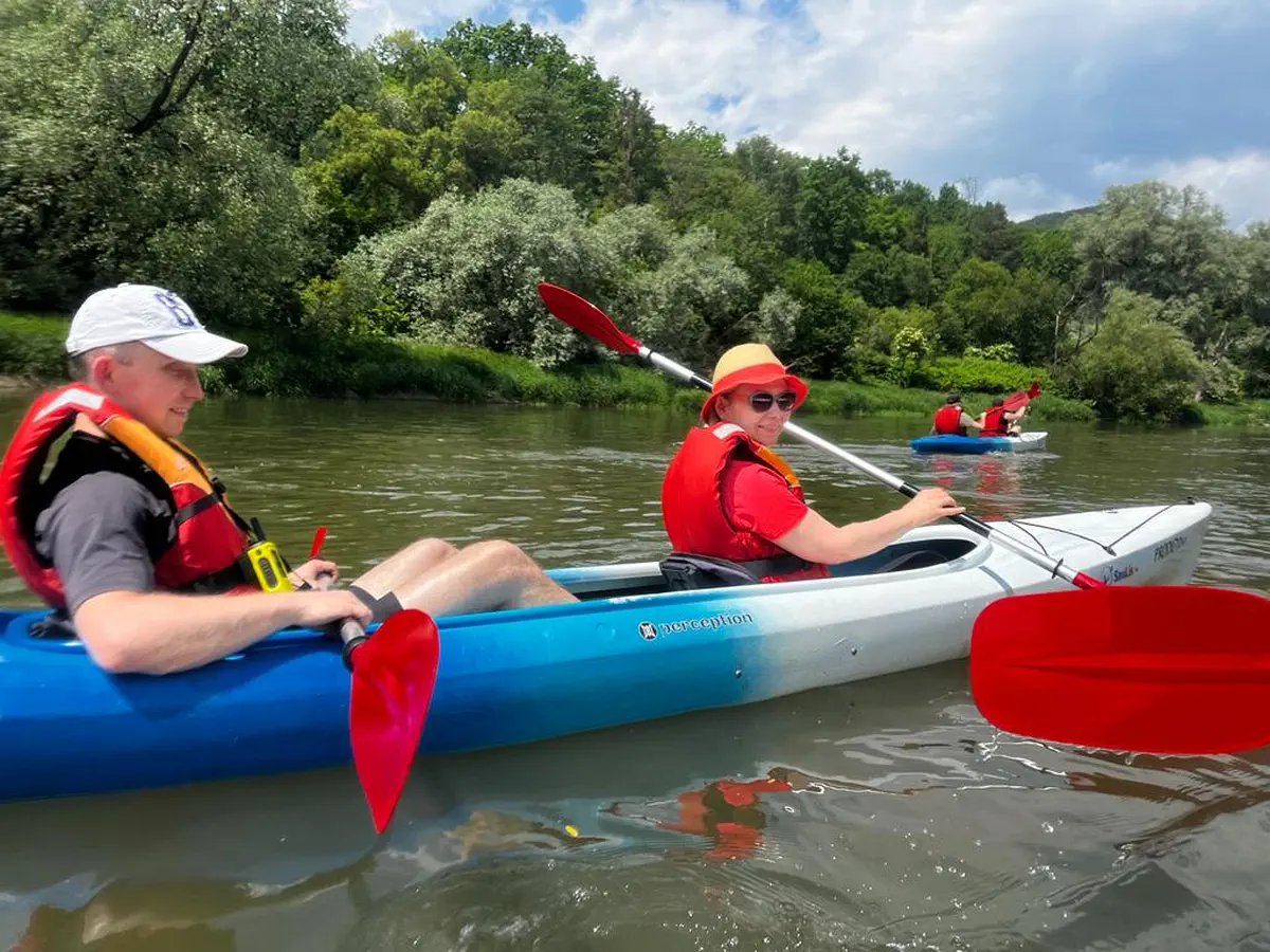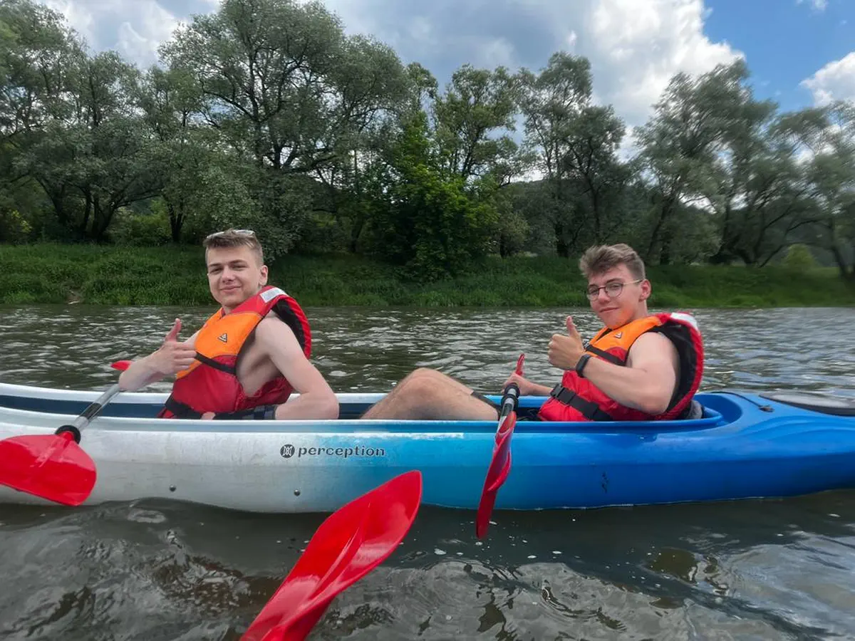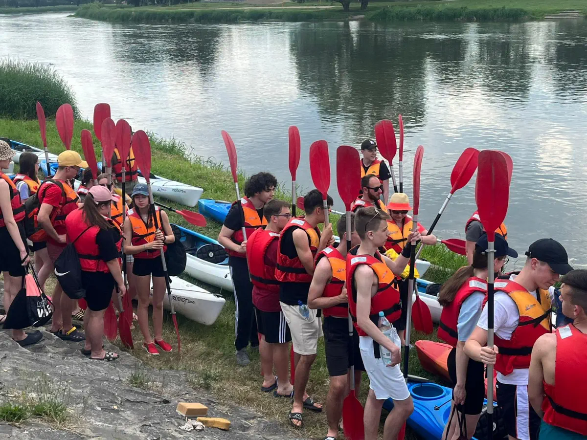 Pierwszy dzień – rozpoczął się od Sanoka – część grupy zwiedzała Starówkę, inni udali się do Muzeum Historycznego, by obejrzeć stałą ekspozycję prac Zdzisława Beksińskiego, którego Muzeum, na mocy testamentu tragicznie zmarłego artysty, jest jedynym spadkobiercą. Następnie przyszła kolej na aktywne poznawanie okolicy – taką możliwość dał wspólny, czternastokilometrowy, spływ kajakowy rzeką San. Większość próbowała na kajakach swoich sił po raz pierwszy, inni mogli wspierać debiutantów swoim doświadczeniem. Dwuosobowe kajaki nie wymagają jedynie siły fizycznej, ale przede wszystkim zgrania i synchronizacji, co dla niektórych okazało się nie lada wyzwaniem. Po spływie na wszystkich czekało przygotowane wcześniej ognisko z kiełbaskami. Wieczór upłynął na zwiedzaniu miejscowości, która była bazą noclegową grupy – Wołkowyi.