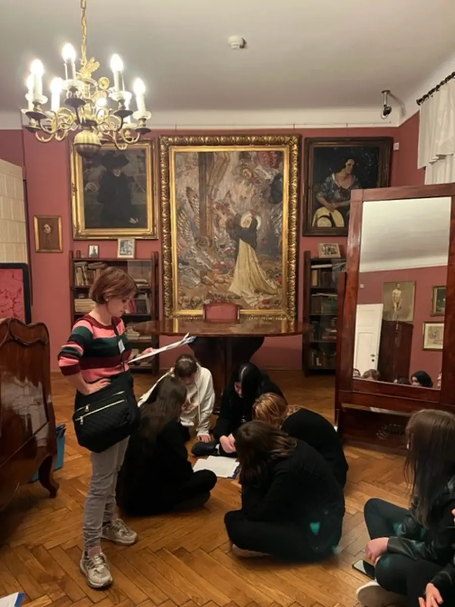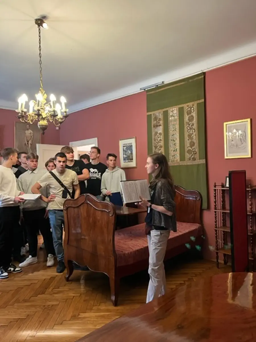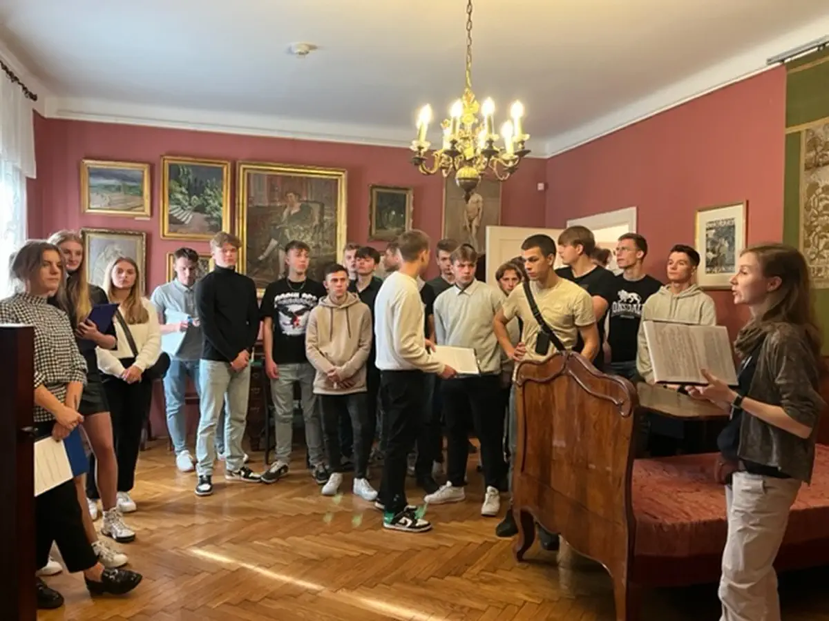 Później przyszedł czas na usystematyzowanie wiedzy na temat Wesela Stanisława Wyspiańskiego. A nie ma do tego lepszego miejsca , niż Rydlówka, czyli miejsce, w którym odbywało się słynne wesele. Tam – poza zwiedzaniem z przewodnikiem, uczniowie brali udział w lekcjach muzealnych na temat dramatu Wyspiańskiego.