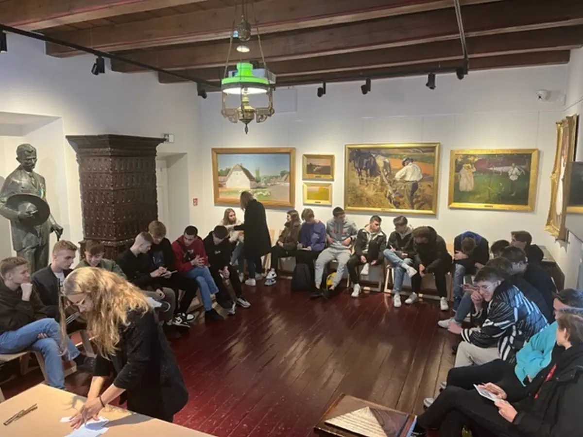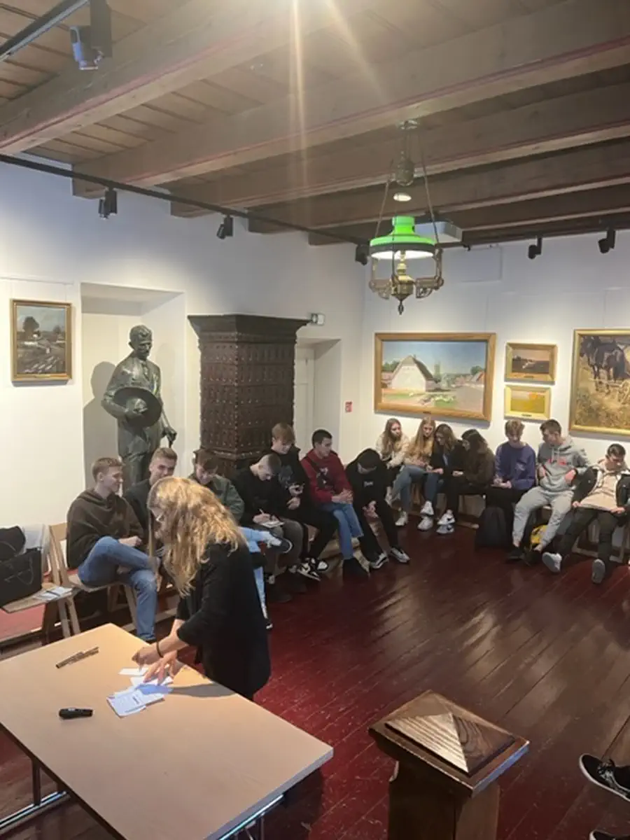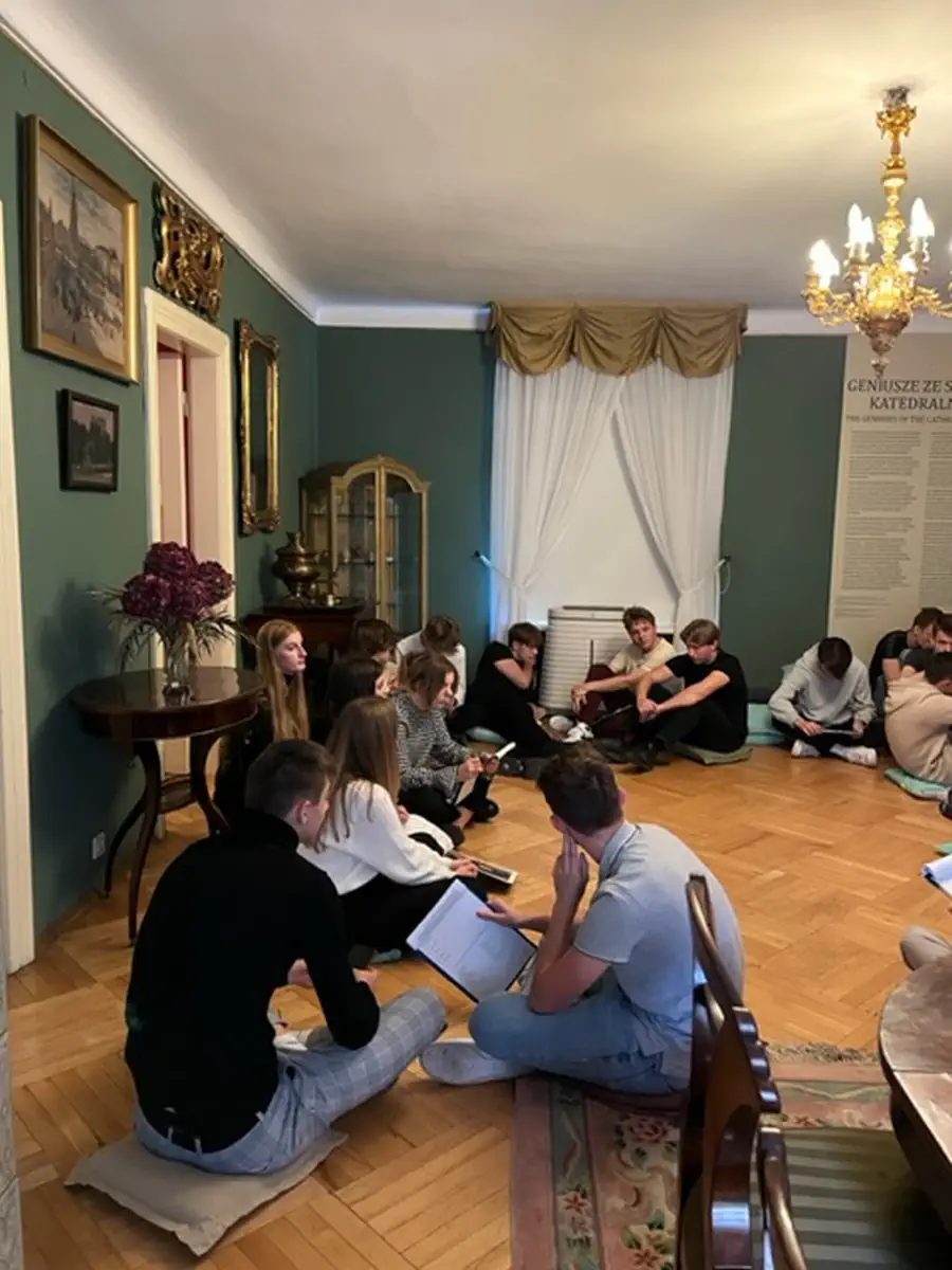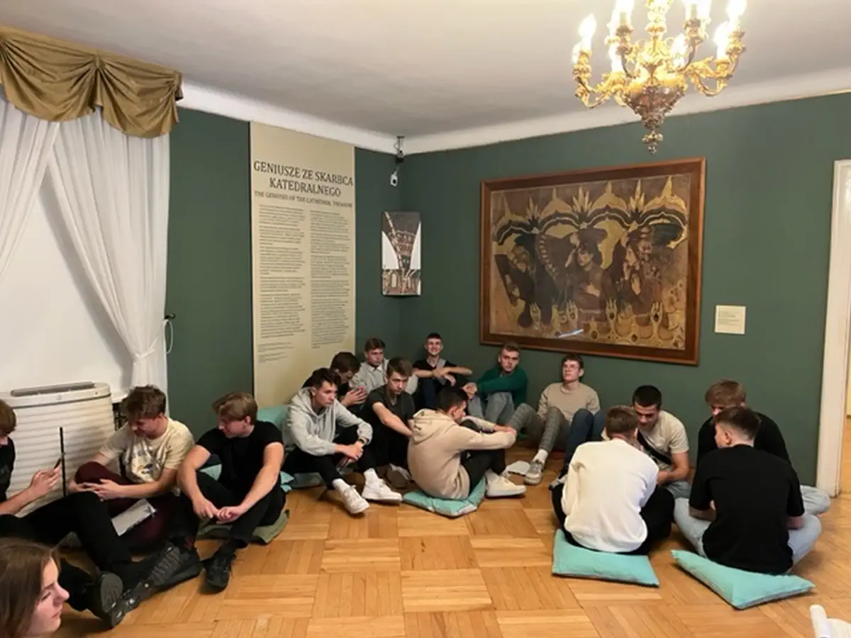 Później przyszedł czas na usystematyzowanie wiedzy na temat Wesela Stanisława Wyspiańskiego. A nie ma do tego lepszego miejsca , niż Rydlówka, czyli miejsce, w którym odbywało się słynne wesele. Tam – poza zwiedzaniem z przewodnikiem, uczniowie brali udział w lekcjach muzealnych na temat dramatu Wyspiańskiego.