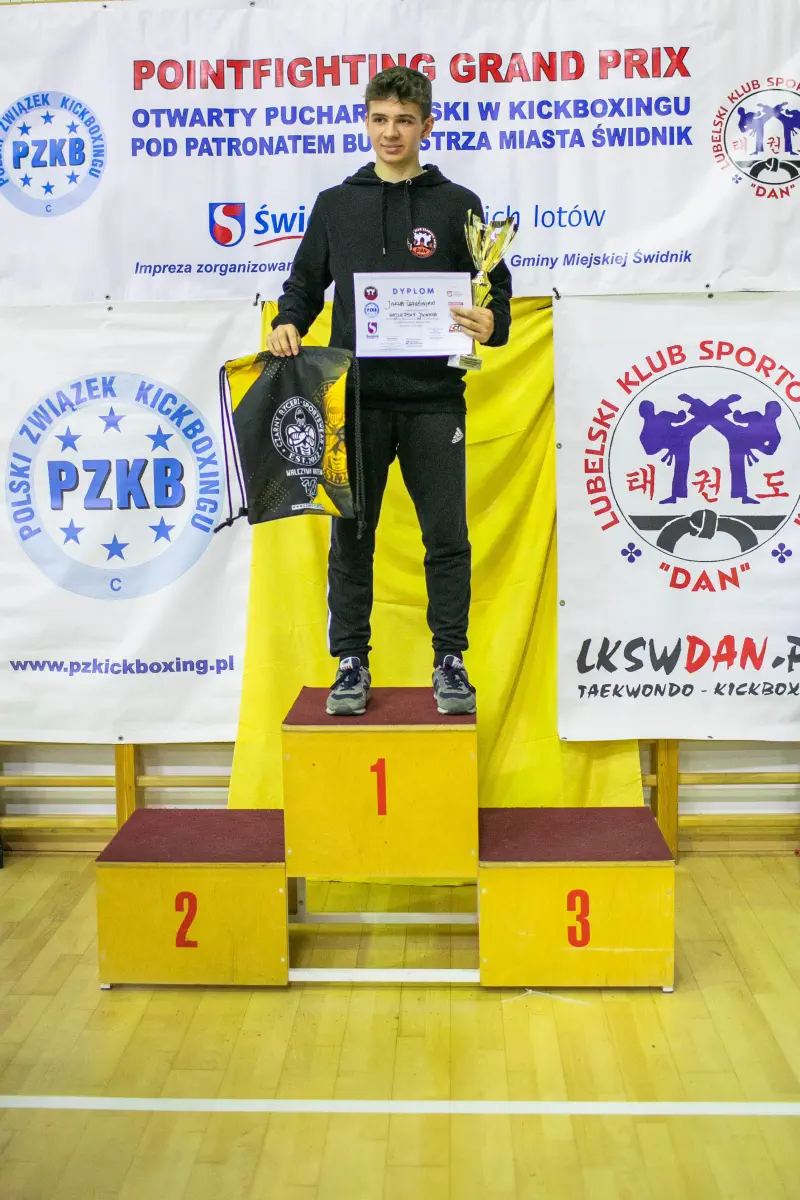 Z przyjemnością informujemy, że na rozegranym w Świdniku Pucharze Polski w kickboxingu "Pointfighting Grand Prix" uczeń klasy CyberMil Jakub Trześniak po raz kolejny nie miał sobie równych. Kuba zdobył dwa złote medale w walkach juniorów -63 kg i -69 kg, a także - puchar dla najlepszego zawodnika turnieju w kategorii juniorów.