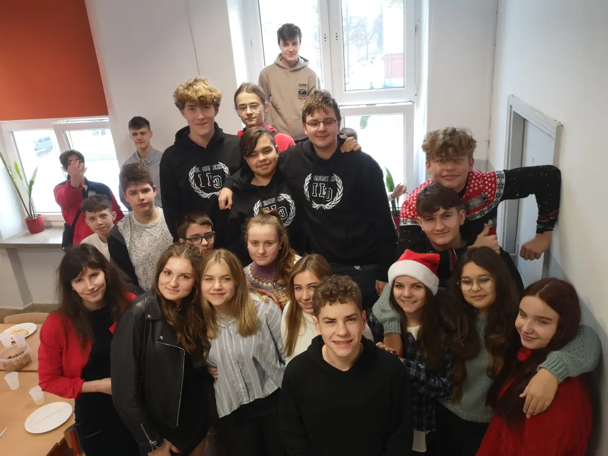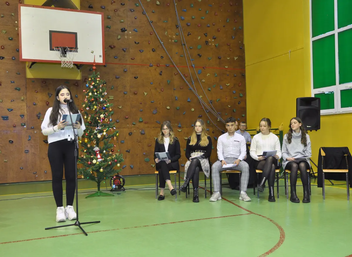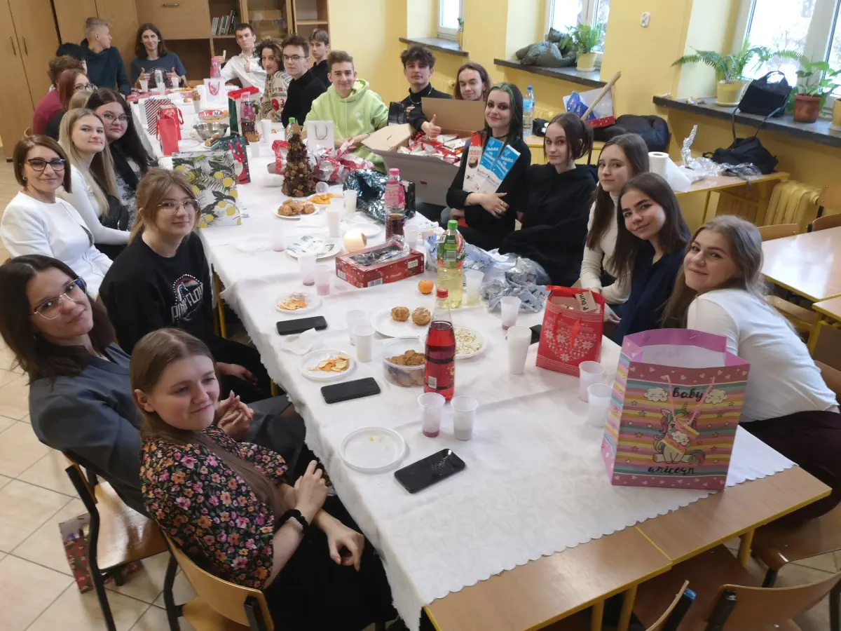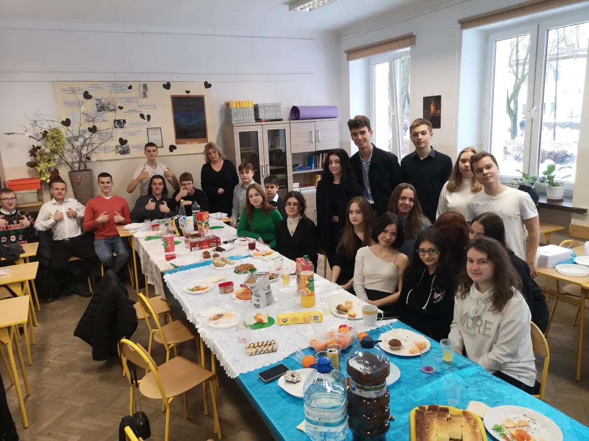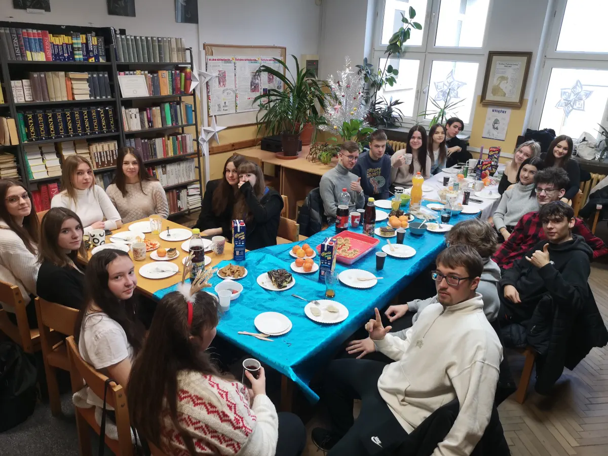 Na szkolnych stołach pojawiły się piękne obrusy, pachnące wigilią potrawy, a z sal popłynęły kolędy. W szkole zapanował ciepły, rodzinny nastrój. Po spotkaniach w klasach społeczność I Liceum zebrała się w hali, aby podzielić się opłatkiem.