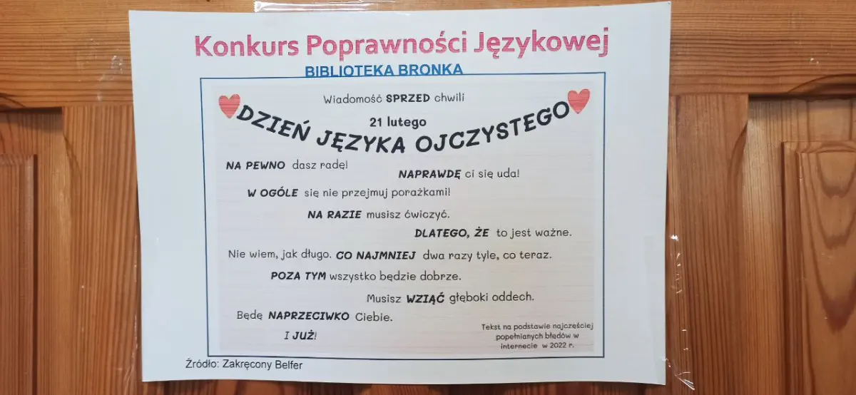 Dbając o język ojczysty i chroniąc go, dbamy o własną tożsamość narodową. Z tej okazji 22 lutego 2023 r. w bibliotece szkolnej odbył się konkurs poprawności językowej zorganizowany przez panie Annę Adamczyk i Agnieszkę Piwnicką – Jagielską Przygotowany arkusz konkursowy zawierał pytania sprawdzające umiejętności z gramatyki. Drugą część stanowiło dyktando podyktowane przez p. dyrektor Anetę Jagiełę. 24 lutego konkurs został rozstrzygnięty. Nagrody i dyplomy otrzymali zdobywcy największej ilości punktów, Ignacy Rudawski, Milena Wójcik, Mikołaj Kamiński i Szymon Kotynia. Nagrody zakupiono z NPRC 2.0.