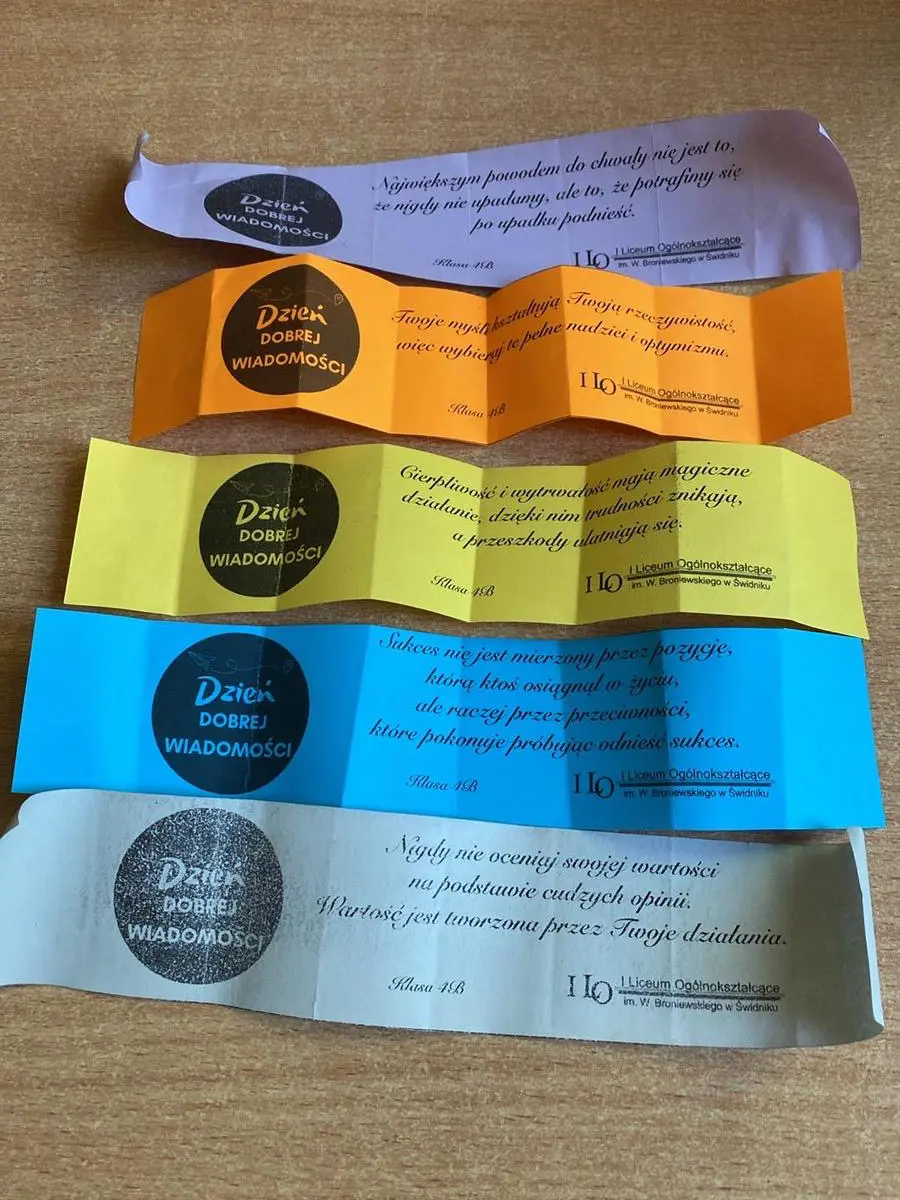 Intencją twórców tego święta było stworzenie przeciwwagi dla negatywnego obrazu świata, który jest kreowany przez współczesne mass media, tym samym przyczyniając się do zafałszowania rzeczywistości. Zainspirowani ideą twórców tego święta, uczniowie klasy 4b, stworzyli kolorowe fiszki z pozytywnymi treściami i w poniedziałek rozdawali je uczniom i pracownikom naszej szkoły, przyczyniając się do pojawiania się uśmiechów na wielu twarzach.