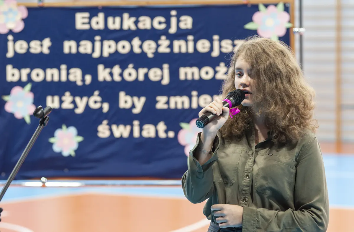 „Dziś, w dniu święta polskiej szkoły, święta uczniów, nauczycieli, pracowników obsługi i tych co szkoły prowadzą i nadzorują , pragniemy wyrazić nasze podziękowania za przekazywaną wiedzę, za trud włożony w kształtowanie naszych serc i umysłów. Swoją wdzięczność za trud włożony w nasze wychowanie , za dar nauki i cierpliwe, wspaniałe przewodnictwo na trudnej drodze zdobywania wiedzy, pragniemy wyrazić poprzez nasz program artystyczny, do obejrzenia którego serdecznie Państwa zapraszamy. Przed nami koncert ze szczególnymi dedykacjami