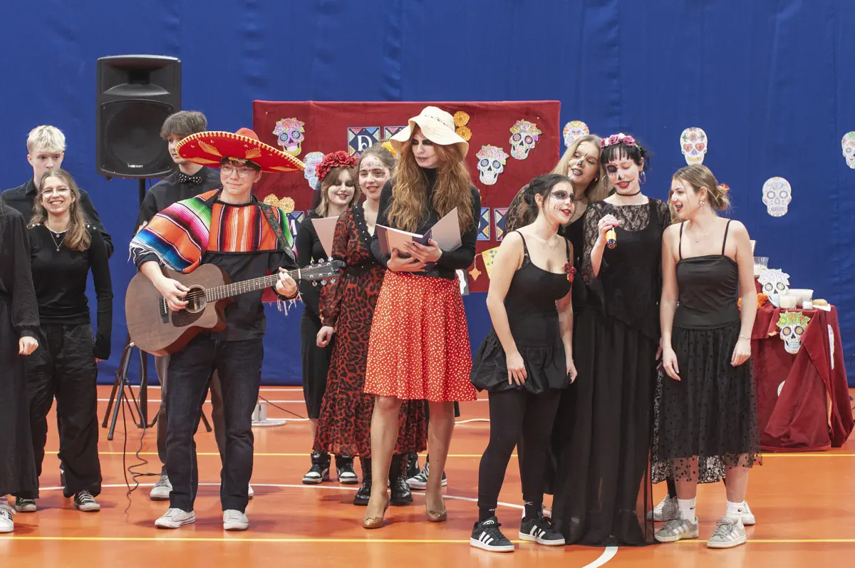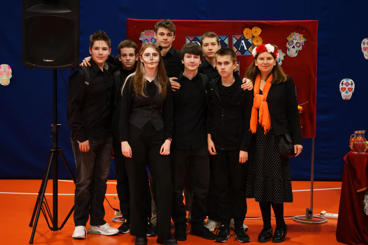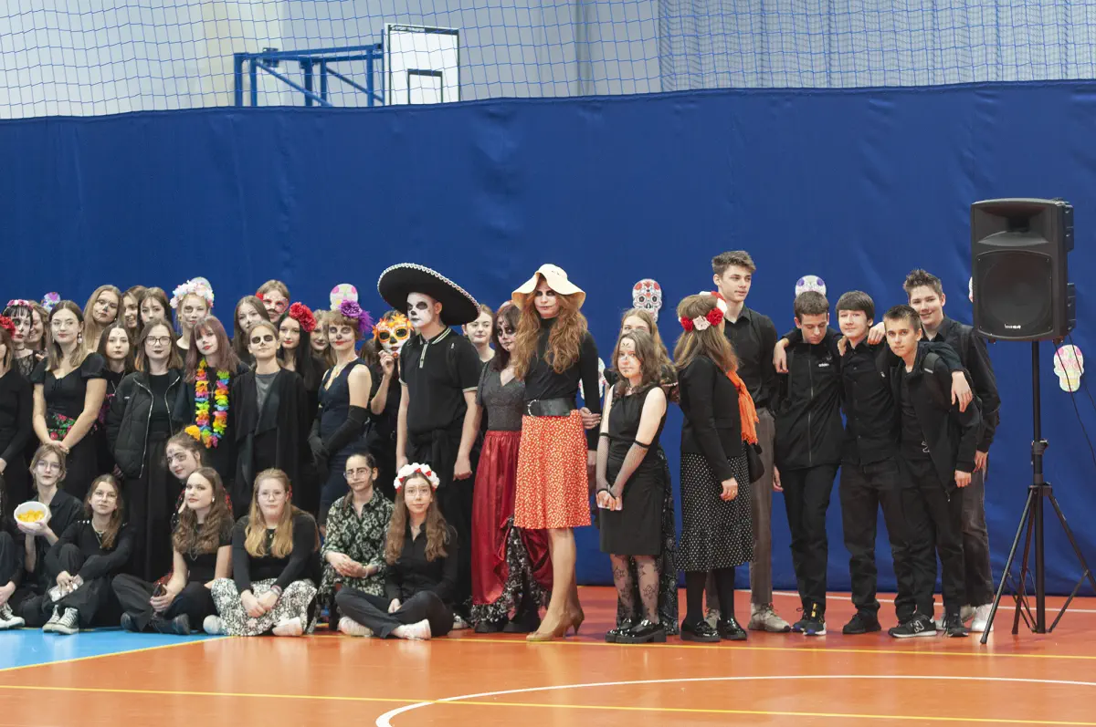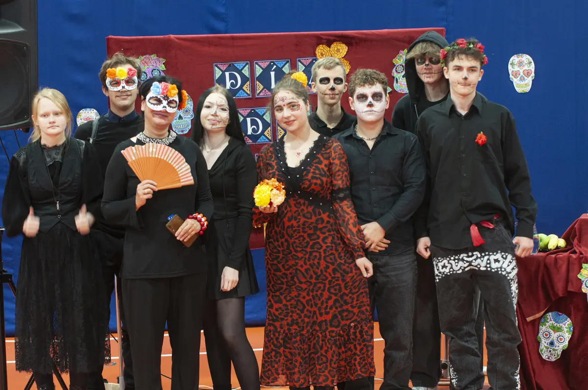 W tym magicznym dniu odbyło się niezwykłe przedstawienie, a także nie zabrakło rekwizytów nawiązujących do tego święta. Kolorowe dekoracje, ofrendas, czyli przepięknie ozdobione ołtarze, pełne kwiatów, zdjęć i ulubionych potraw naszych przodków, stały się centralnym punktem całej uroczystości. Te barwne kompozycje przypominały nam o pięknie i ulotności życia oraz o niezwykłych więziach, które łączą nas z tymi, którzy odeszli. Día de Muertos to nie tylko uczta dla oczu i uszu, ale przede wszystkim lekcja miłości, szacunku i pamięci. Dziękujemy wszystkim uczniom oraz nauczycielom za ich zaangażowanie. Dzięki Wam mogliśmy doświadczyć prawdziwej magii meksykańskiej kultury. W sposób szczególny dziękujemy organizatorkom tego językowego i kulturowego projektu, paniom Z. Grzegorczyk i M. Stępień