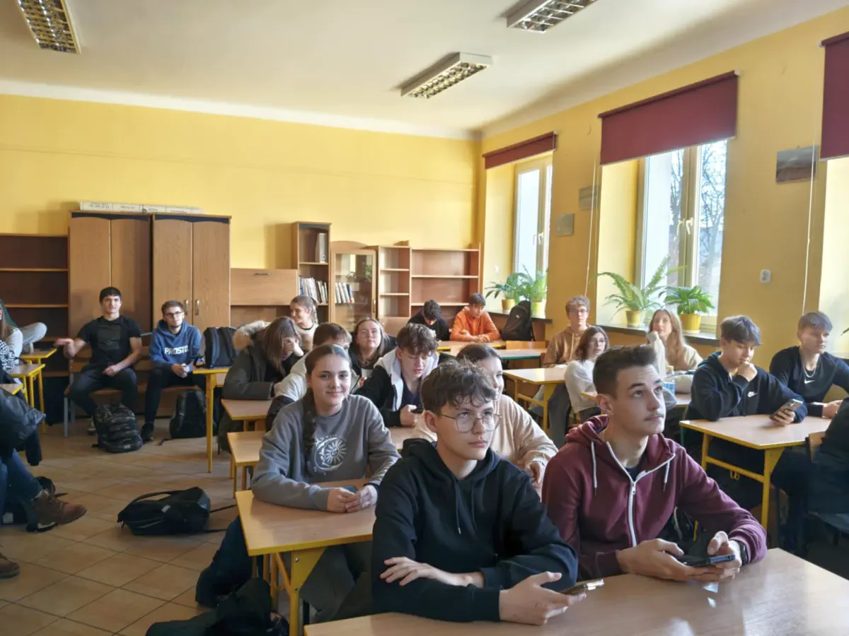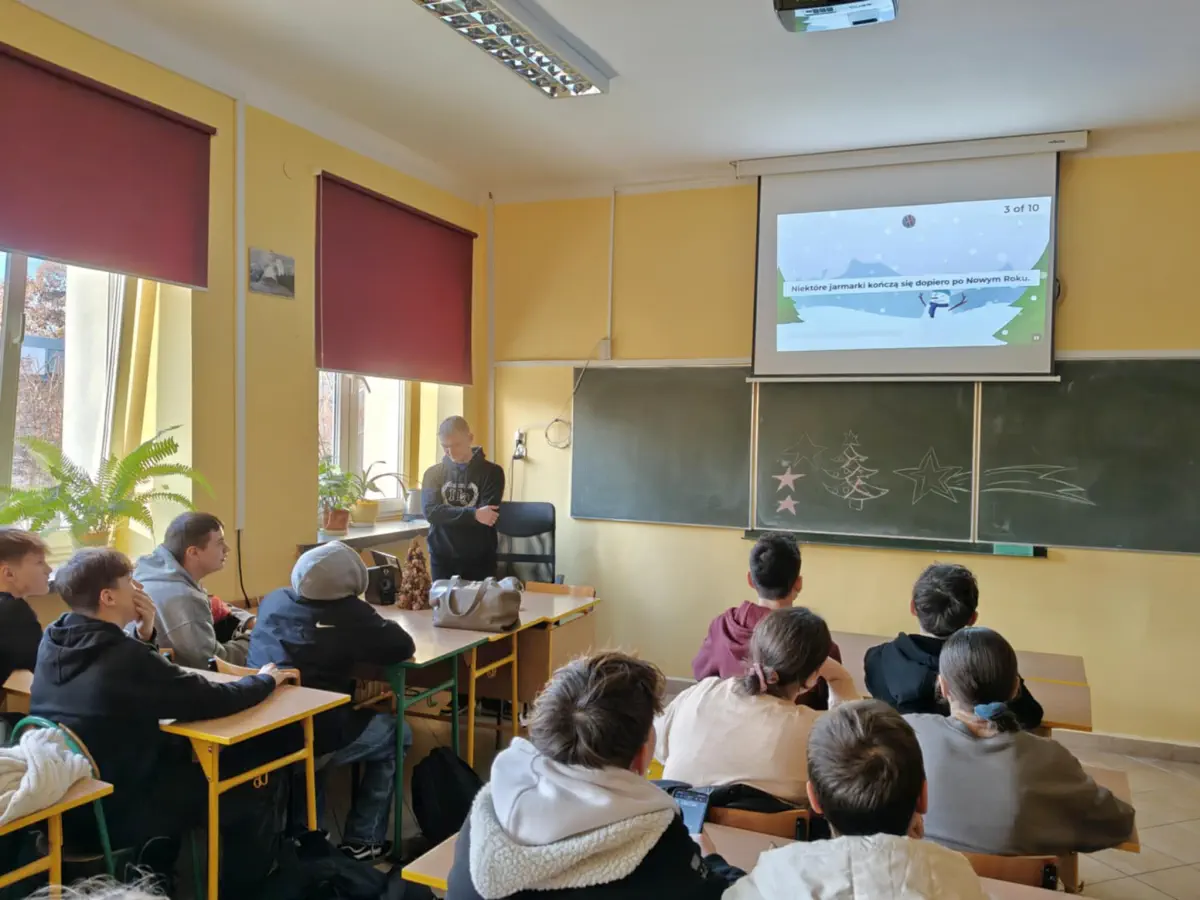 Pod koniec drugiego dnia jarmarku licealiści gościli w szkole uczniów klasy 8c ze Szkoły Podstawowej nr 3. Młodsi koledzy wzięli udział w warsztatach językowych na temat historii jarmarków.
