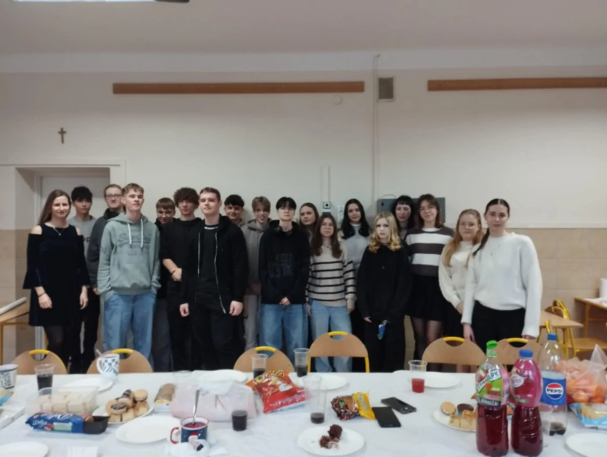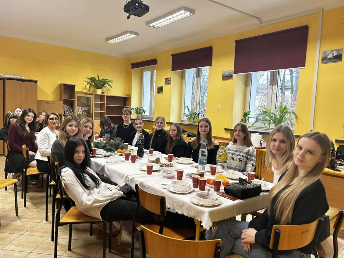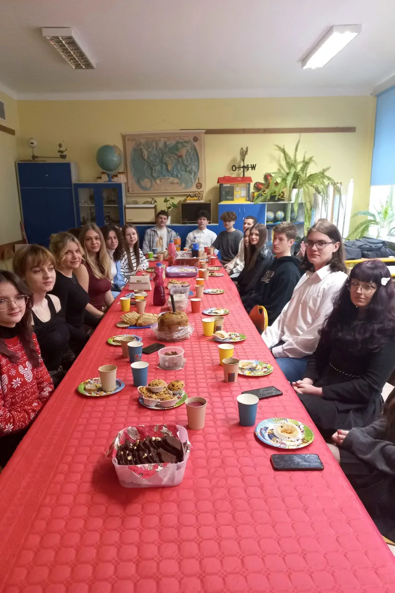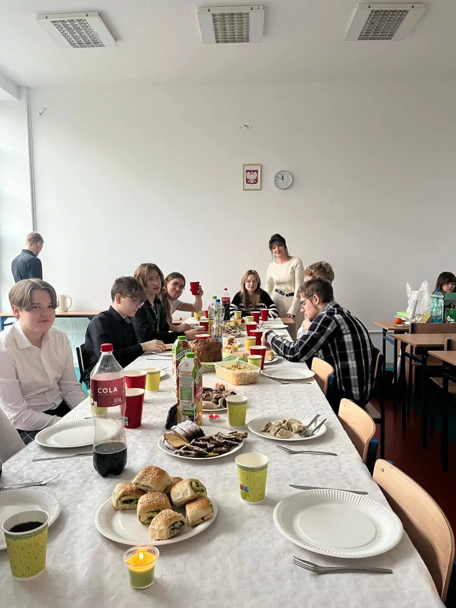 20 grudnia. Dzień pełen ciepłych życzeń i rodzinnej atmosfery. Klasowe wigilie zgromadziły uczniów i wychowawców wokół świątecznych stołów a potem wokół opłatka na hali. Uroczystą wigilię przygotował wraz z młodzieżą p. Artur Nyszko.