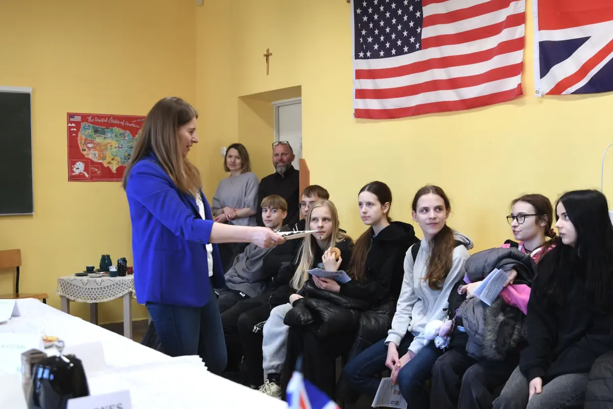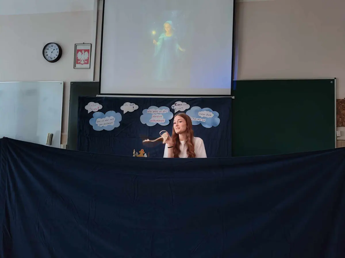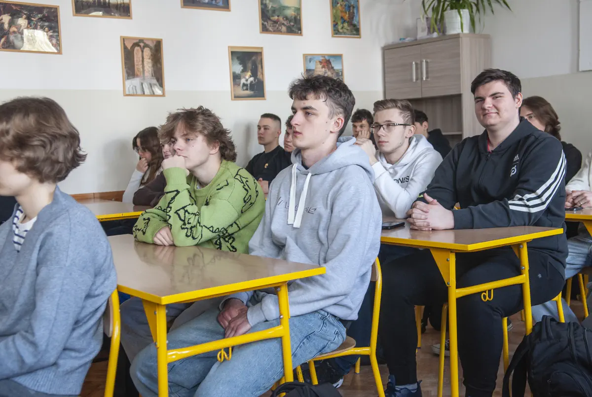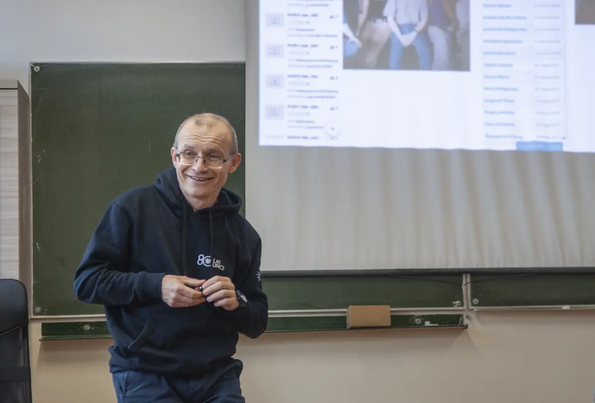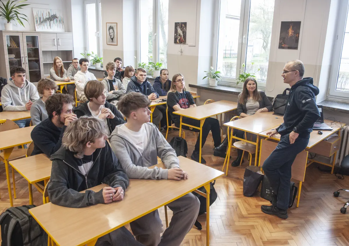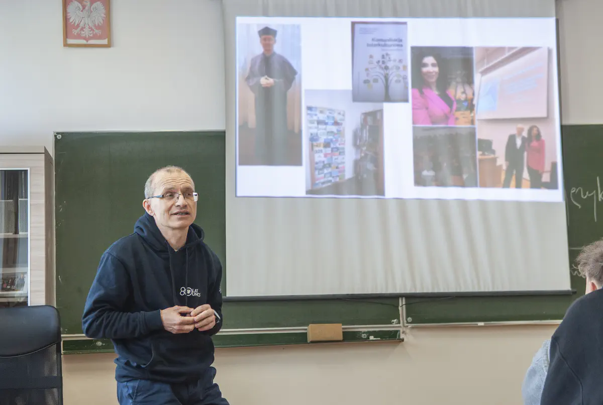 Drugiego dnia szkołę, na zaproszenie p. P. Abramowicza, odwiedził jej były nauczyciel, dziś profesor Katedry Lingwistyki Stosowanej UMCS p. Jarosław Krajka. Uczniowie wysłuchali wykładu na temat tłumaczeń. Gość licealistów w bardzo ciekawy sposób zagłębiał się w rolę sztucznej inteligencji w przekładzie, poruszał rolę tłumacza, a także kontekstu kulturowego w procesie tłumaczenia.