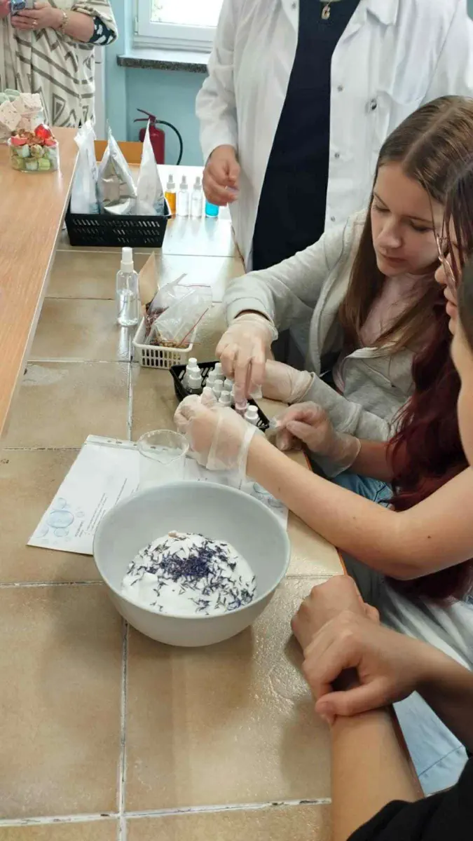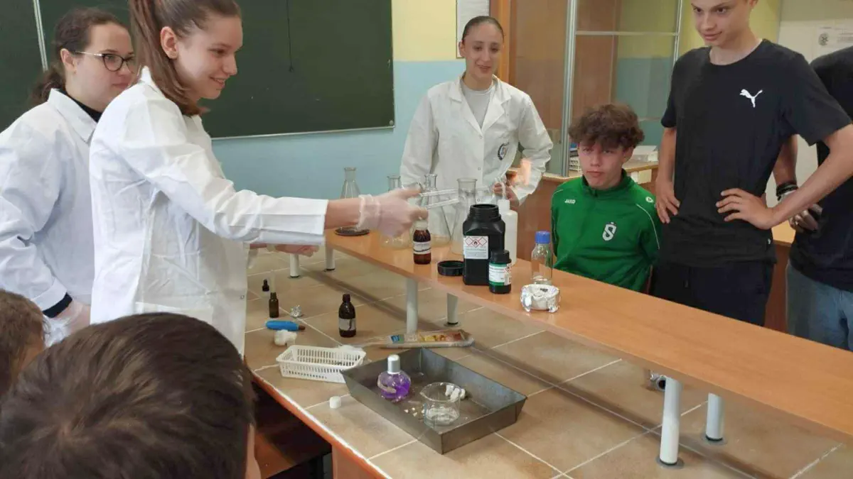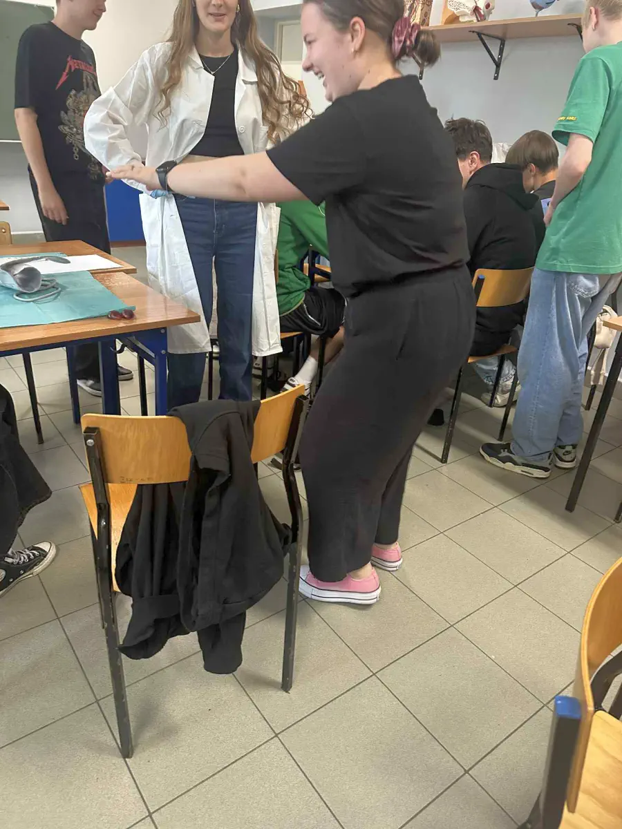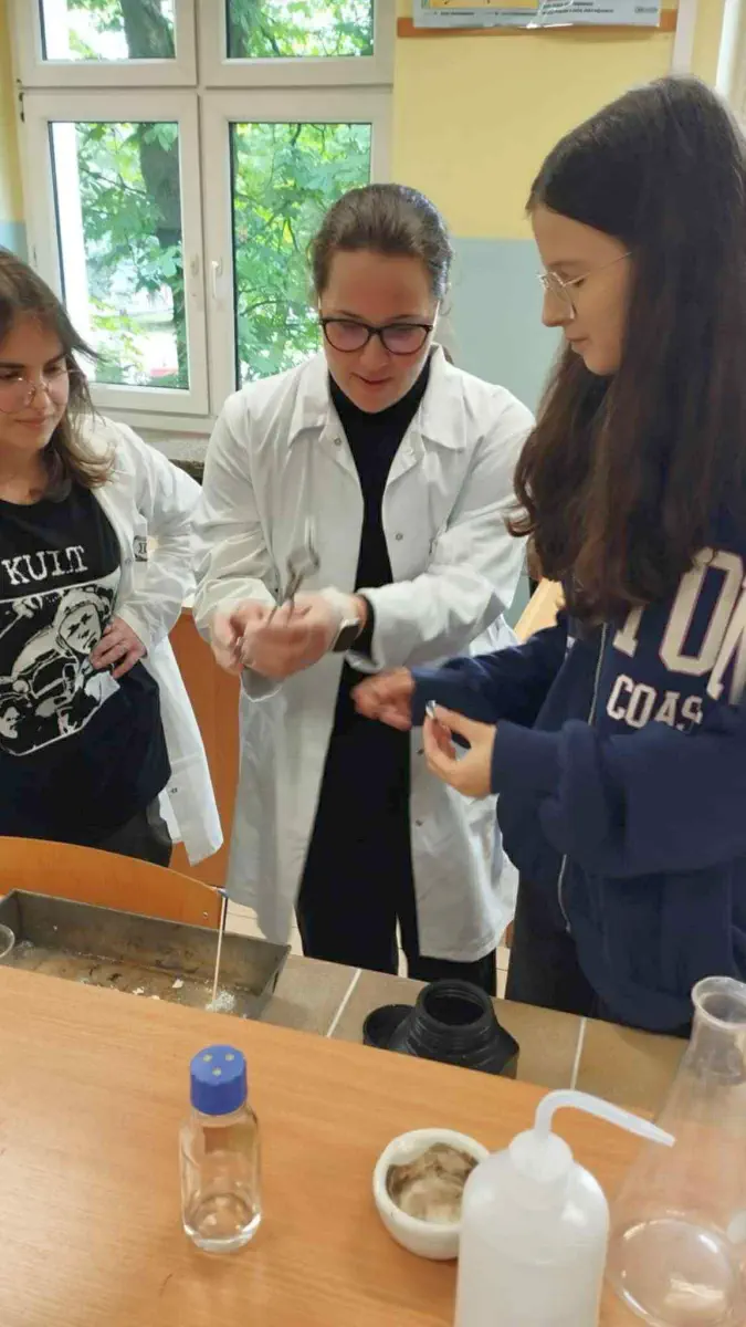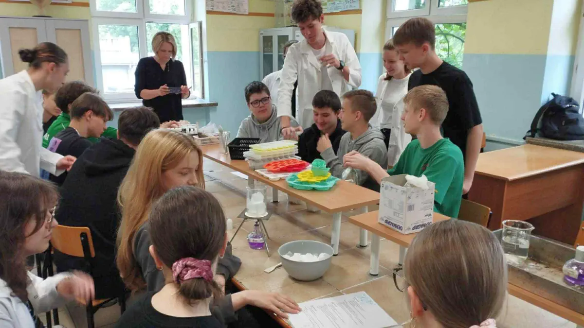 Na warsztatach biologicznych uczniowie mierzyli ciśnienie krwi w stanie spoczynku i po wysiłku, a następnie analizowali zachodzące w ich organizmie zmiany. Dowiedzieli się , jakie wartości tego parametru powinny budzić nasze zaniepokojenie. Następnym ciekawym doświadczeniem było wykonywanie prostego , pojedynczego szwu chirurgicznego. Każdy mógł sam chwilę poczuć się jak chirurg. Zajęcia z chemii były z kolei kolorowe i wybuchowe. Uczniowie samodzielnie otrzymywali mydła i kule do kąpieli. Wykonywali reakcje strąceniowe i próby w płomieniach, dzięki czemu dowiedzieli się jakie substancje odpowiadają za kolory fajerwerków. Nie obyło się bez efektów specjalnych- pojawił się duch w kolbie, była pochodnia bez ognia i lokomotywa.