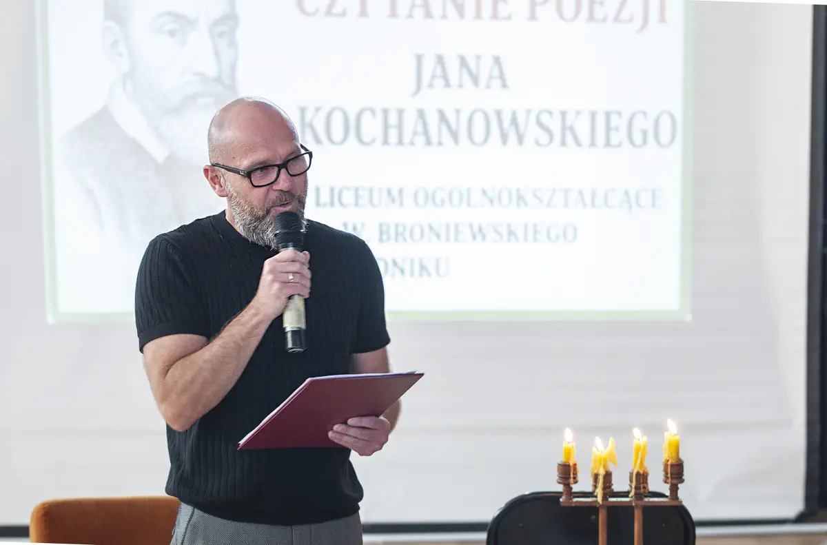 Z tej okazji dyrektor p. T. Król, wychowawcy p. M. Noskowicz, p. R. Gierszon, p. E. Derek i p. A. Kuna oraz nauczyciel bibliotekarz p. A. Adamczyk przeczytali wybrane pieśni, fraszki i treny poety z Czarnolasu. Odbiorcami akcji byli uczniowie klas pierwszych, którzy w tym roku szkolnym będą realizować lekcje na temat poezji renesansowego twórcy. Wyborem tekstów zajęła się p. Aneta Jagieła. Na hali sportowej wybrzmiały ponadczasowe frazy, a wśród nich między innymi: „Przełożonych występki miasta zgubiły/ I szerokie do gruntu carstwa zniszczyły” (Pieśń XIV), „Jakie ludzkie głupie sprawy:/ Szukać śmierci przez bój krwawy!” (Pieśń Panny X), „Ślachetne zdrowie,/Nikt się nie dowie,/Jako smakujesz,/Aż się zepsujesz” (fraszka Na zdrowie), „Panie, to moja praca, a zdarzenie Twoje;/ Raczyż błogosławieństwo dać do końca swoje!” (fraszka Na dom w Czarnolesie). Świetna lekcja literatury stała się okazją do chwili wyciszenia, skupienia i integracji uczniów klas pierwszych.