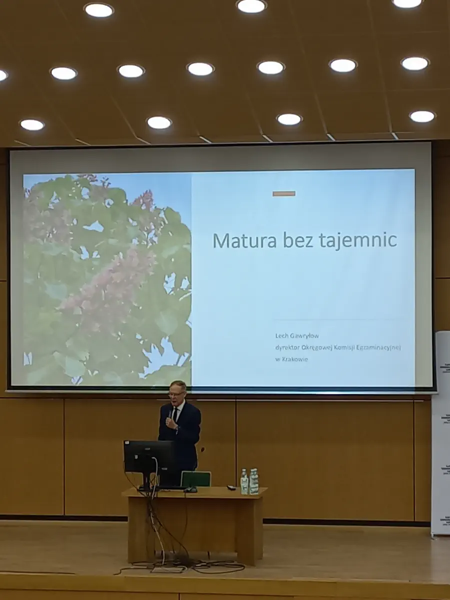 Nasi maturzyści rozpoczęli od wysłuchania wykładu "Matematyka nie polega na liczbach, równaniach, obliczeniach ani algorytmach: polega na rozumieniu". Prowadzącym był Piotr Ludwikowski - Ekspert Okręgowej Komisji Egzaminacyjnej w Krakowie. Wykład inauguracyjny "Matura bez tajemnic" poprowadził Lech Gawryłow - Dyrektor OKE w Krakowie. O egzaminie maturalnym z języka polskiego na poziomie podstawowym i rozszerzonym opowiedziała Ekspert OKE w Krakowie Teresa Bulska-Leśniak.