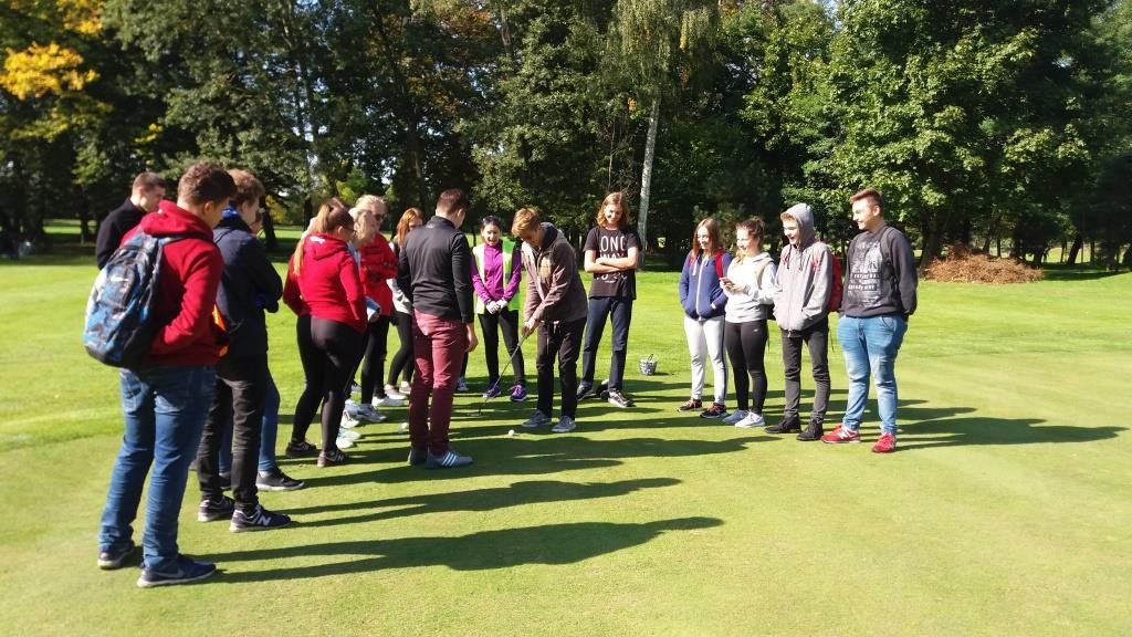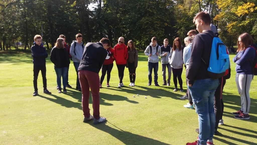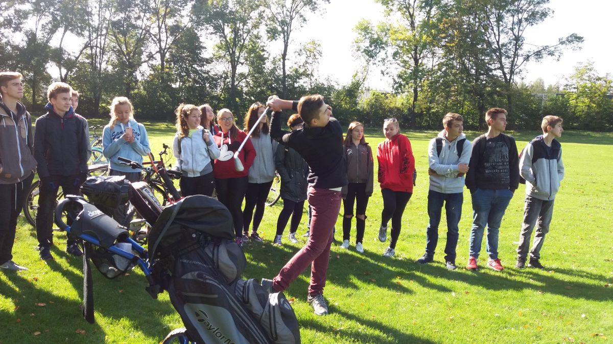 Ostatnim punktem programu była lekcja gry w golfa. Kuba Hałgas, golfista z kl.1c, zaprezentował swoim koleżankom i kolegom sprzęt golfowy oraz zasady gry. Młodzież dowiedziała się, co to jest tee, green, par, putting, driver czy grip. Miała również możliwość spróbowania swoich sił w tej grze. Niektórym udało się nawet wbić piłkę do dołka.