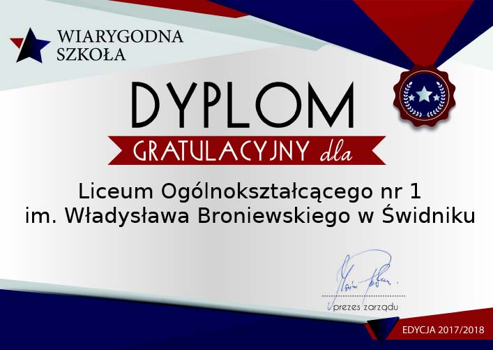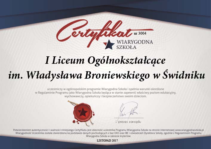 Szanowni Państwo mamy ogromną przyjemność poinformować, że I LO zdobyło po raz drugi certyfikat Wiarygodnej Szkoły.