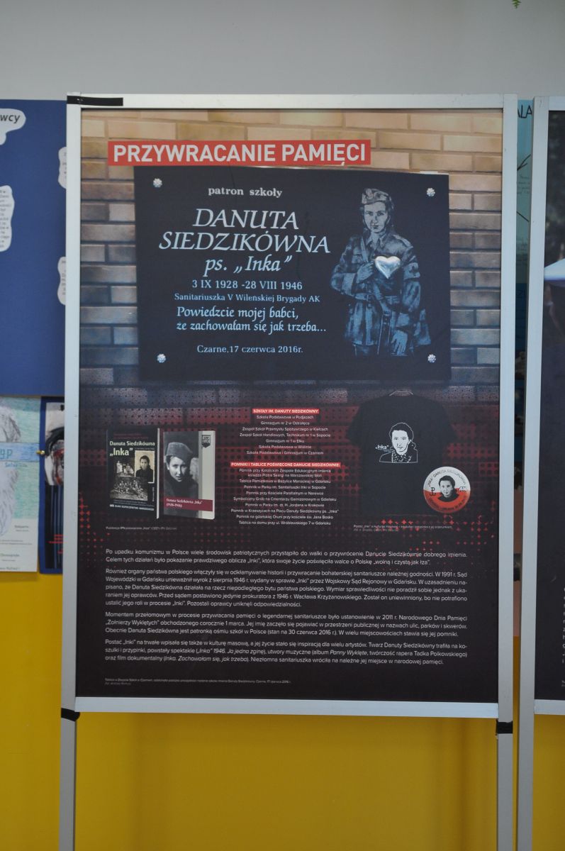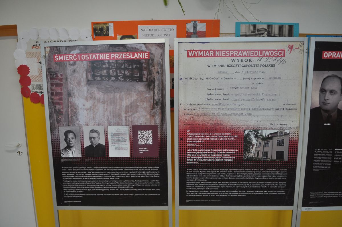 Kolejne tablice przedstawiają jej korzenie rodzinne, dzieciństwo, działalność patriotyczną, historię procesu sądowego i skazania na karę śmierci w wieku 18 lat. Dziękujemy za zorganizowanie wystawy p. A. Adamczyk.