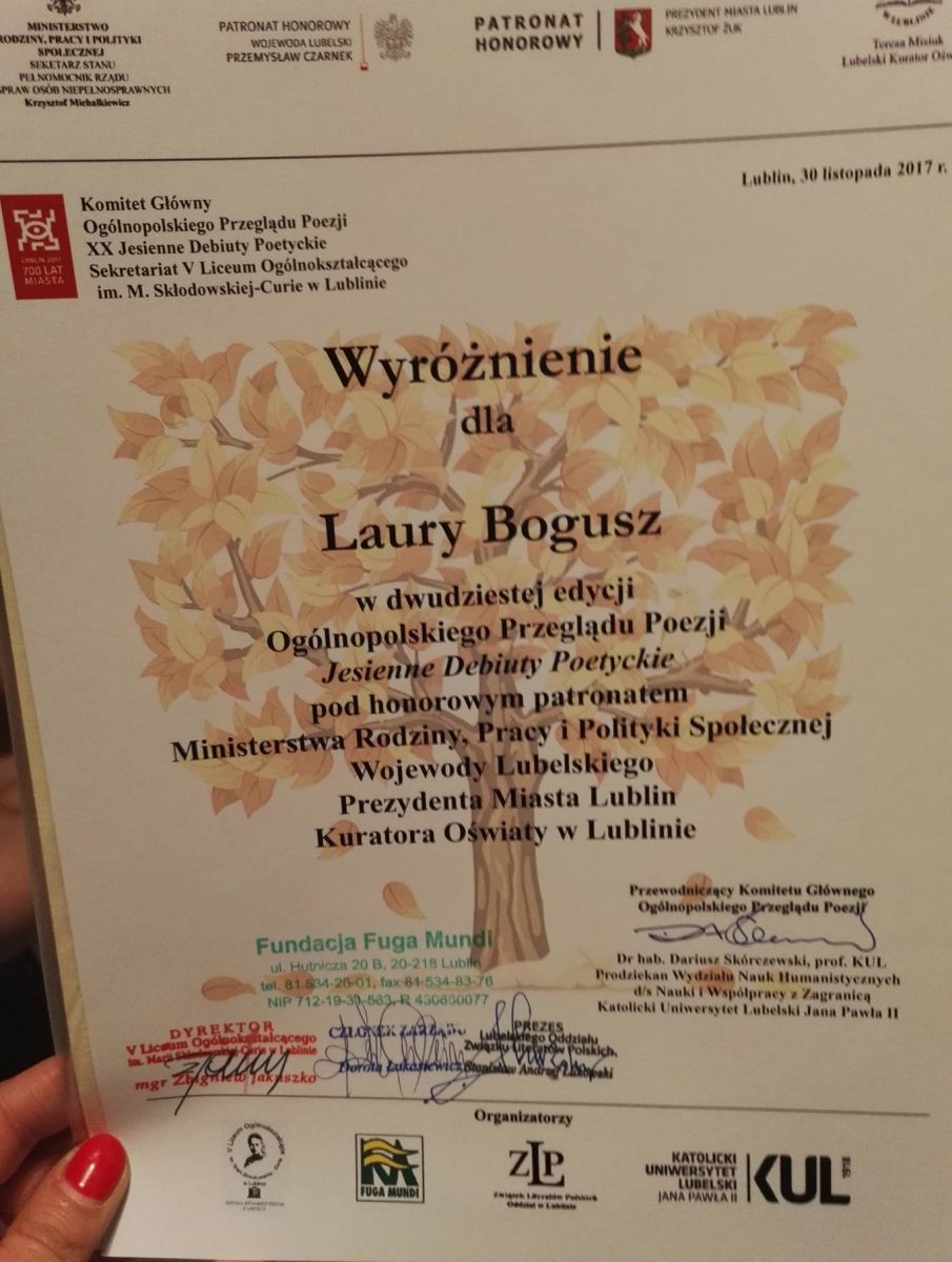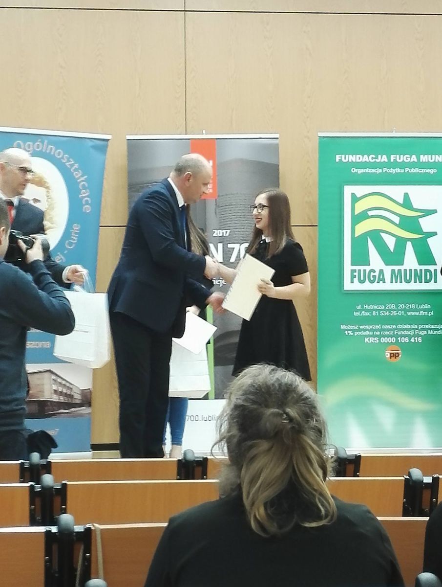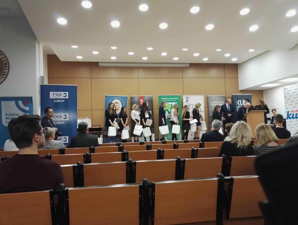 Sześciu laureatów przeglądu otrzymało indeksy na wybrany przez siebie kierunek na Wydziale Nauk Humanistycznych Katolickiego Uniwersytetu Lubelskiego Jana Pawła II. Nagrody wręczyli dziekan Wydziału Humanistycznego, dr hab. Dariusz Skórczewski i wojewoda Czarnek. Wśród wyróżnionych znalazła się uczennica klasy humanistycznej Laura Bogusz za wiersz "Dobra Wróżka".
