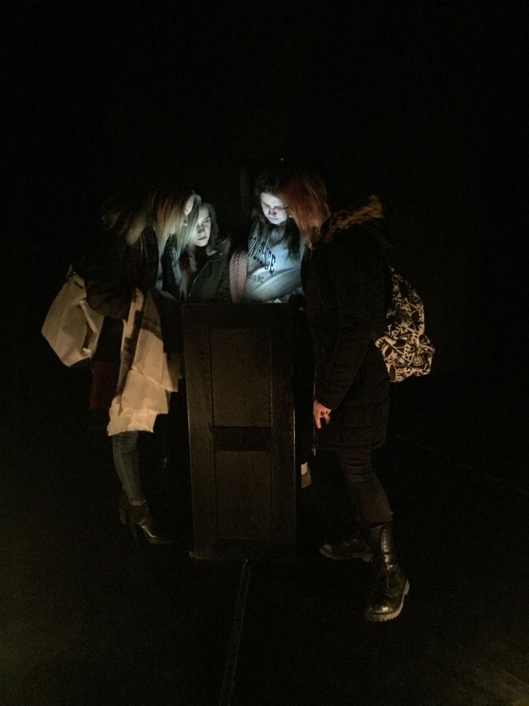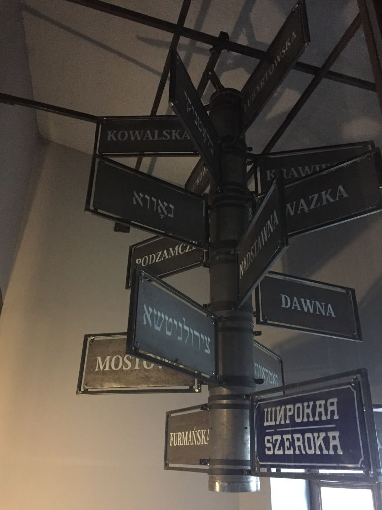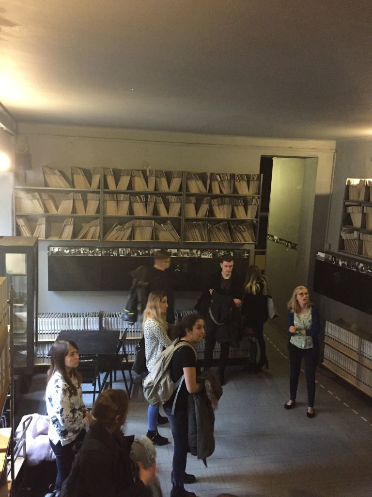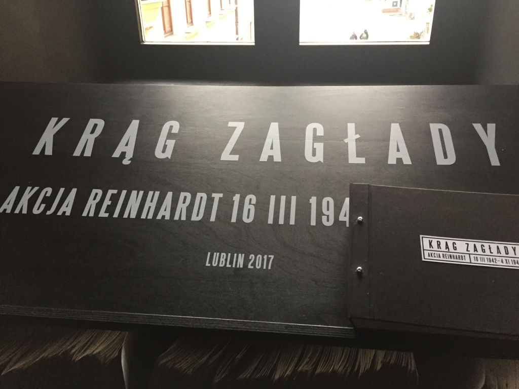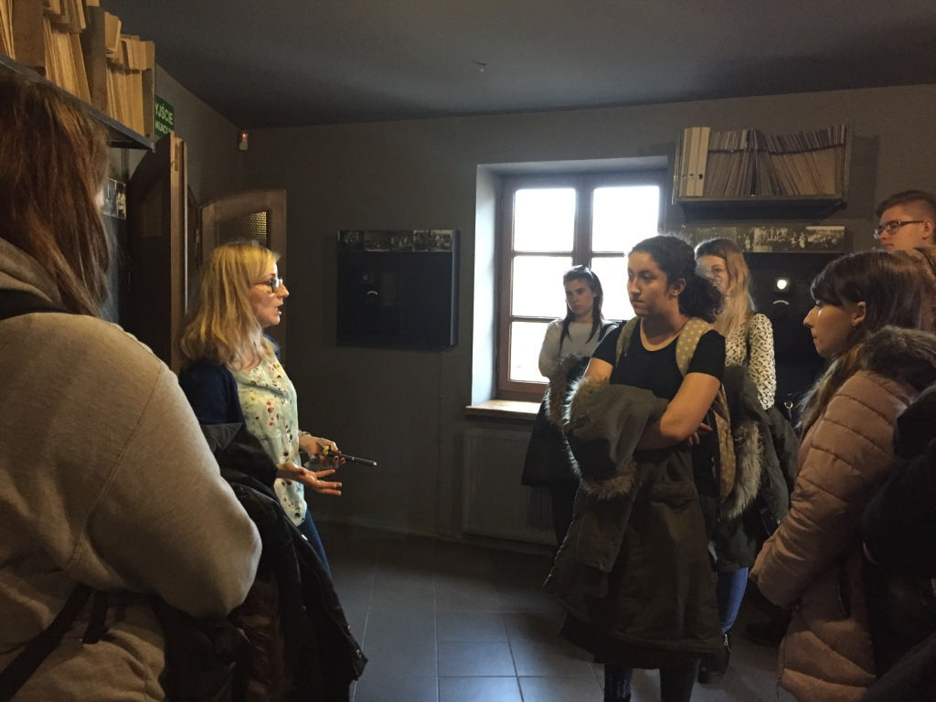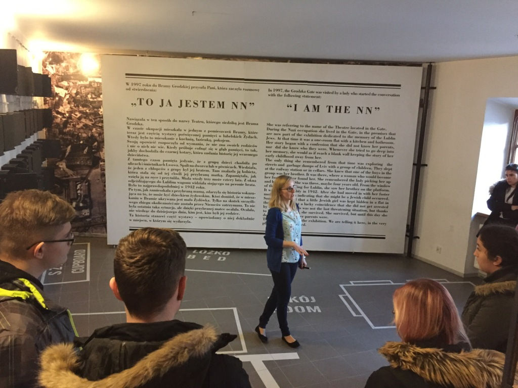 Pierwsza część spotkania, które prowadziła p. Iza Czumak, obejmowała zwiedzanie wystawy „Lublin. Pamięć Miejsca”, poświęconej wielokulturowemu, przedwojennemu Lublinowi. Wystawa została zbudowana jak wnętrze archiwum. Przechodząc przez wystawę, oglądaliśmy setki zdjęć, słuchaliśmy wykreowanych dźwięków przedwojennego miasta. Jednocześnie, w ułożonych na półkach segregatorach, mogliśmy zapoznać się z informacjami o konkretnych domach i ulicach. Druga część wystawy jest poświęcona pamięci o zagładzie społeczności żydowskiej w Lublinie. Jest to też opowieść o Sprawiedliwych – tych, którzy ratowali Żydów. Ma ona formę instalacji artystycznej.