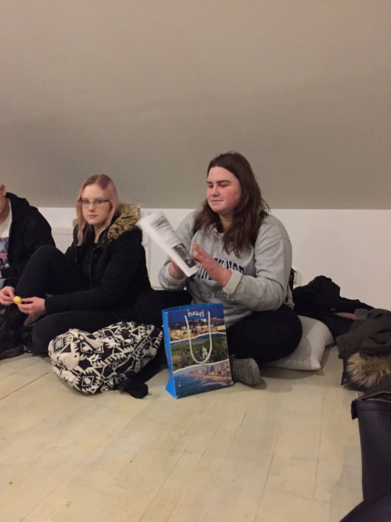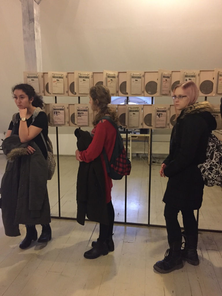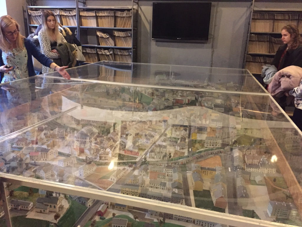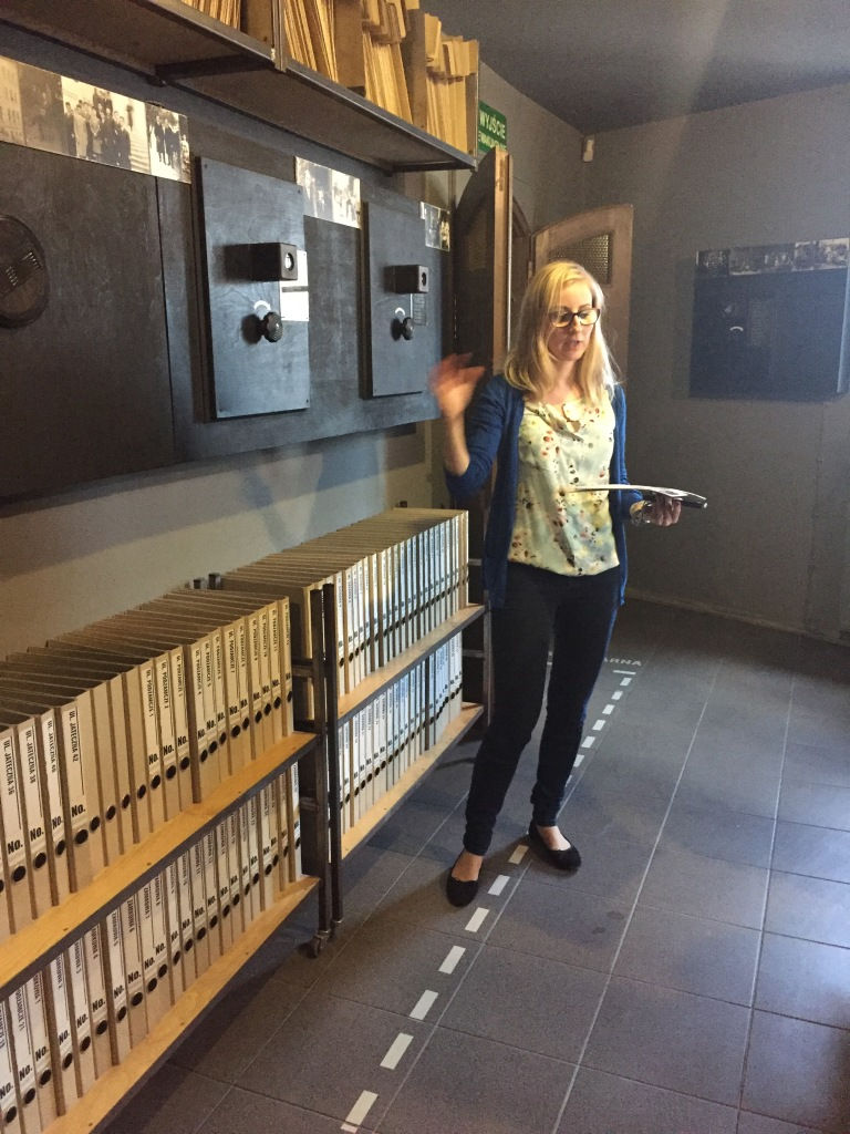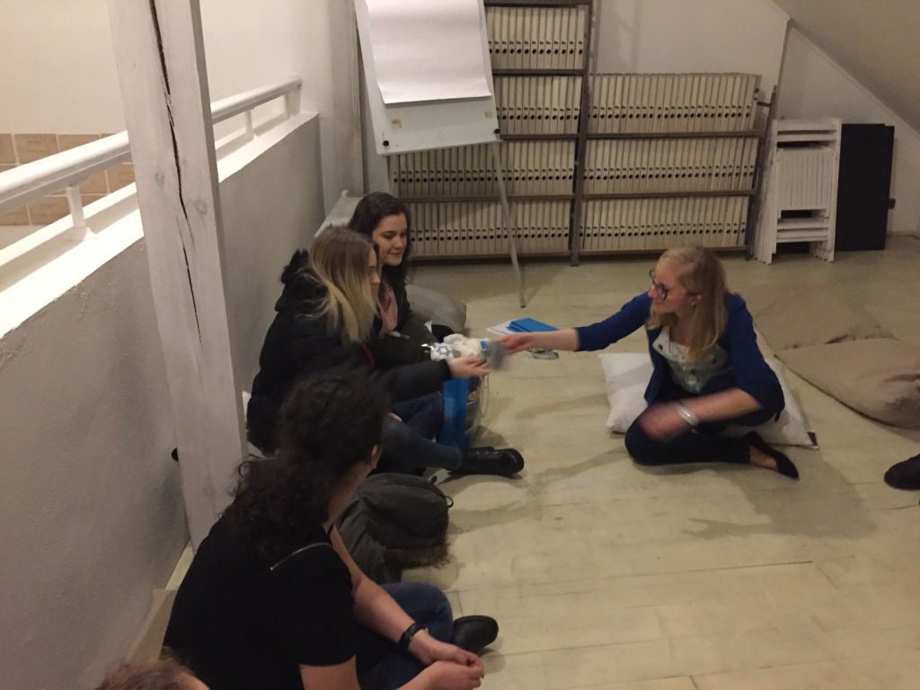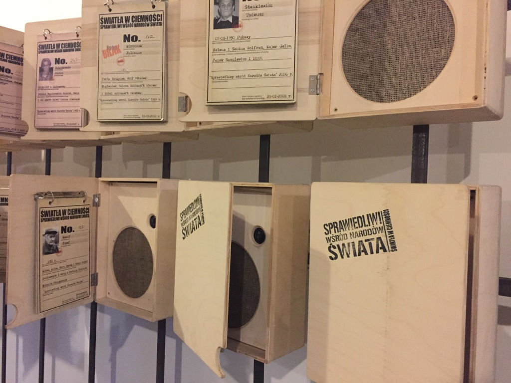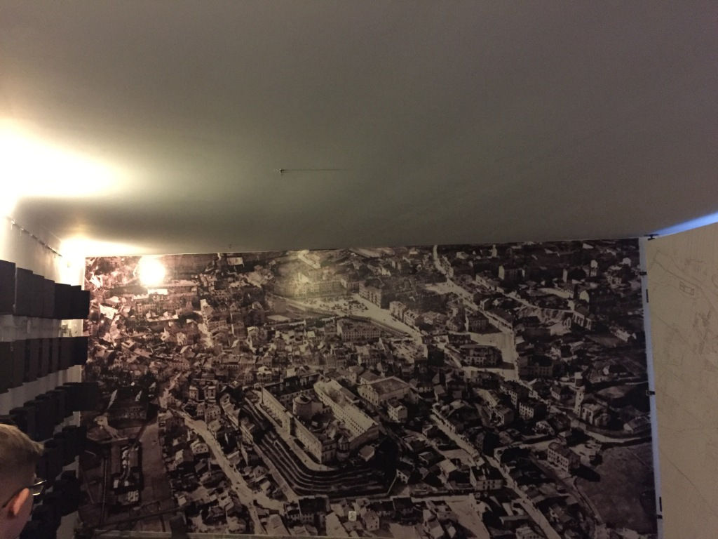 Pierwsza część spotkania, które prowadziła p. Iza Czumak, obejmowała zwiedzanie wystawy „Lublin. Pamięć Miejsca”, poświęconej wielokulturowemu, przedwojennemu Lublinowi. Wystawa została zbudowana jak wnętrze archiwum. Przechodząc przez wystawę, oglądaliśmy setki zdjęć, słuchaliśmy wykreowanych dźwięków przedwojennego miasta. Jednocześnie, w ułożonych na półkach segregatorach, mogliśmy zapoznać się z informacjami o konkretnych domach i ulicach. Druga część wystawy jest poświęcona pamięci o zagładzie społeczności żydowskiej w Lublinie. Jest to też opowieść o Sprawiedliwych – tych, którzy ratowali Żydów. Ma ona formę instalacji artystycznej.