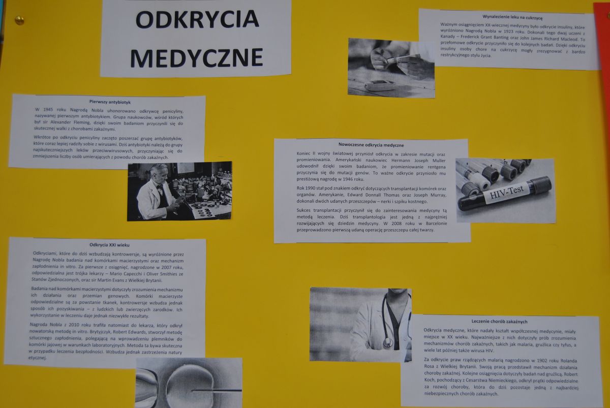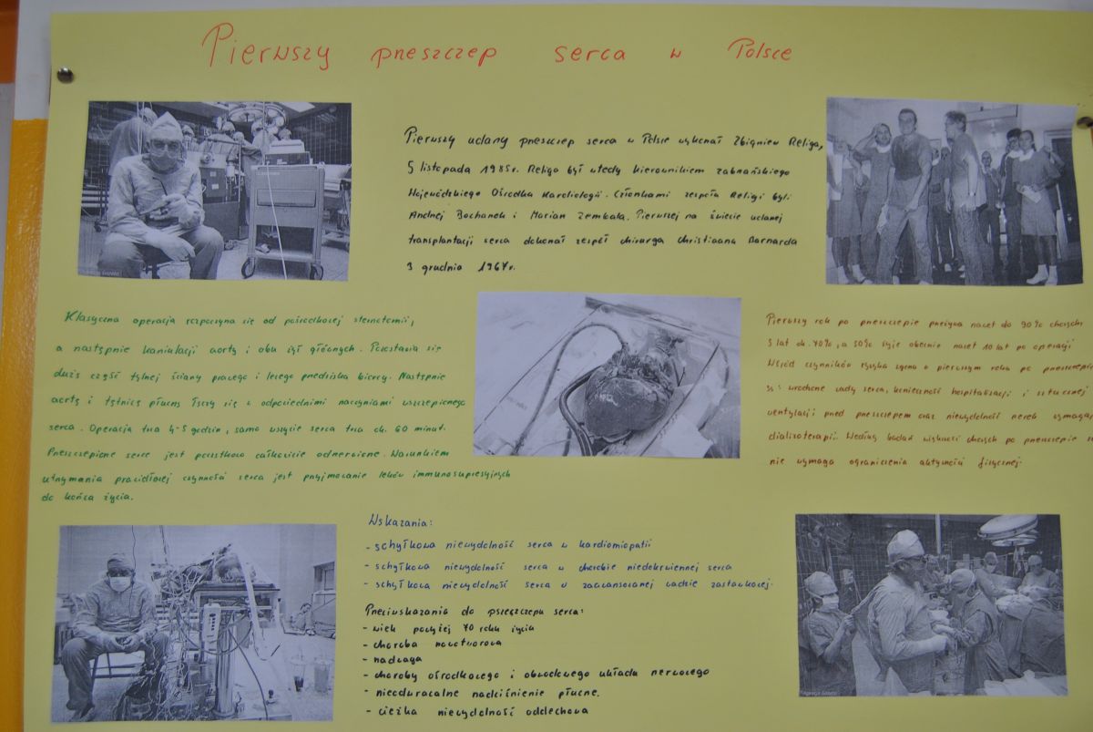Dowiecie się z nich między innymi o historii wynalezienia chemioterapii, protez, ultrasonografu, przeszczepów, antybiotykoterapii (czy wiedzieliście, ż pierwszym wynalezionym antybiotykiem jest penicylina, a za jej wynalezienie grupa naukowców otrzymała Nagrodę Nobla?), anestezjologii, promieni Roentgena, przetaczania krwi i antyseptyki. Jeden z ciekawszych plakatów prezentuje sylwetkę profesora Zbigniewa Religi, autora pierwszego w Polsce przeszczepu serca. Zachęcamy do lektury.