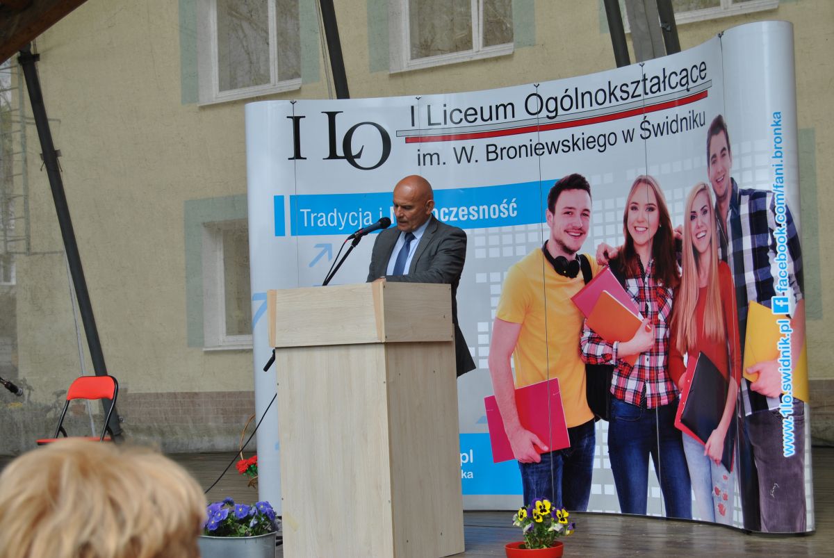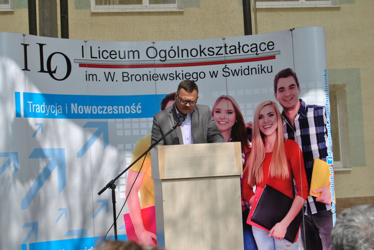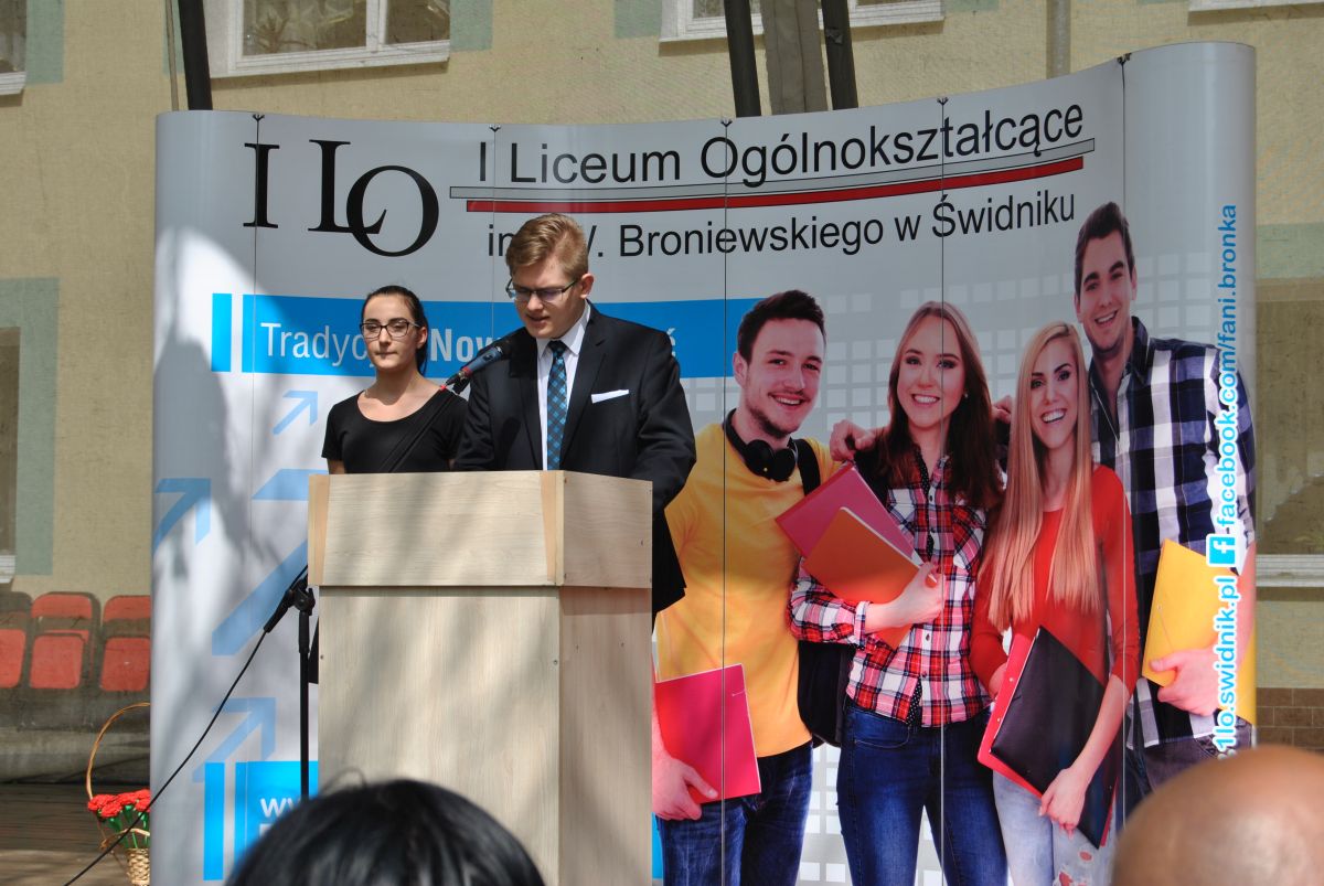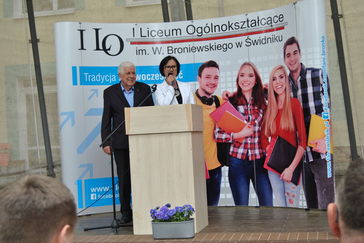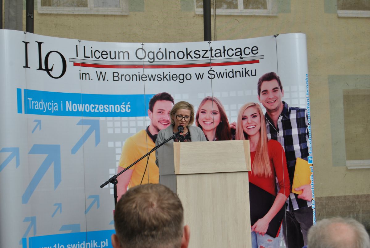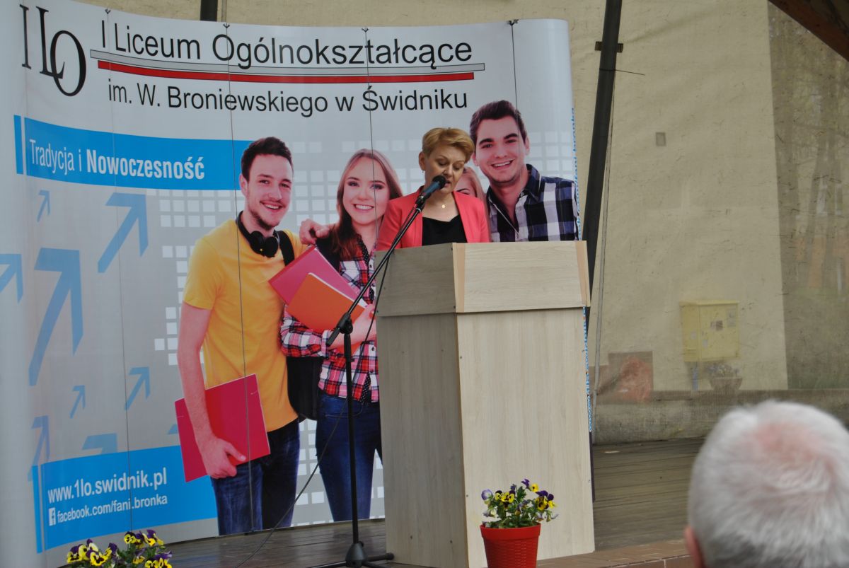 W muszli koncertowej MCUS odbyła się akcja głośnego czytania. W świat eseistyki Zbigniewa Herberta wprowadzili nas zaproszeni goście: ksiądz kanonik Leszek Surma, starosta Dariusz Kołodziejczyk, starosta Waldemar Białowąs, Bożena Zapalska – naczelnik Wydziału Edukacji i Sportu w imieniu burmistrza Waldemara Jaksona, Komendant Komendy Powiatowej Policji w Świdniku – insp. Grzegorz Hołub, komendant Straży Pożarnej w Świdniku - bryg. mgr inż. Sławomir Kowalczyk, Komendant Straży Miejskiej w Świdniku – pan Janusz Wójtowicz, dyrektor Miejsko – Powiatowej Biblioteki Publicznej Mirosław Król, dyrektor Miejskiego Ośrodka Kultury Adam Żurek, dyrektor Miejskiego Centrum Usług Socjalnych im. Jana Pawła II w Świdniku pani Beata Portka oraz dyrekcja I LO w Świdniku. Każdy czytający otrzymał piękną, wykonaną z bibuły różę oraz symbolicznie zawiesił na instalacji artystycznej wiersz patrona roku. Imprezę prowadzili: Natalia Parada i Michał Ciozda. W czasie czytania przed gośćmi wystąpili uzdolnieni muzycznie uczniowie naszej szkoły – Alicja Reszka, Piotr Jasielski, Laura Bogusz i Paweł Zaborek.