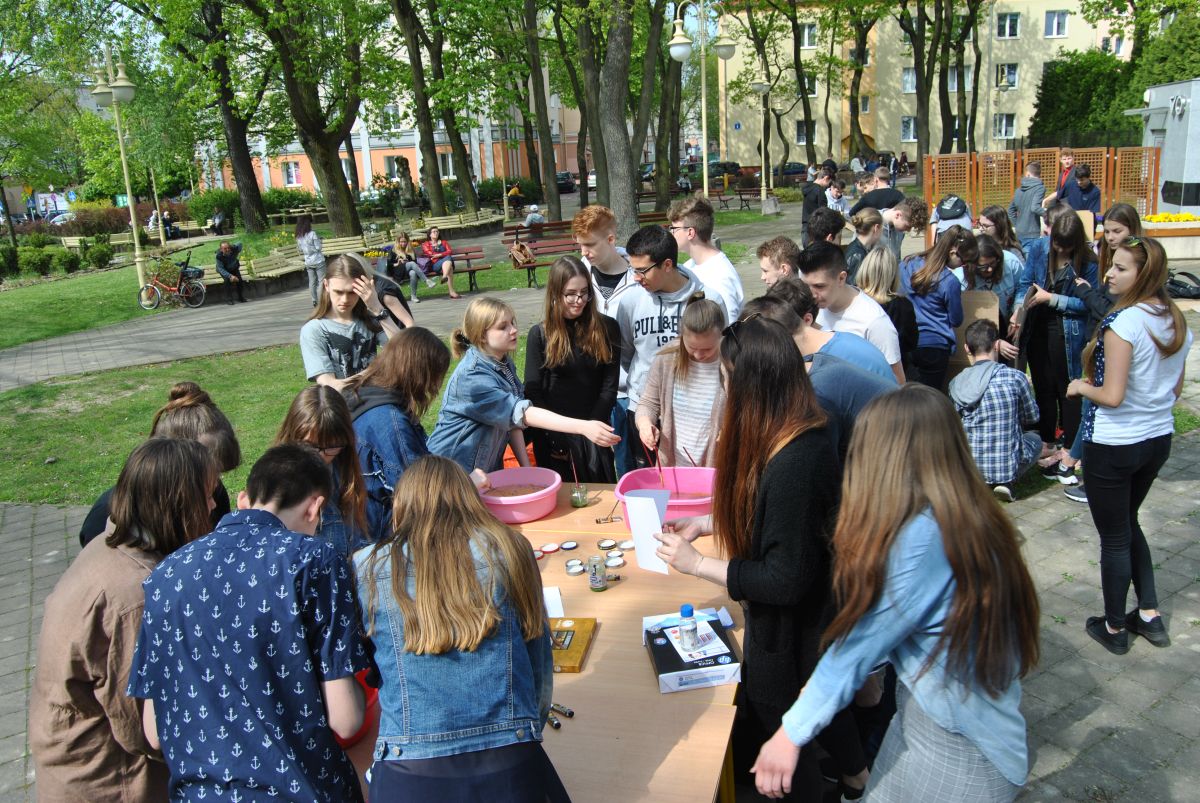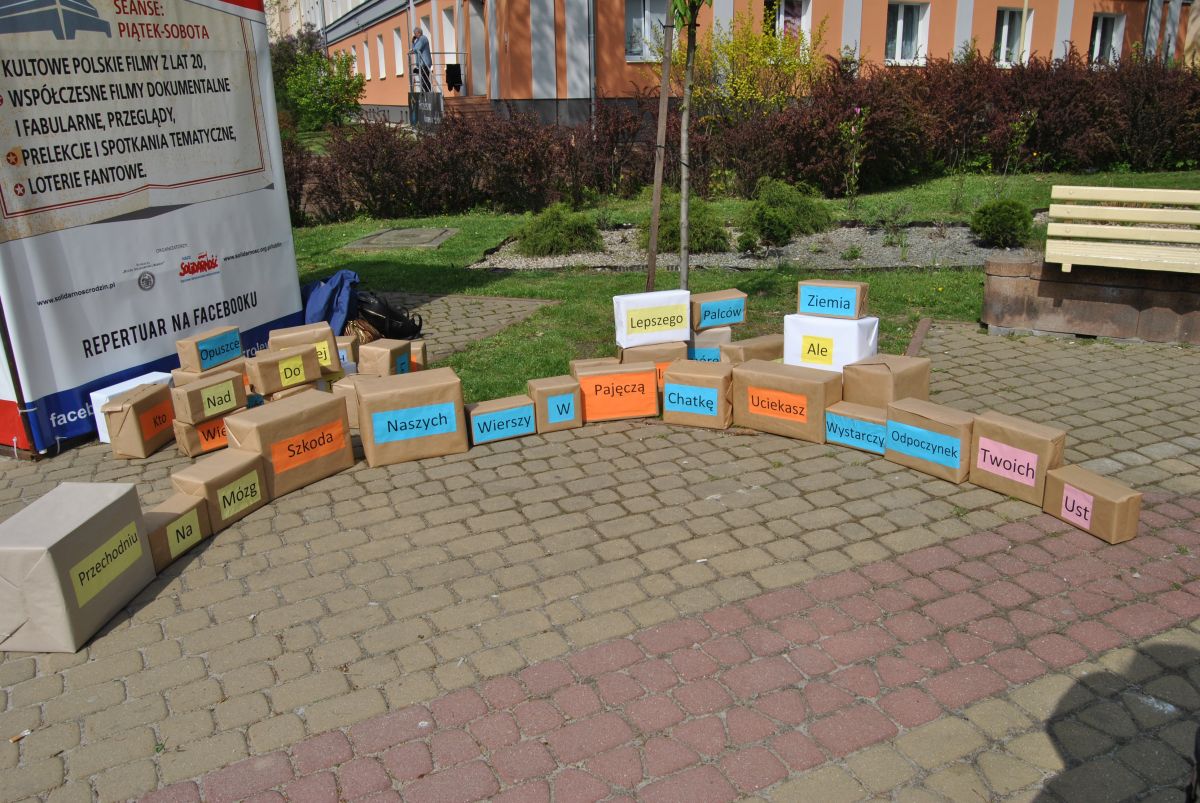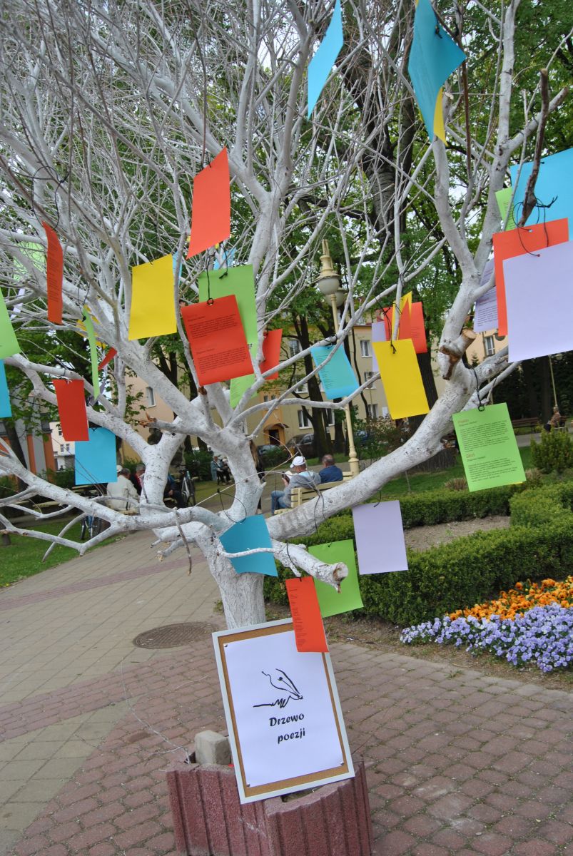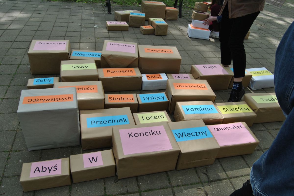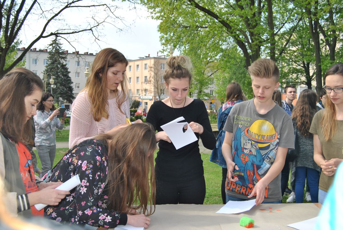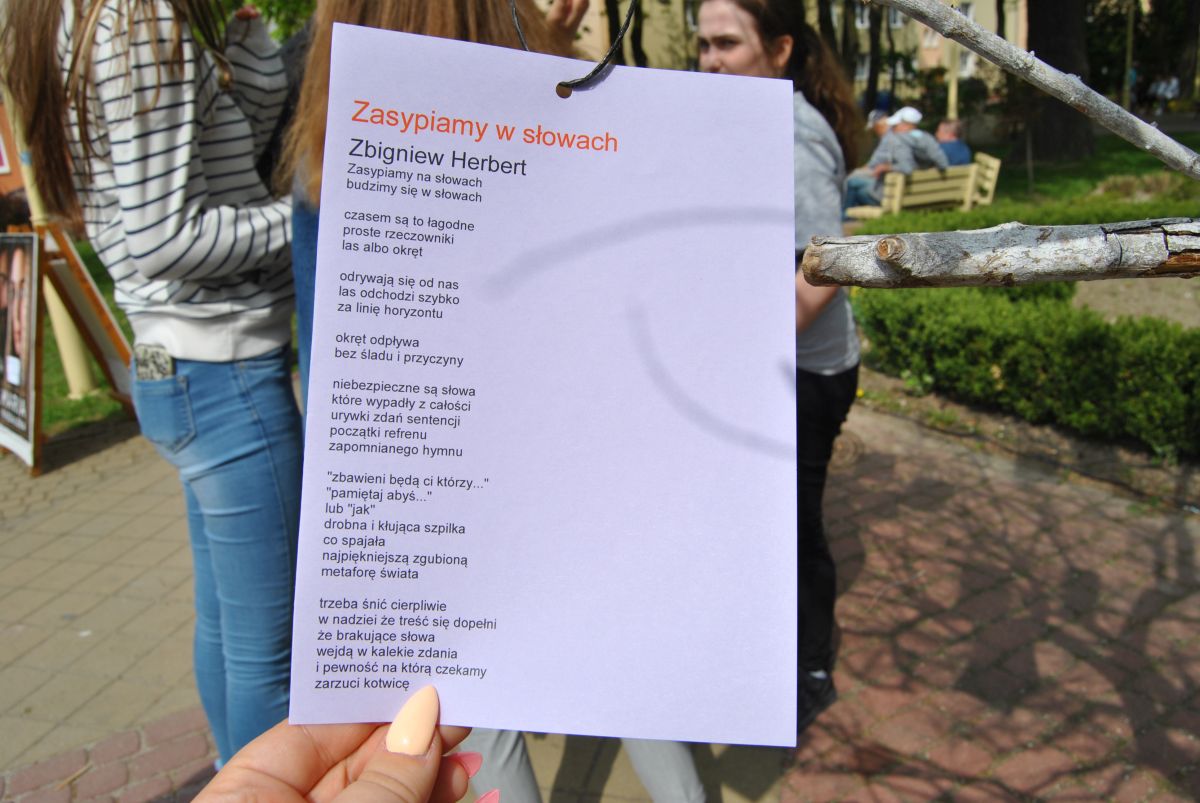 Po warsztatach młodzież wzięła udział w innych działaniach na placu, przygotowanych przez uczniów z koła dziennikarskiego – układanie puzzli poetyckich we własną poetycką improwizację, tworzenie instalacji Drzewa Poezji Zbigniewa Herberta oraz zmaganiach z łamańcami językowymi z cyklu nie/łatwy język polski. Było nam bardzo miło, gdy okazało się, że w nasze działania włączyła się nie tylko zaproszona młodzież, ale i mieszkańcy miasta, którzy nasze poetyckie propozycje potraktowali jako wyzwania i byli gotowi się z nimi zmierzyć. W czasie działań na placu przy fontannie i czytania w muszli uczniowie z koła rozdawali mieszkańcom miasta róże wykonane z bibuły oraz fiszki i zakładki z poezją i fragmentami eseistyki Zbigniewa Herberta.