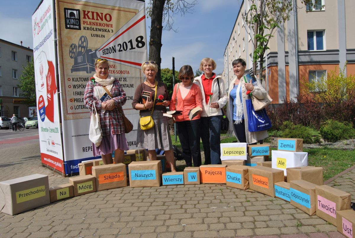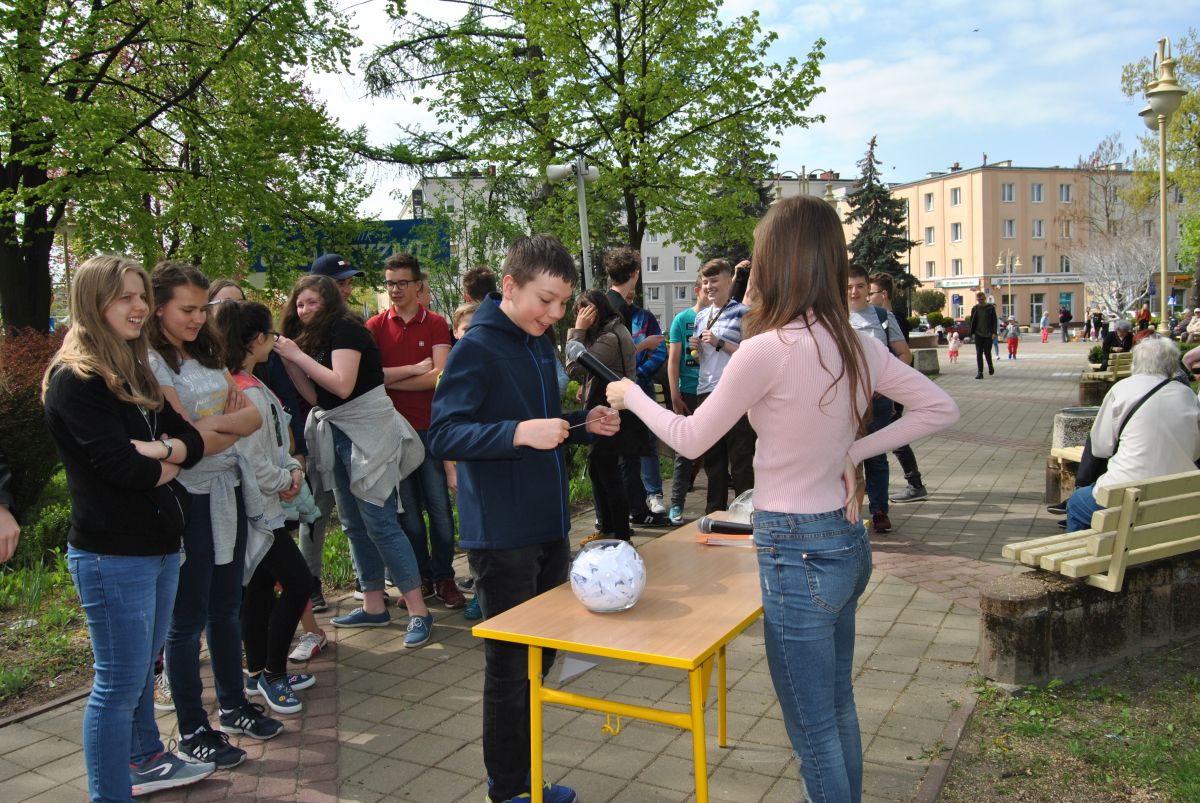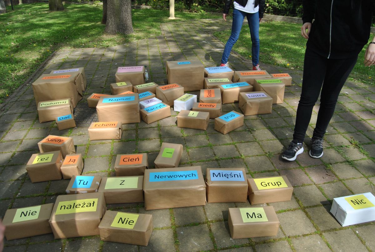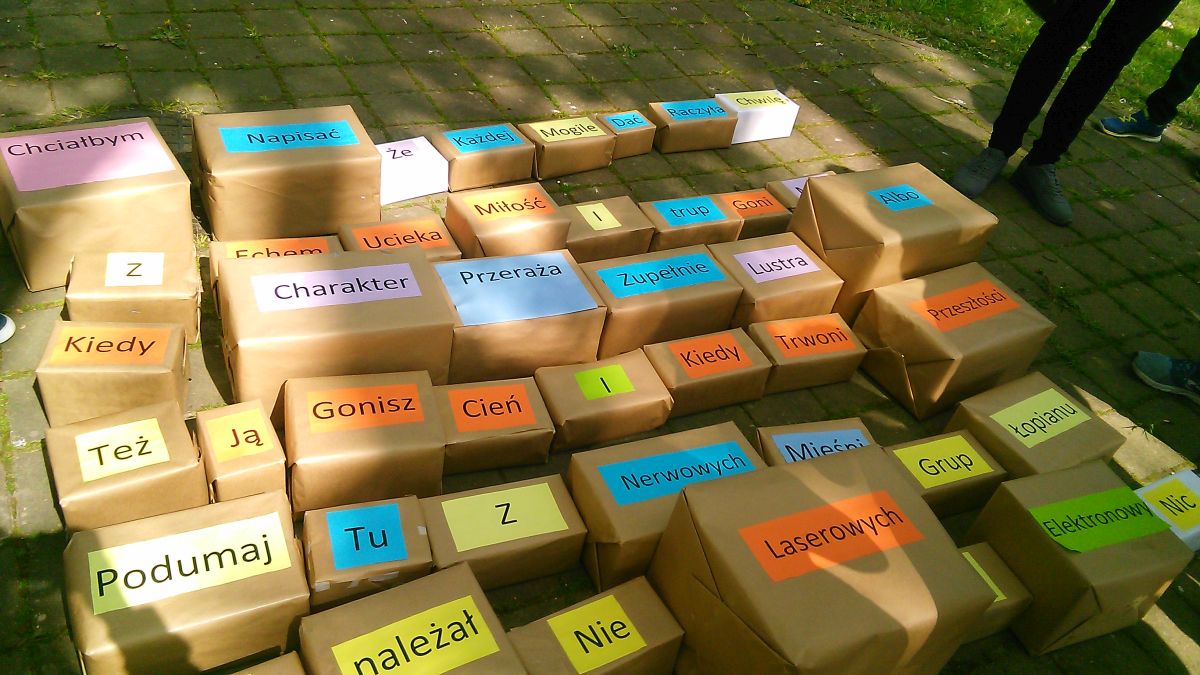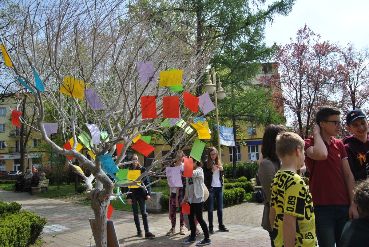 Po warsztatach młodzież wzięła udział w innych działaniach na placu, przygotowanych przez uczniów z koła dziennikarskiego – układanie puzzli poetyckich we własną poetycką improwizację, tworzenie instalacji Drzewa Poezji Zbigniewa Herberta oraz zmaganiach z łamańcami językowymi z cyklu nie/łatwy język polski. Było nam bardzo miło, gdy okazało się, że w nasze działania włączyła się nie tylko zaproszona młodzież, ale i mieszkańcy miasta, którzy nasze poetyckie propozycje potraktowali jako wyzwania i byli gotowi się z nimi zmierzyć. W czasie działań na placu przy fontannie i czytania w muszli uczniowie z koła rozdawali mieszkańcom miasta róże wykonane z bibuły oraz fiszki i zakładki z poezją i fragmentami eseistyki Zbigniewa Herberta.