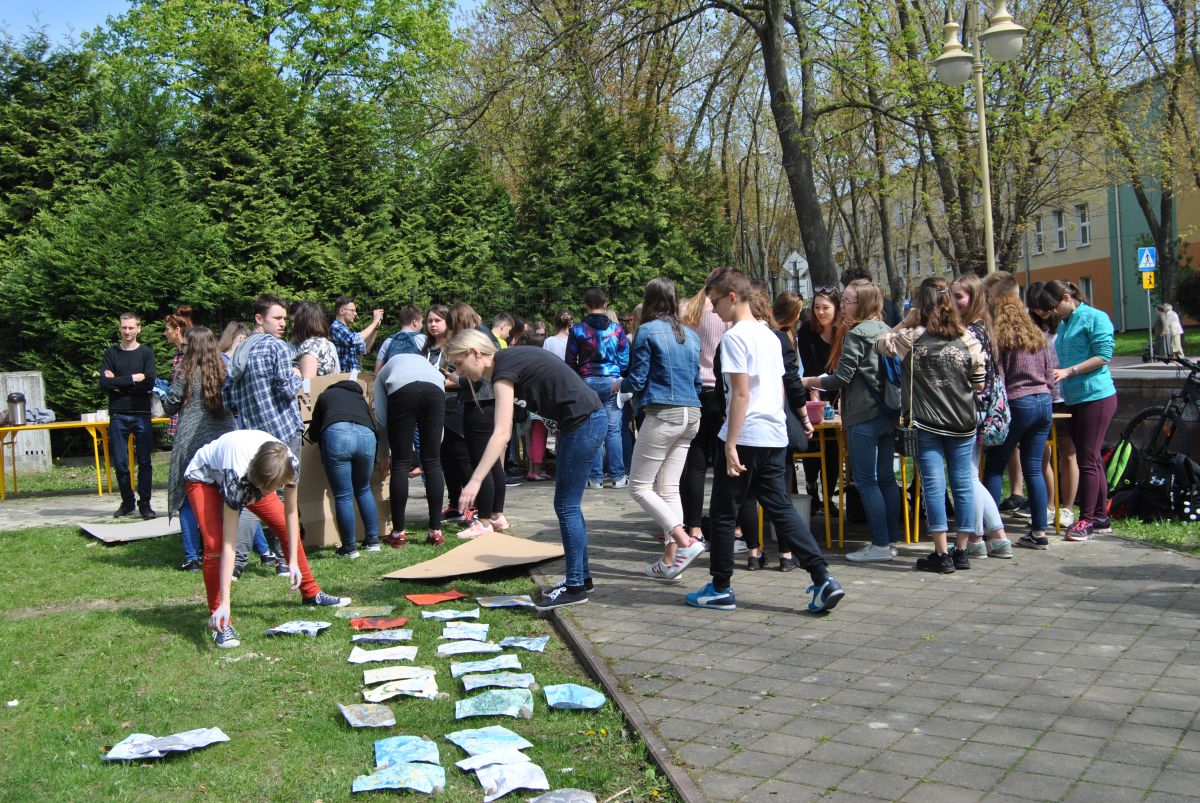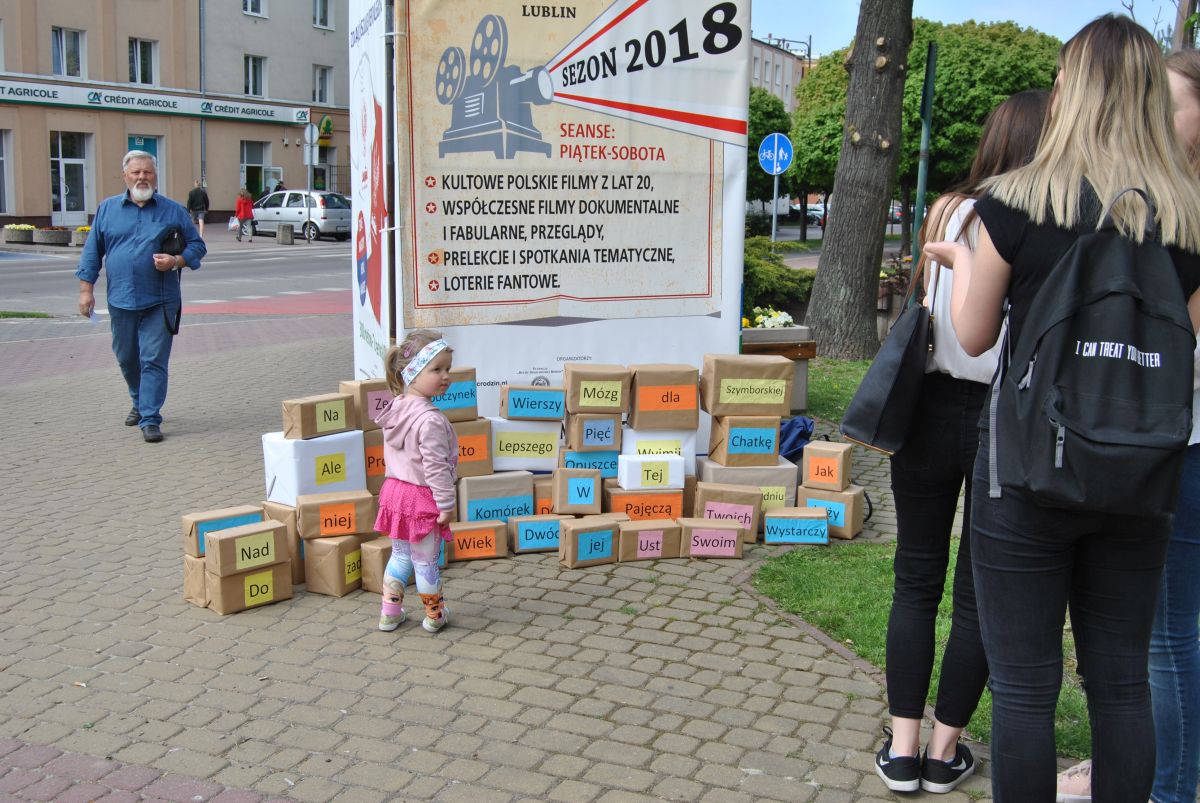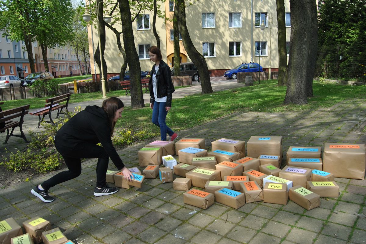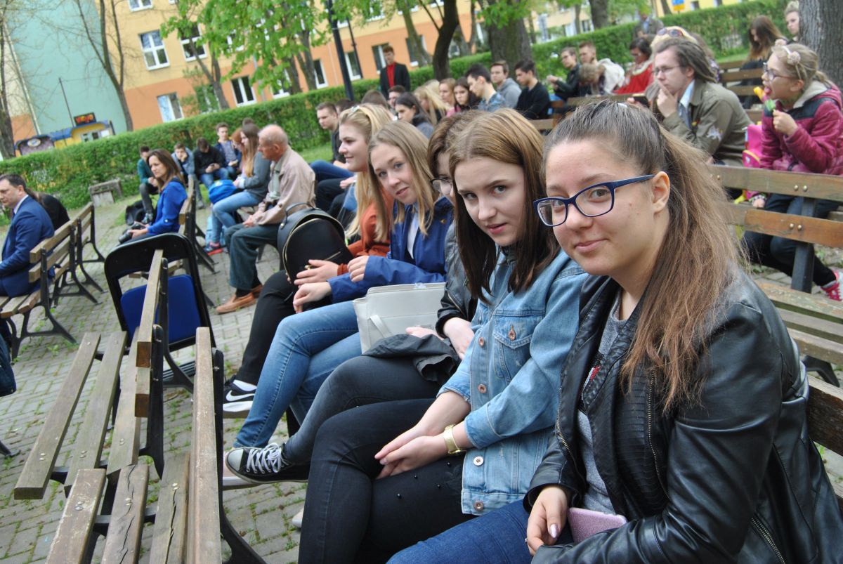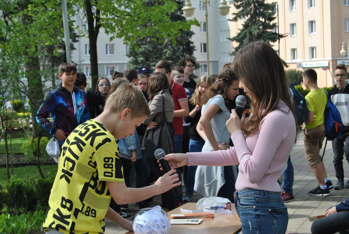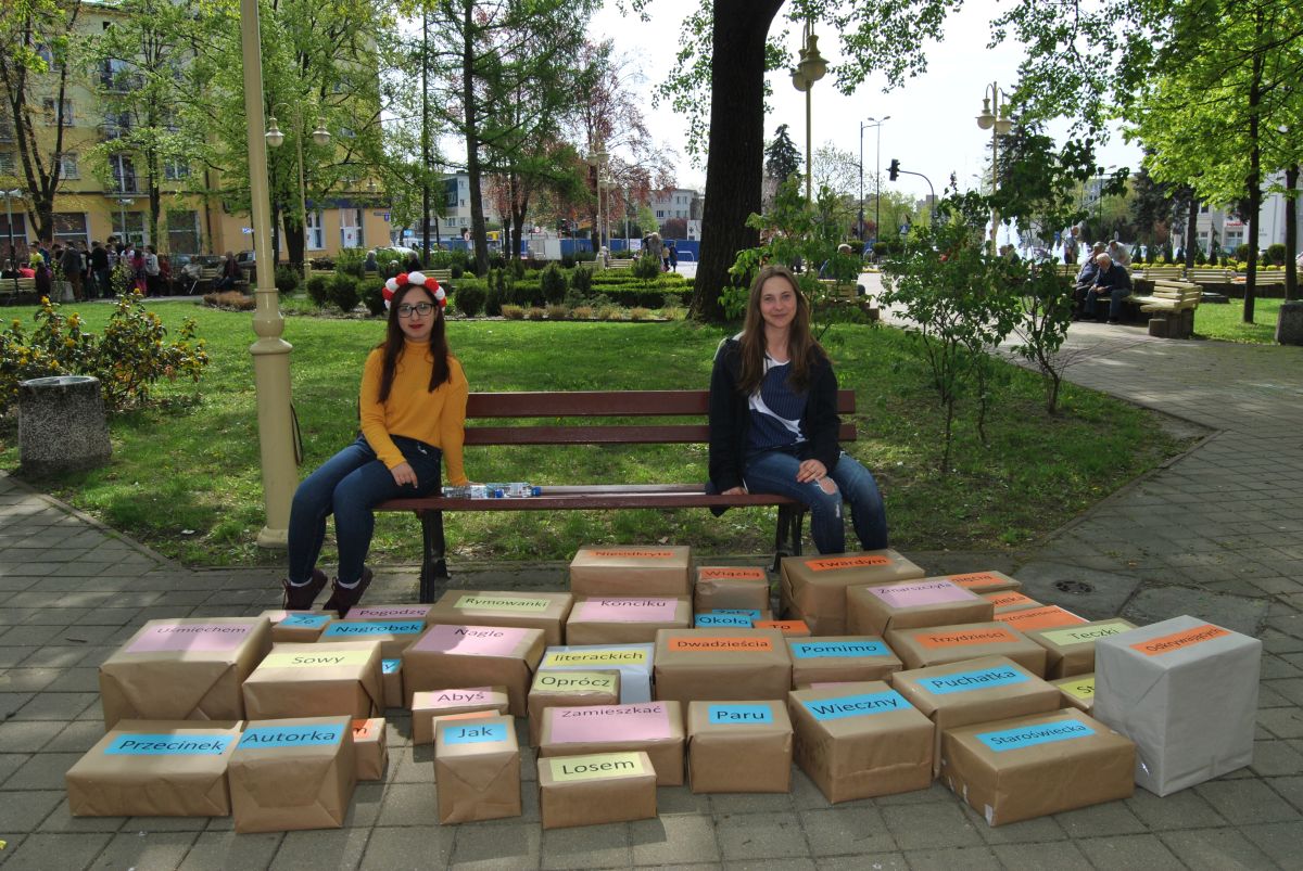 Po warsztatach młodzież wzięła udział w innych działaniach na placu, przygotowanych przez uczniów z koła dziennikarskiego – układanie puzzli poetyckich we własną poetycką improwizację, tworzenie instalacji Drzewa Poezji Zbigniewa Herberta oraz zmaganiach z łamańcami językowymi z cyklu nie/łatwy język polski. Było nam bardzo miło, gdy okazało się, że w nasze działania włączyła się nie tylko zaproszona młodzież, ale i mieszkańcy miasta, którzy nasze poetyckie propozycje potraktowali jako wyzwania i byli gotowi się z nimi zmierzyć. W czasie działań na placu przy fontannie i czytania w muszli uczniowie z koła rozdawali mieszkańcom miasta róże wykonane z bibuły oraz fiszki i zakładki z poezją i fragmentami eseistyki Zbigniewa Herberta.