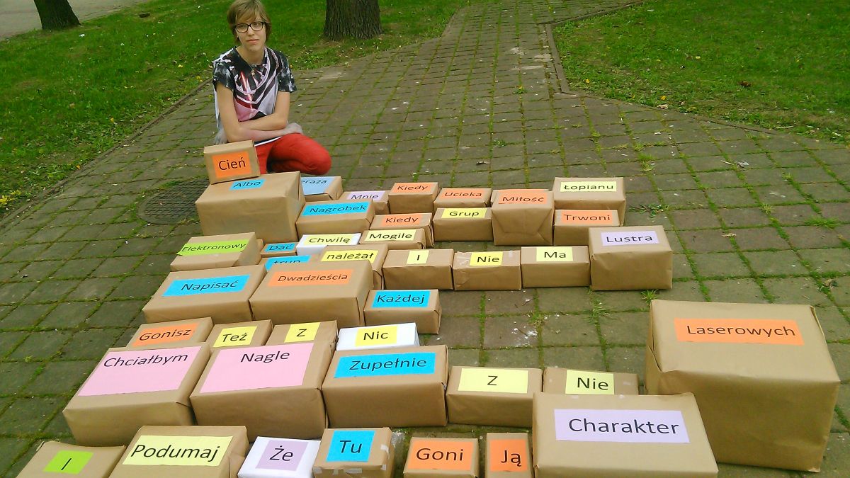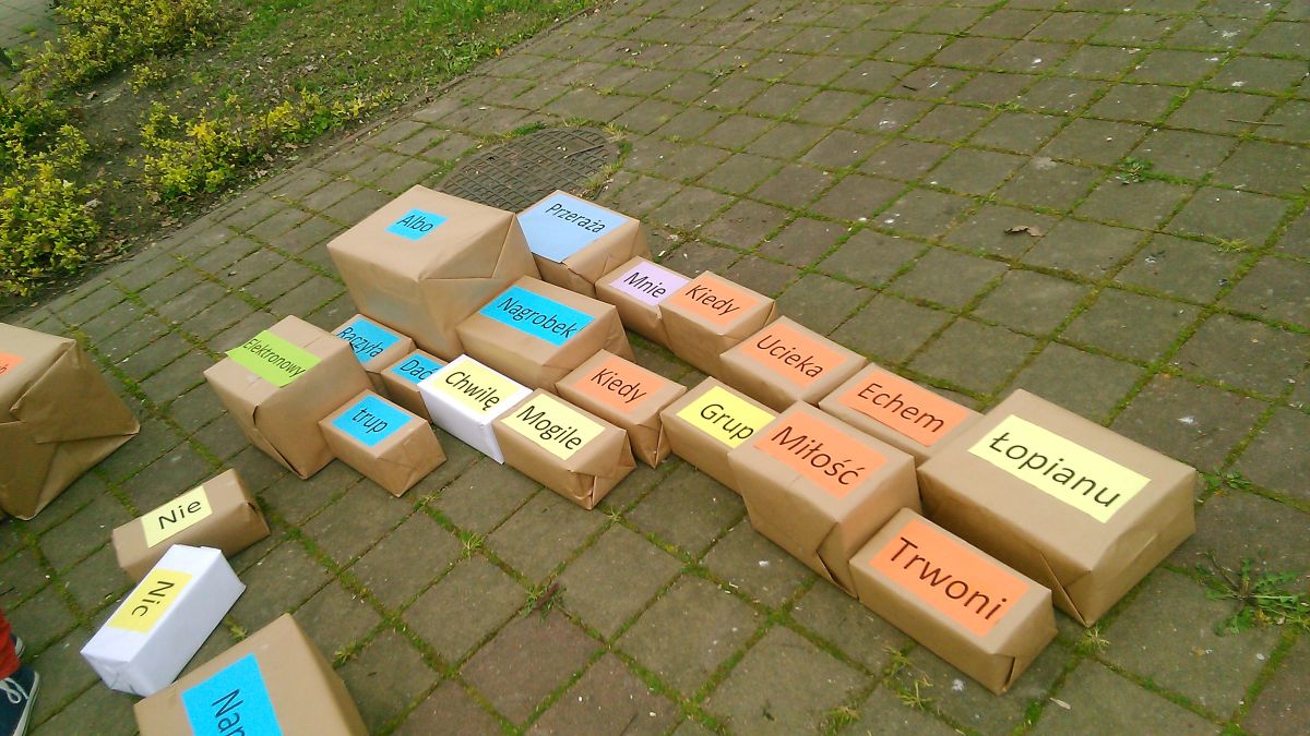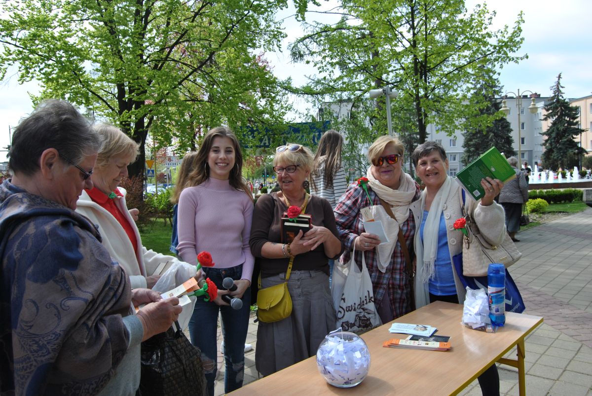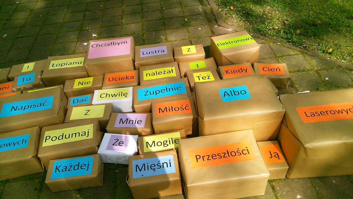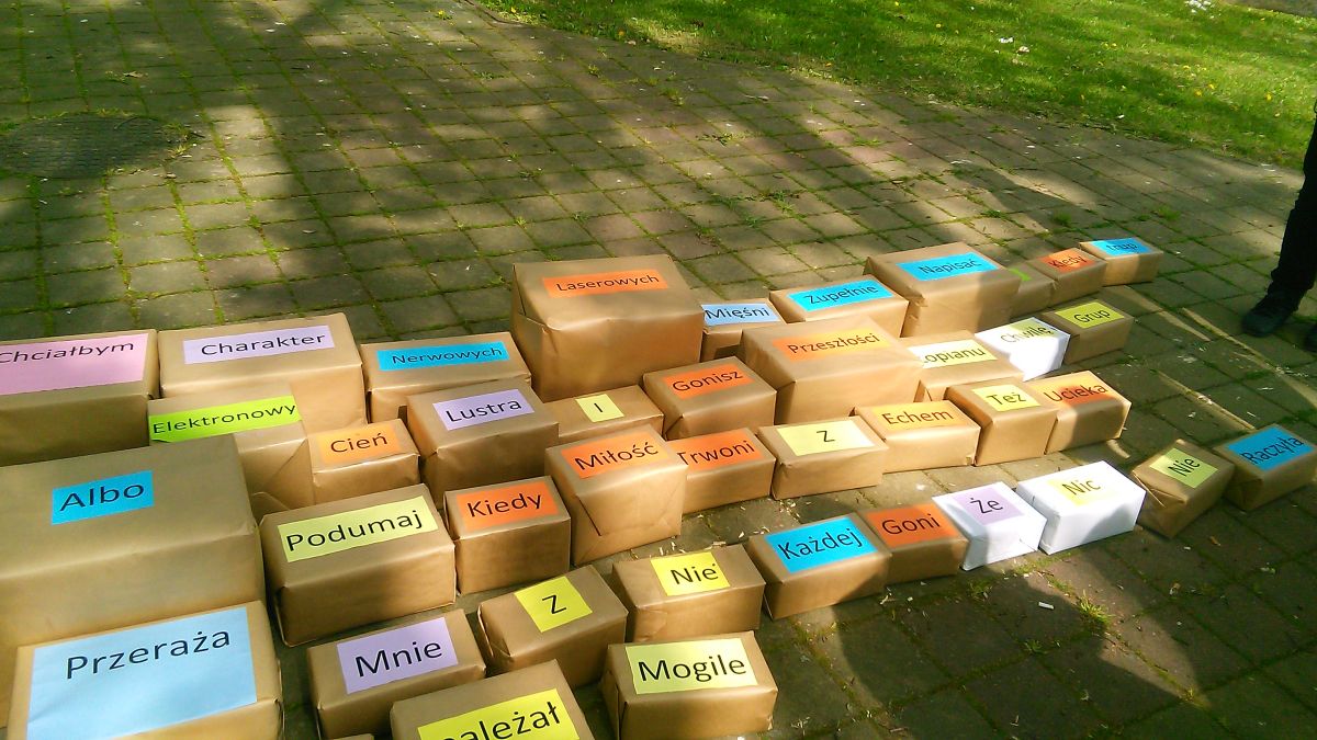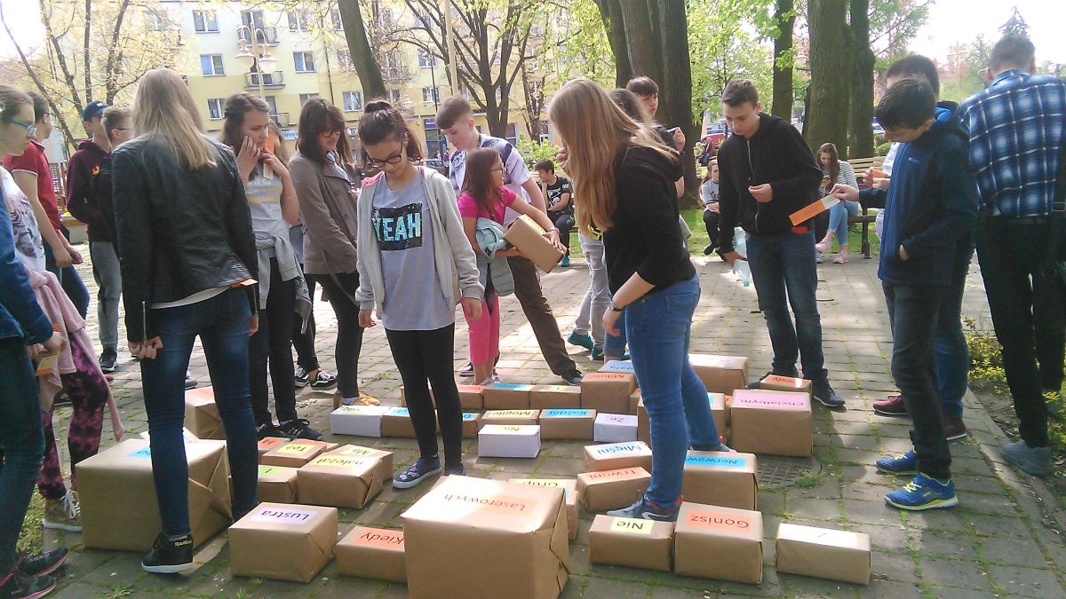 Po warsztatach młodzież wzięła udział w innych działaniach na placu, przygotowanych przez uczniów z koła dziennikarskiego – układanie puzzli poetyckich we własną poetycką improwizację, tworzenie instalacji Drzewa Poezji Zbigniewa Herberta oraz zmaganiach z łamańcami językowymi z cyklu nie/łatwy język polski. Było nam bardzo miło, gdy okazało się, że w nasze działania włączyła się nie tylko zaproszona młodzież, ale i mieszkańcy miasta, którzy nasze poetyckie propozycje potraktowali jako wyzwania i byli gotowi się z nimi zmierzyć. W czasie działań na placu przy fontannie i czytania w muszli uczniowie z koła rozdawali mieszkańcom miasta róże wykonane z bibuły oraz fiszki i zakładki z poezją i fragmentami eseistyki Zbigniewa Herberta.
