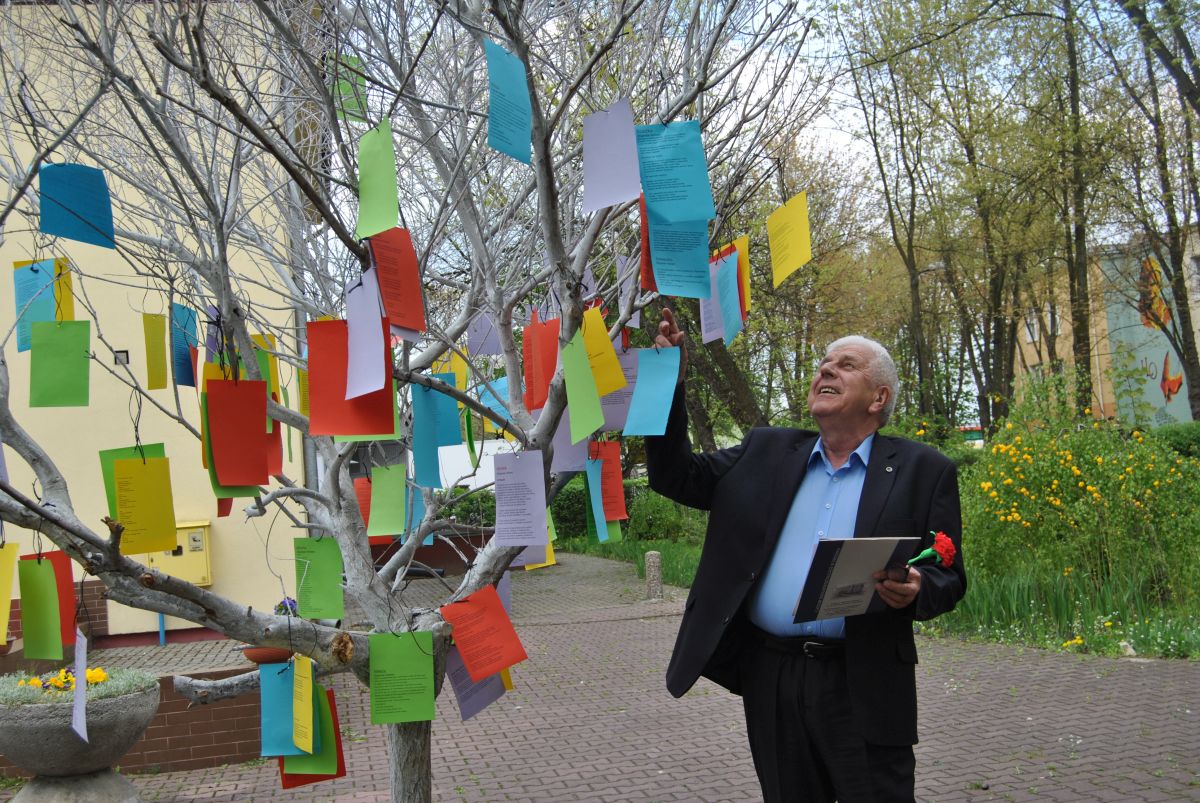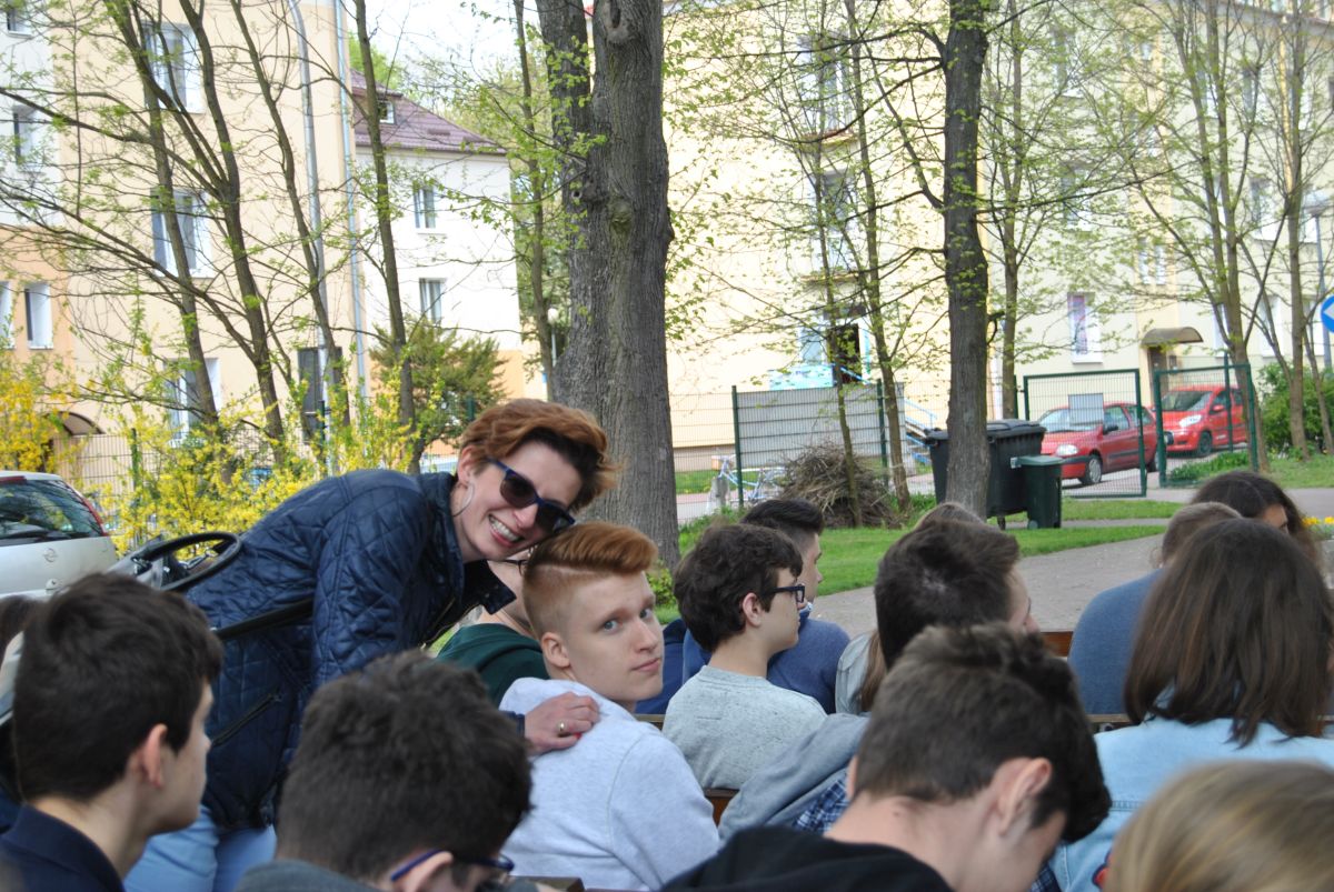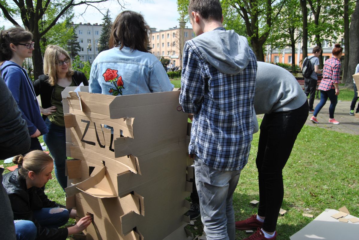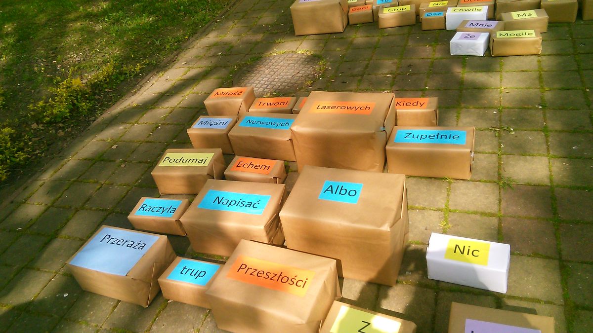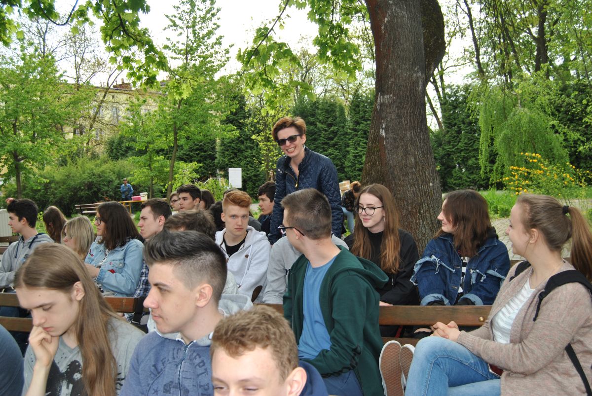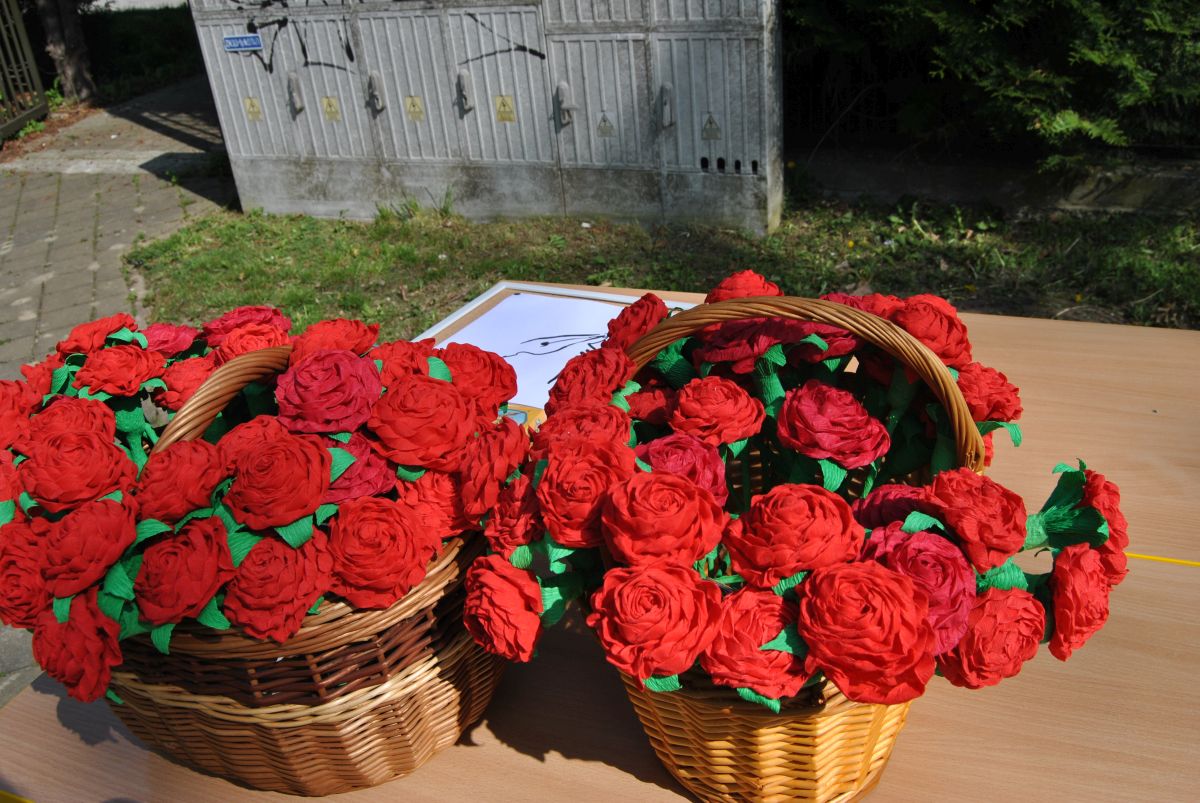 Po warsztatach młodzież wzięła udział w innych działaniach na placu, przygotowanych przez uczniów z koła dziennikarskiego – układanie puzzli poetyckich we własną poetycką improwizację, tworzenie instalacji Drzewa Poezji Zbigniewa Herberta oraz zmaganiach z łamańcami językowymi z cyklu nie/łatwy język polski. Było nam bardzo miło, gdy okazało się, że w nasze działania włączyła się nie tylko zaproszona młodzież, ale i mieszkańcy miasta, którzy nasze poetyckie propozycje potraktowali jako wyzwania i byli gotowi się z nimi zmierzyć. W czasie działań na placu przy fontannie i czytania w muszli uczniowie z koła rozdawali mieszkańcom miasta róże wykonane z bibuły oraz fiszki i zakładki z poezją i fragmentami eseistyki Zbigniewa Herberta.