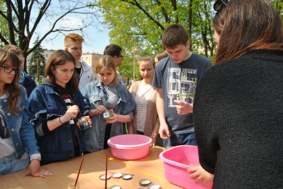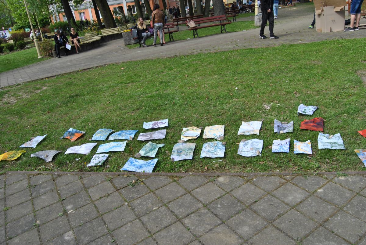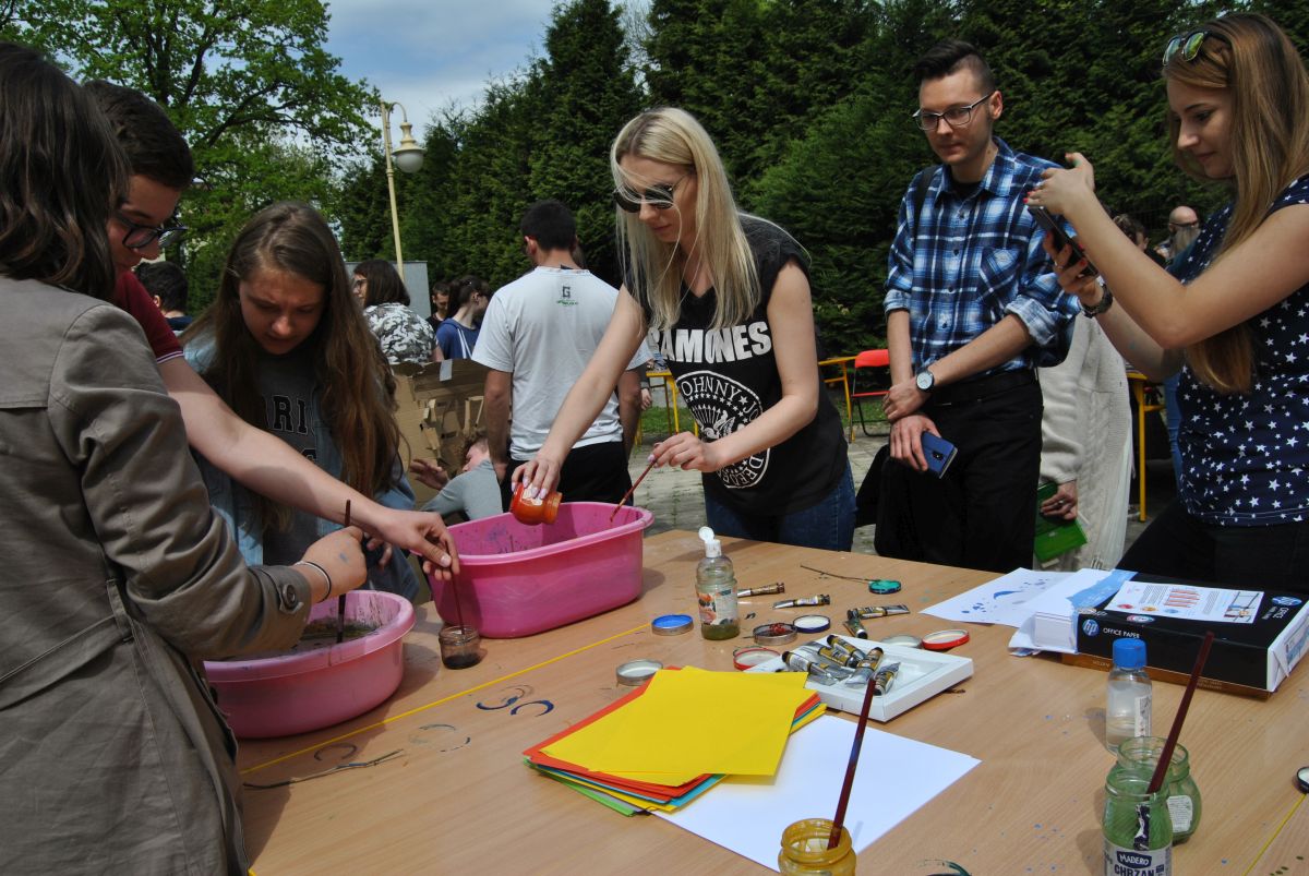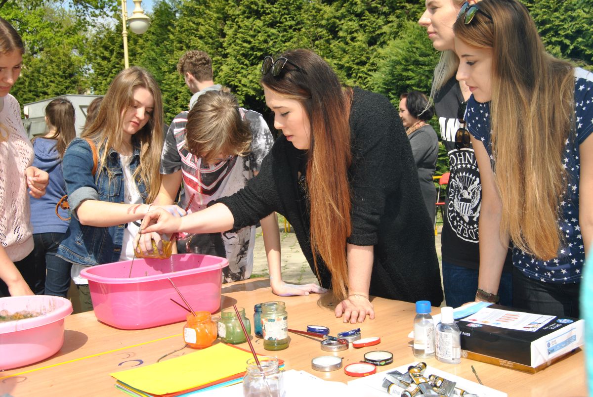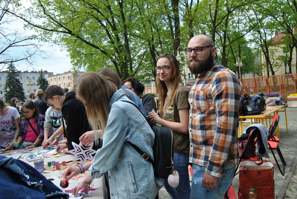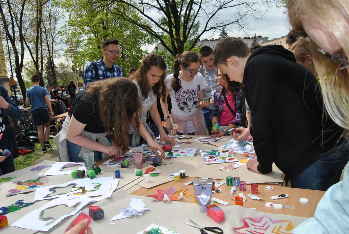 Plac przy fontannie na kilka godzin zamienił się w królestwo kreatywnej poezji i sztuki, a wszystko za sprawą dwóch inicjatyw, które połączyliśmy w jednym miejscu. Pierwsza z nich to warsztaty artystyczne, przygotowane przez studentów Wydziału Artystycznego UMCS pod kierunkiem pani prof. dr hab. Anny Boguszewskiej. Były to bardzo aktywne i twórcze zajęcia z tworzenia rzeźby, plakatów, kolaży, wykonywanych farbami olejnymi. Na warsztaty zaprosiliśmy młodzież gimnazjalną – z trzech klas trzecich Gimnazjum nr 1 i Gimnazjum nr 3 oraz klasę siódmą ze Szkoły Podstawowej nr 3 w Świdniku.
