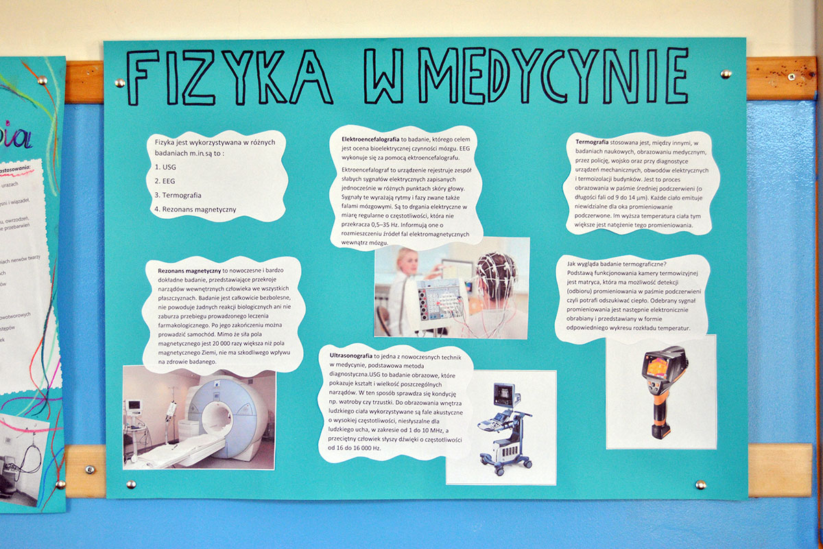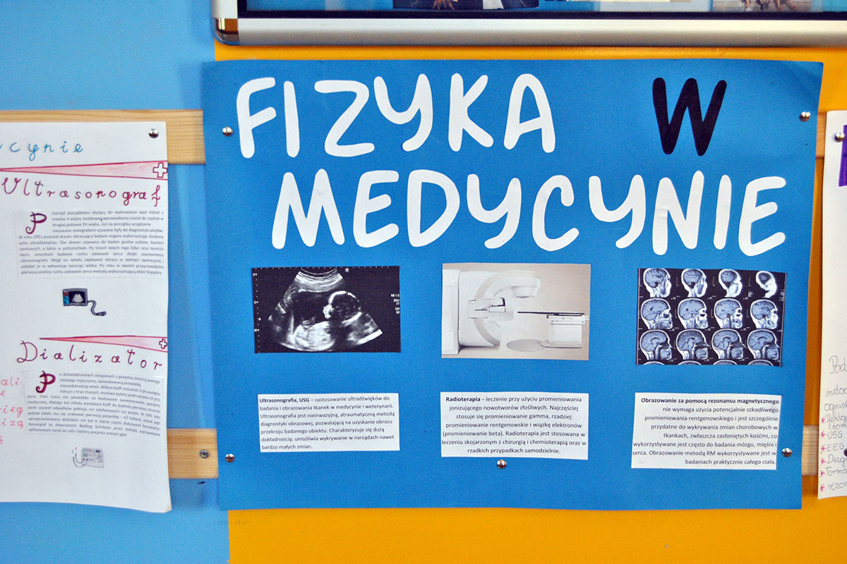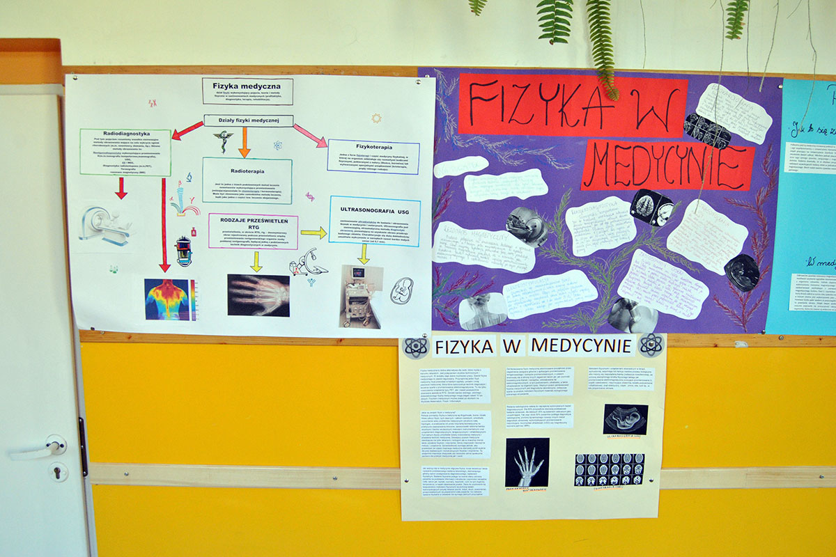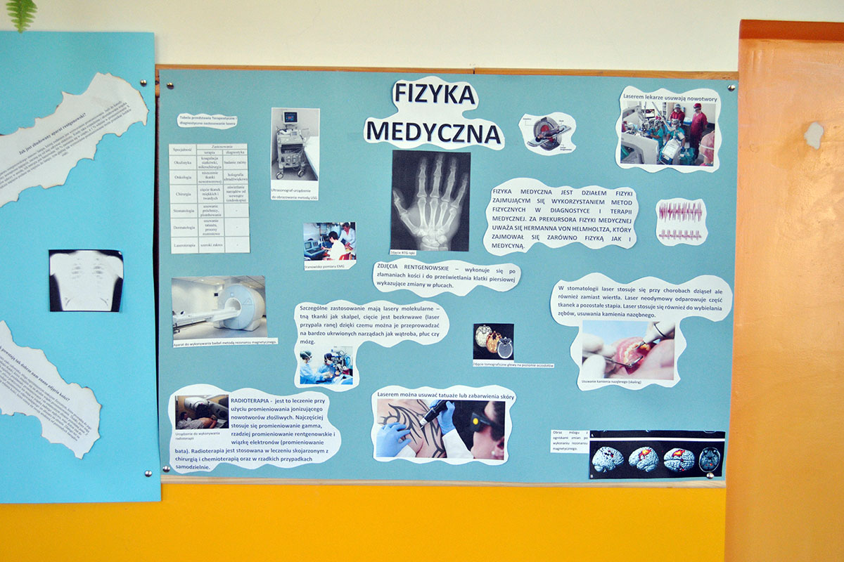 „Fizyka w medycynie” to najnowsza akcja plakatowa przygotowana przez uczniów pod opieką p. A. Ziętek. Odpoczywając na szkolnym korytarzu w czasie przerwy możecie poczytać między innymi o radioterapii, radiodiagnostyce, fizykoterapii, ultrasonografii, zastosowaniu lasera i plazmy, a także działaniu dializatora i rezonansu magnetycznego.