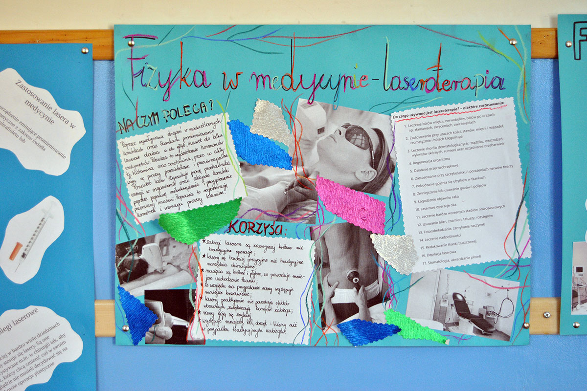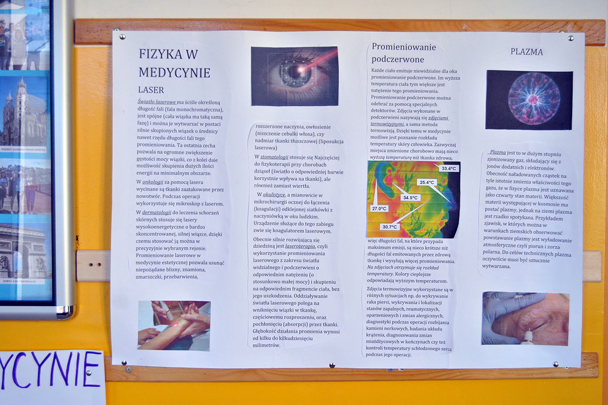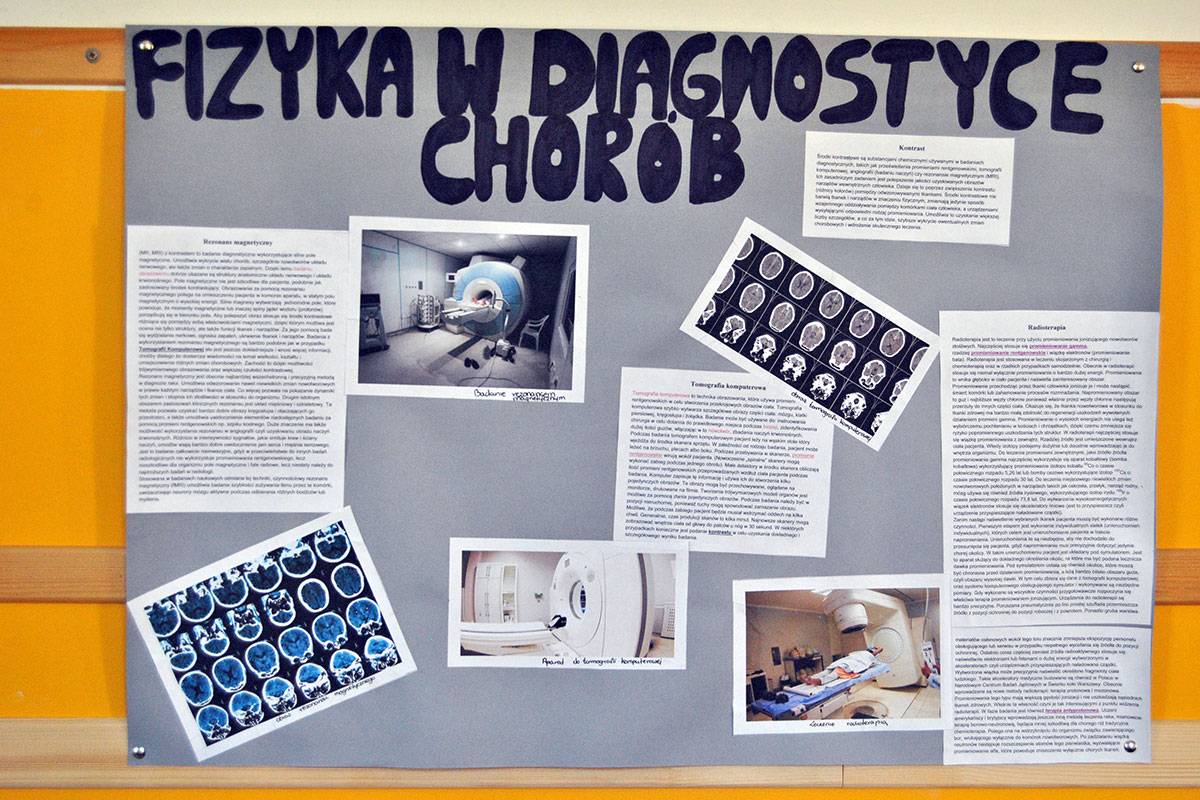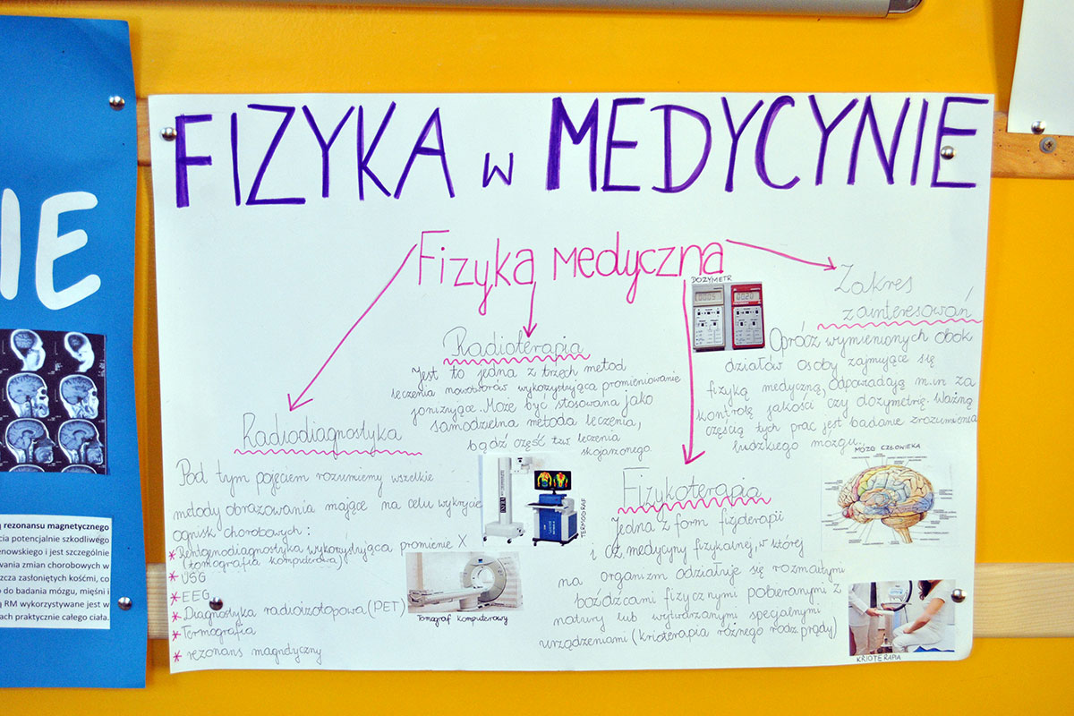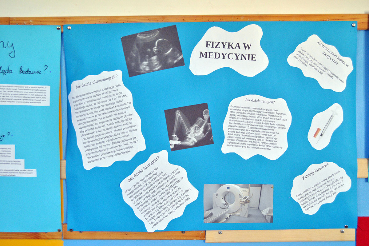 „Fizyka w medycynie” to najnowsza akcja plakatowa przygotowana przez uczniów pod opieką p. A. Ziętek. Odpoczywając na szkolnym korytarzu w czasie przerwy możecie poczytać między innymi o radioterapii, radiodiagnostyce, fizykoterapii, ultrasonografii, zastosowaniu lasera i plazmy, a także działaniu dializatora i rezonansu magnetycznego.