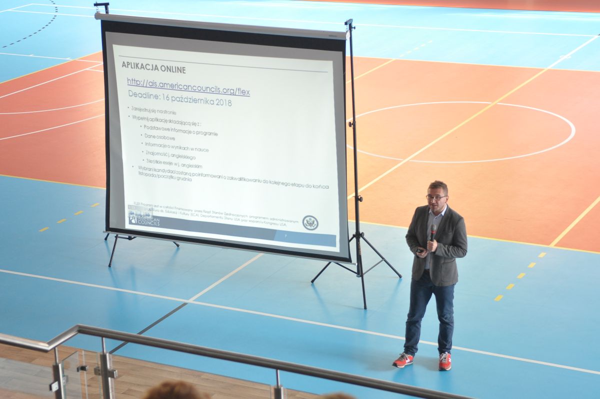 W piątek 5 października I Liceum gościło p. Piotra Dobrosza z Fundacji American Councils for International Education, który zapoznał uczniów z programem FLEX. FLEX, czyli Future Leaders Exchange Program, to całoroczny, w pełni finansowany przez Departament Stanu USA, program wymiany dla uczniów szkół średnich.