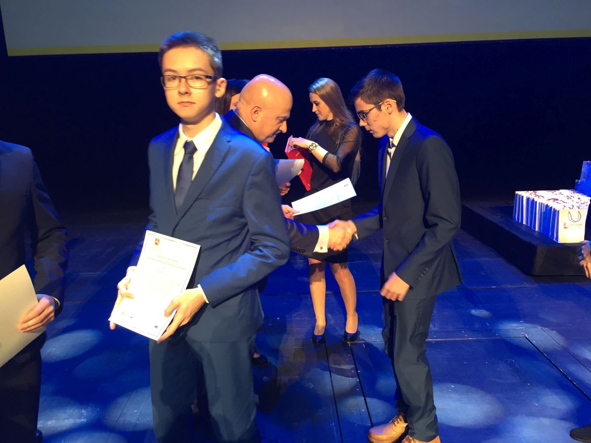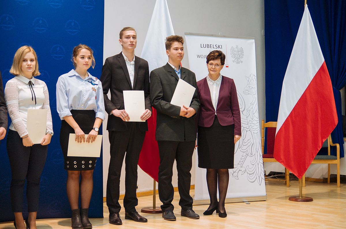 Uroczystość odbyła się w Sali Błękitnej Lubelskiego Urzędu Wojewódzkiego. Najlepszemu uczniowi „Bronka” towarzyszyła wychowawczyni p. M. Noskowicz. Dzień później w Centrum Spotkania Kultur odbyła się gala wręczenia stypendiów najzdolniejszym uczniom województwa lubelskiego. Stypendia Marszałka Województwa Lubelskiego z rąk Marszałka WL Jarosława Stawiarskiego oraz Wicemarszałka Dariusza Stefaniuka otrzymali dwaj nasi uczniowie klasy matematycznej Kacper Śliwa i Szymon Kita. Towarzyszył im wychowawca p. J. Jaśkowski. Gratulujemy wspaniałych wyników w nauce i życzymy dalszych, pięknych sukcesów.