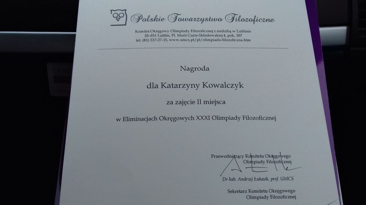 II miejsce w okręgu lubelskim i rekomendacja do etapu centralnego olimpiady filozoficznej dla Kasi Kowalczyk