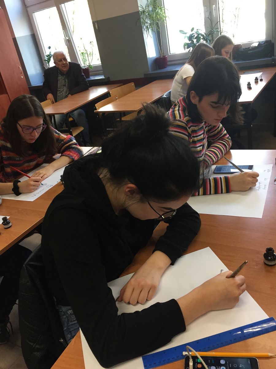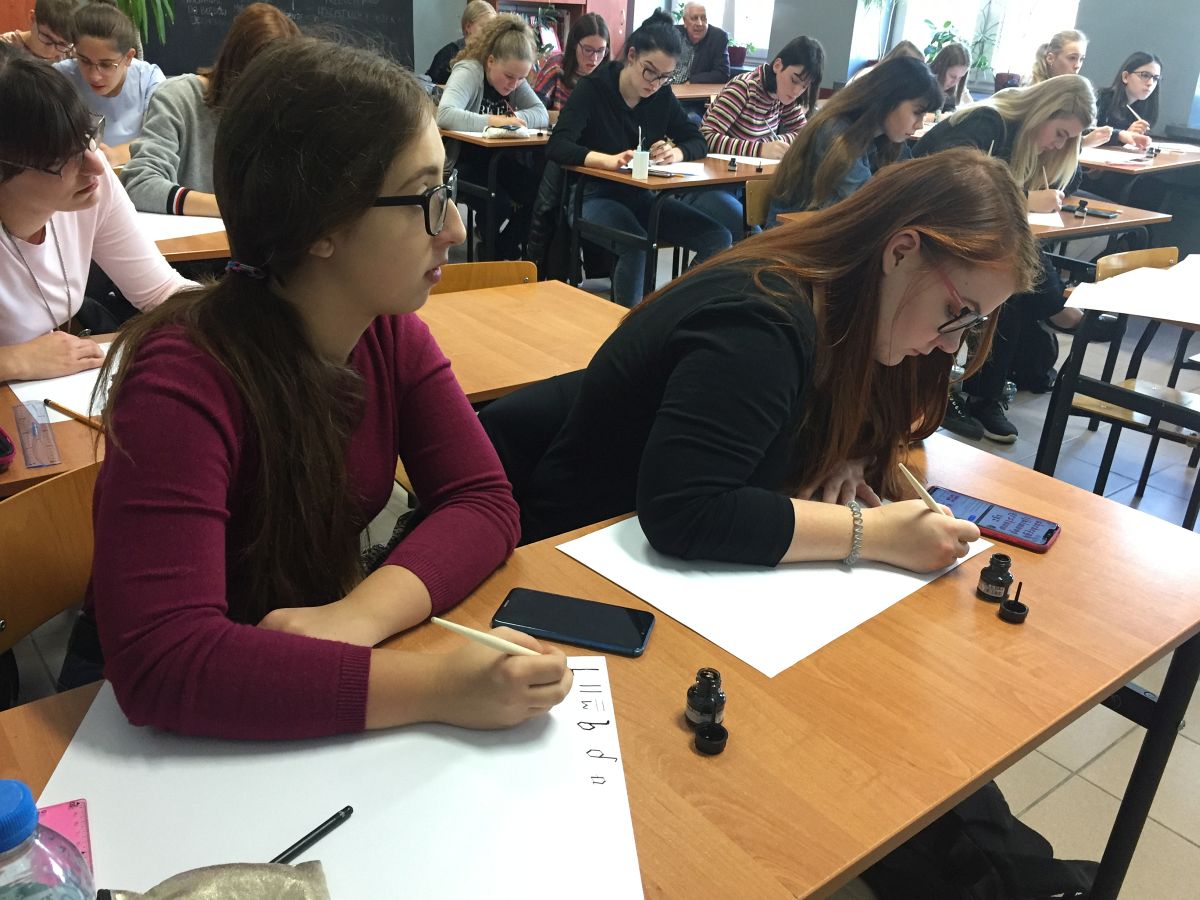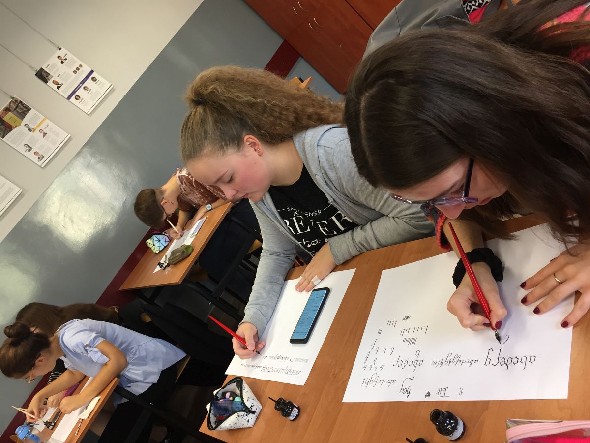 18 października odbył się pierwszy etap projektu – uczniowie wzięli udział w warsztatach kaligrafii, które prowadził malarz, rzeźbiarz i grafik Marcin Ziółkowski, artysta, który brał udział w wielu wystawach zbiorowych, a jego prace zdobią prywatne kolekcje m.in. w Polsce, Wielkiej Brytanii i USA. Pasjonujące i bardzo kreatywne warsztaty kaligrafii uświadomiły nam, jak przyjemne i twórcze może być pisanie ręczne. Zajęcia pozwoliły uczestnikom wypróbować swoich sił w posługiwaniu się stalówką umieszczoną na obsadce i maczanej w tuszu. Drugi etap to przepisywanie wybranych przez siebie wierszy na specjalnej papeterii.