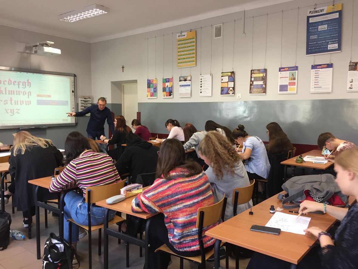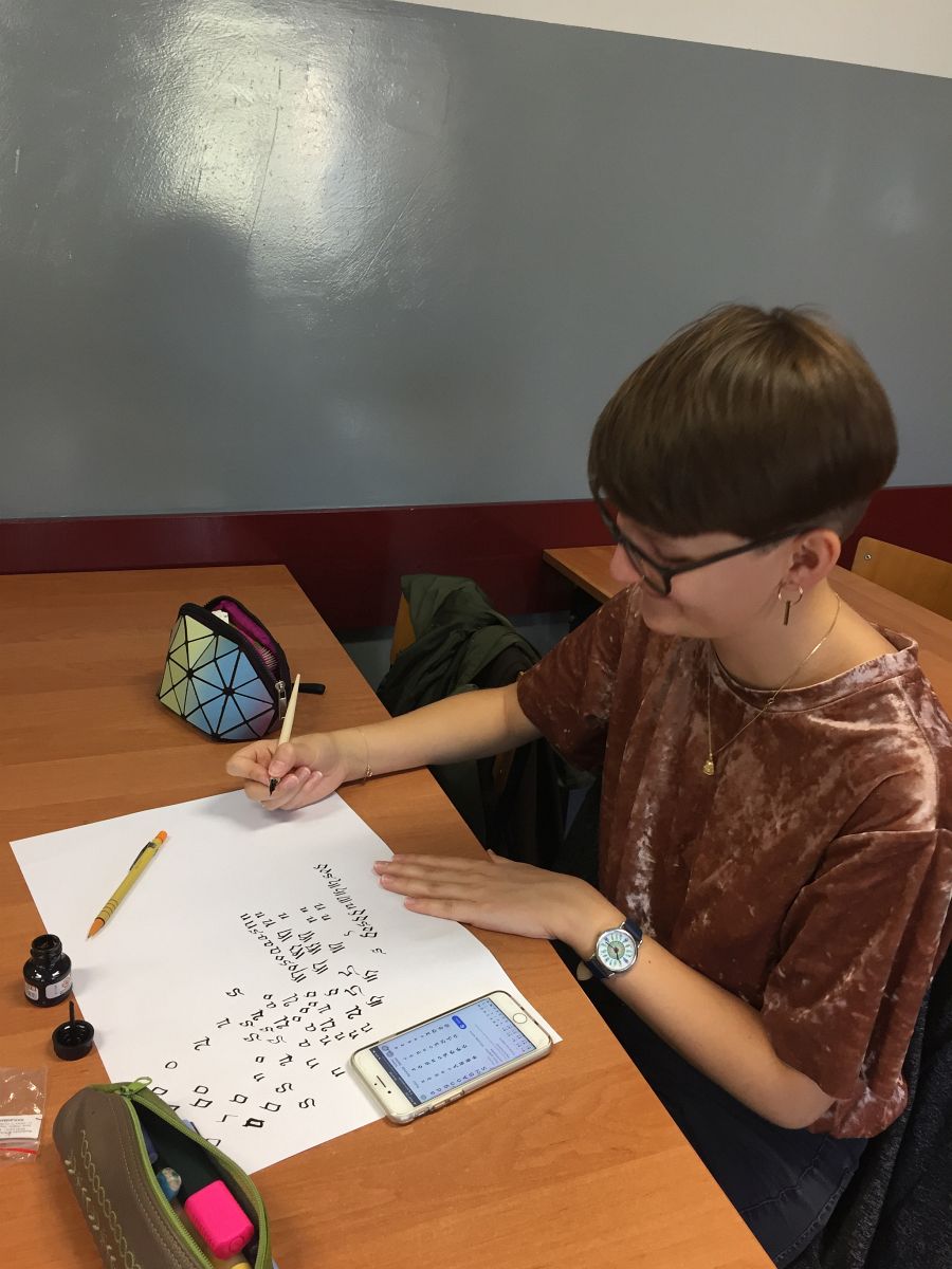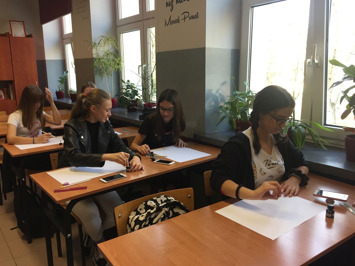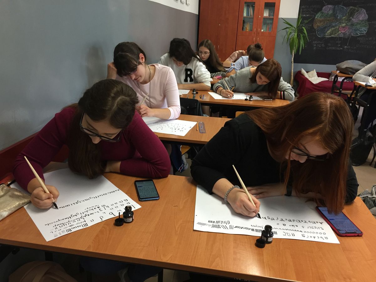 18 października odbył się pierwszy etap projektu – uczniowie wzięli udział w warsztatach kaligrafii, które prowadził malarz, rzeźbiarz i grafik Marcin Ziółkowski, artysta, który brał udział w wielu wystawach zbiorowych, a jego prace zdobią prywatne kolekcje m.in. w Polsce, Wielkiej Brytanii i USA. Pasjonujące i bardzo kreatywne warsztaty kaligrafii uświadomiły nam, jak przyjemne i twórcze może być pisanie ręczne. Zajęcia pozwoliły uczestnikom wypróbować swoich sił w posługiwaniu się stalówką umieszczoną na obsadce i maczanej w tuszu. Drugi etap to przepisywanie wybranych przez siebie wierszy na specjalnej papeterii.
