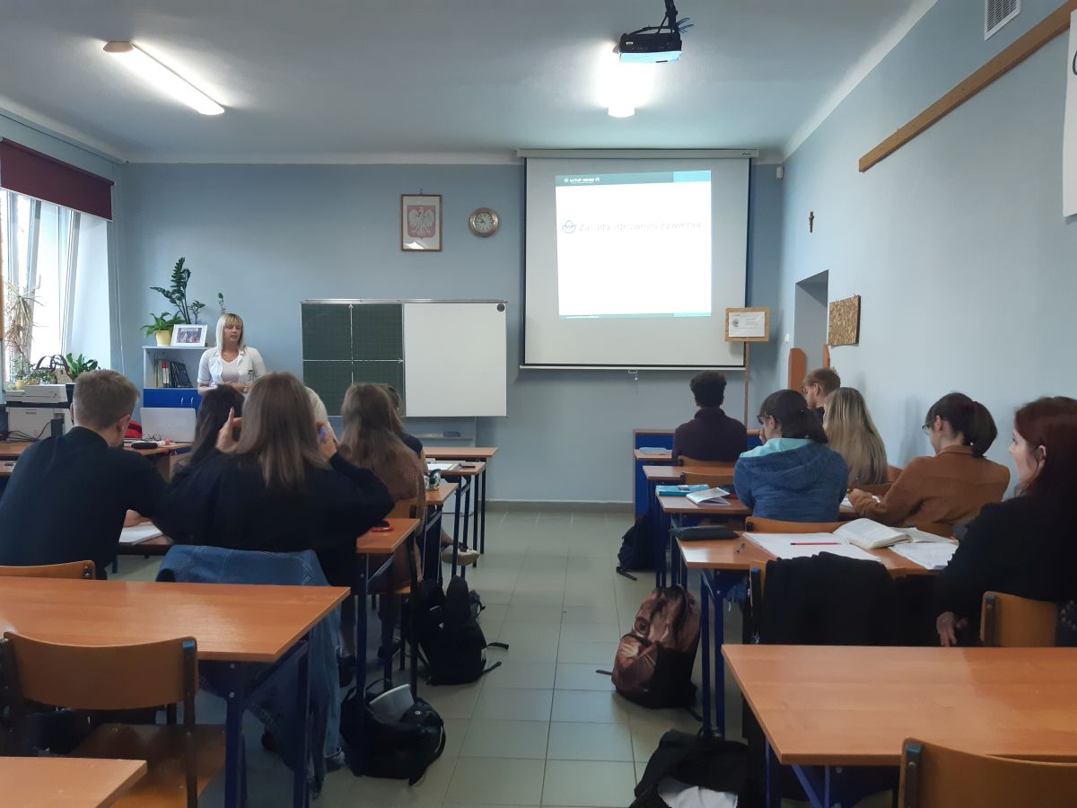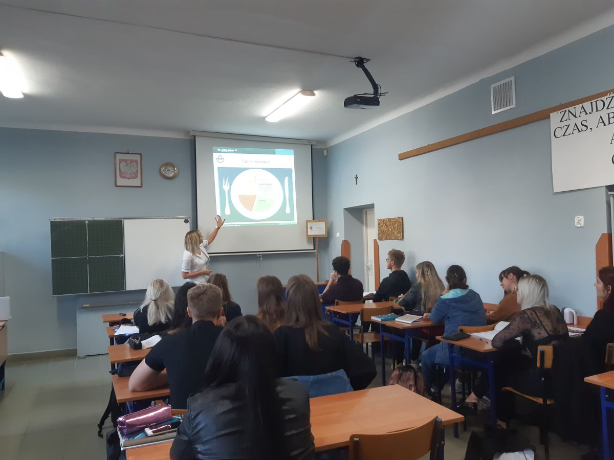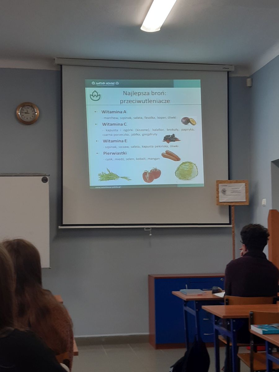 25 października drugoklasiści realizujący rozszerzenie z biologii oraz uczniowie klasy ID4 wzięli udział w zajęciach przeprowadzonych przez konsultantkę z Nature House. Młodzież dowiedziała się, jakie powinny być prawidłowe nawyki żywieniowe, nie tylko w czasie intensywnego wzrostu organizmu, ale również w ciągu całego życia.