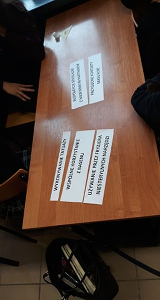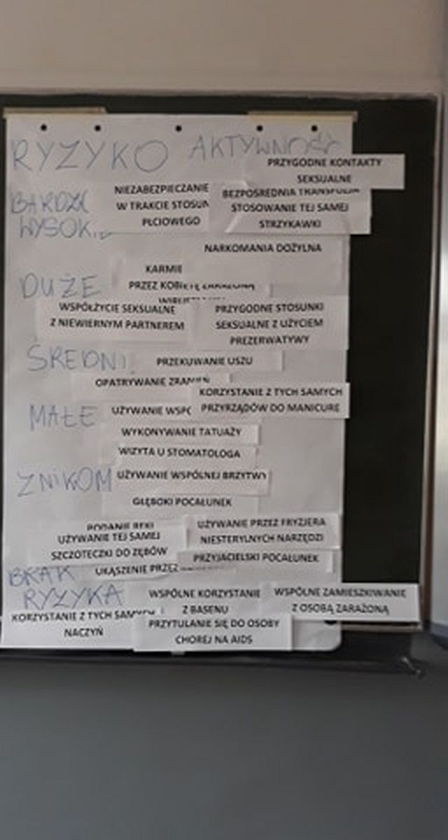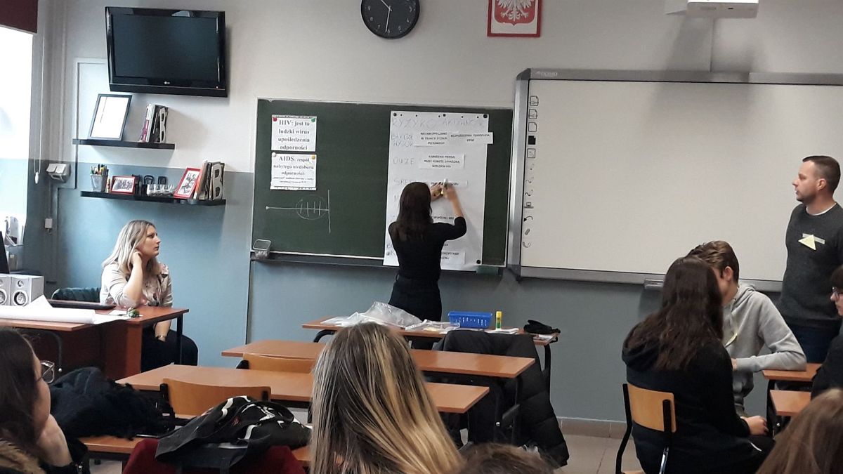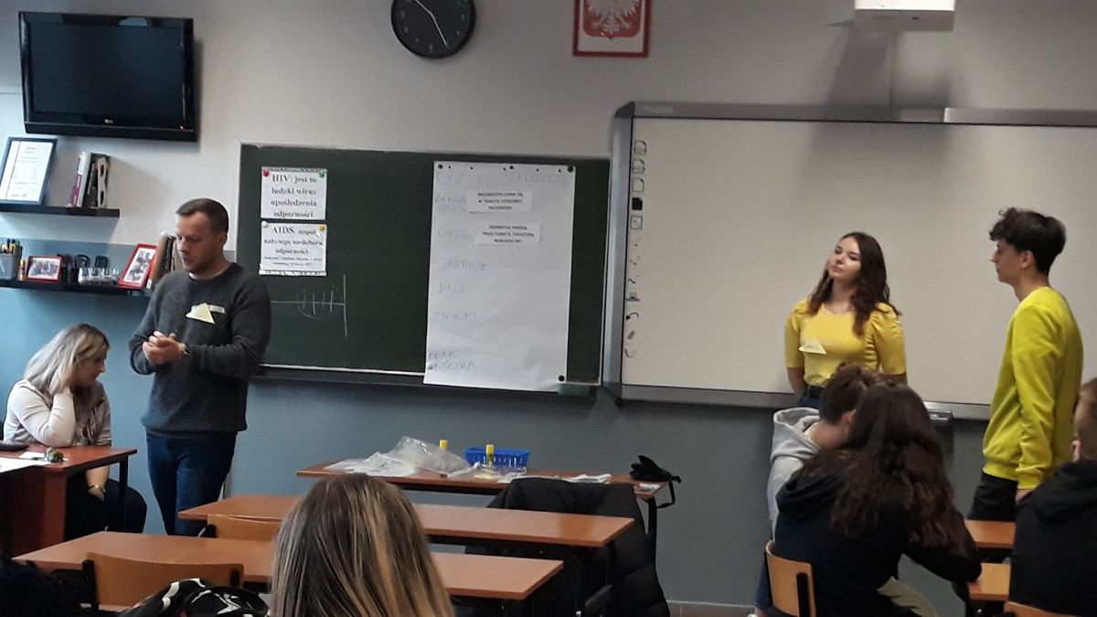 Zajęcia prowadzili terapeuci uzależnień z Miejskiego Centrum Profilaktyki w Świdniku: M. Łubkowska i P. Holuk. Celem zajęć było przekazanie wiedzy na temat dróg zakażeń, zdobycie umiejętności oceny ryzyka zakażenia HIV, przekazanie młodzieży informacji na temat działalności punktów konsultacyjno-diagnostycznych, miejsc i form pomocy osobie zakażonej HIV i chorej na AIDS. Organizatorem spotkania była K. Paszko-psycholog szkolny.