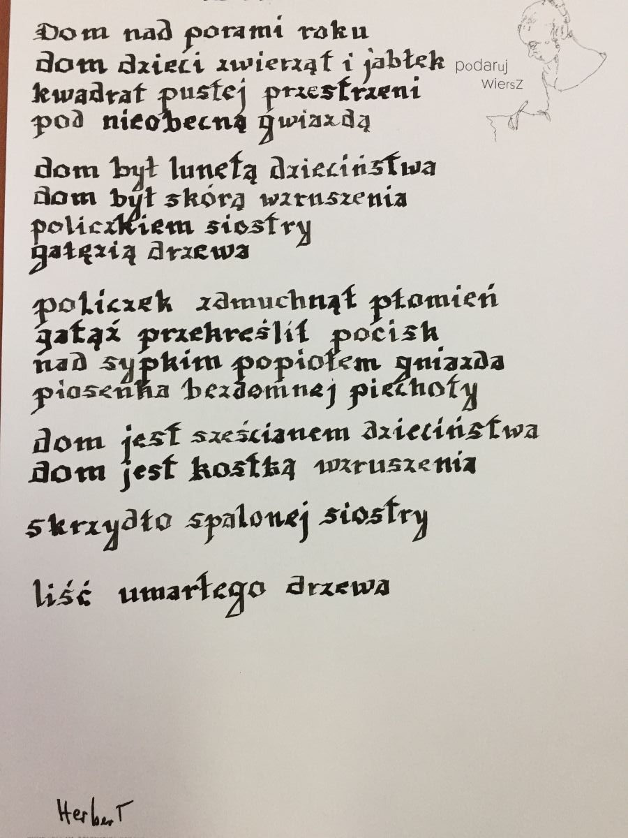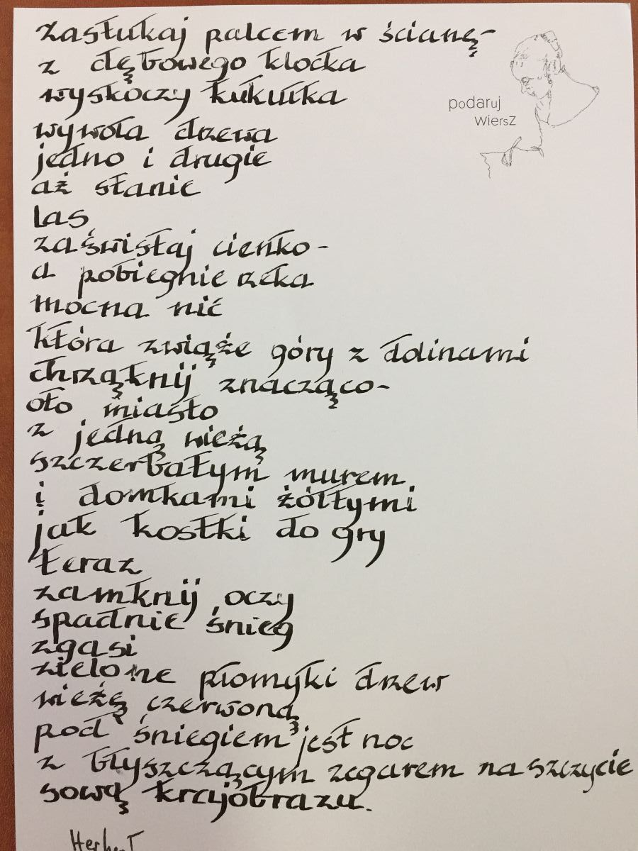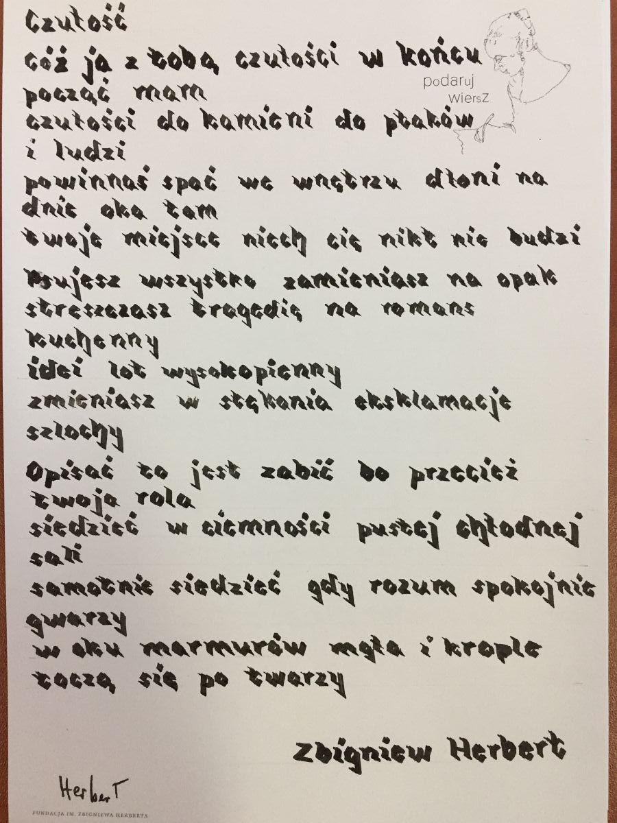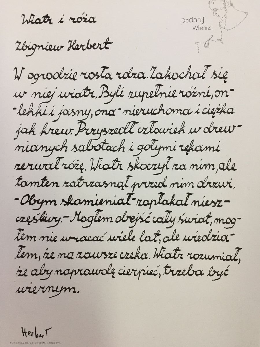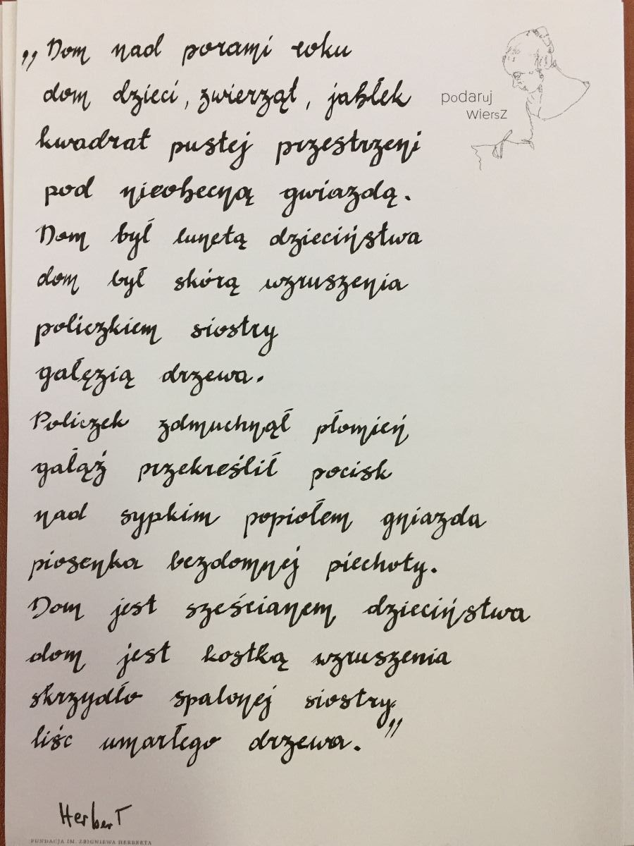W październiku informowaliśmy was o akcji społecznej „Podaruj wiersz” Fundacji im. Zbigniewa Herberta i Biblioteki Narodowej w Warszawie. Osoby biorące udział w akcji odręcznie przepisują wybrany przez siebie wiersz Zbigniewa Herberta i ofiarowują go komuś, dla kogo to może być ważne. Inspiracją dla akcji był sam Zbigniew Herbert, który pisał listy-wiersze do przyjaciół, do ważnych dla niego artystów, do osób, które cenił (niektóre z tych listów znalazły się następnie w książkach poety i należą do najprzenikliwszych i najmocniej poruszających jego utworów).