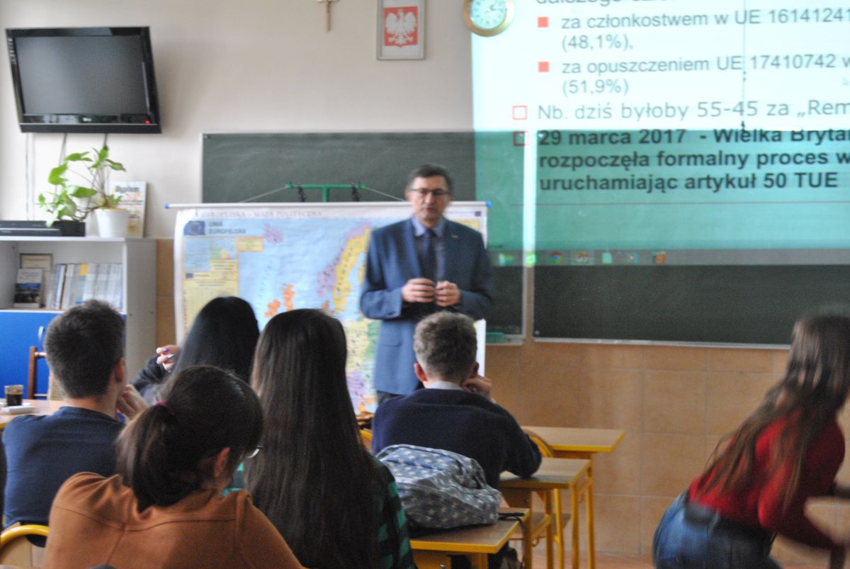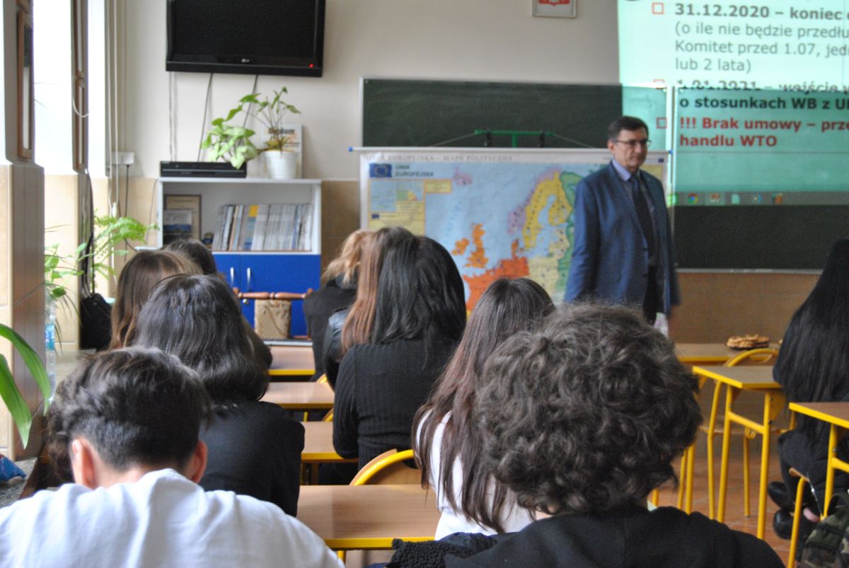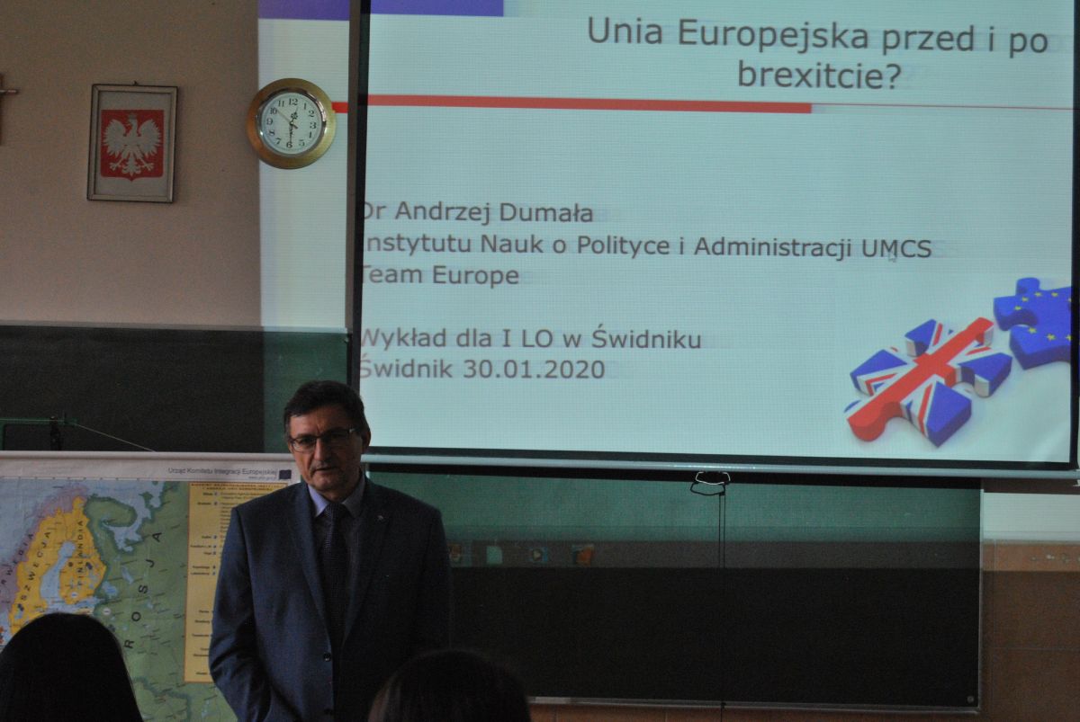 Wielka Brytania opuściła Unię Europejską 31 stycznia 2020. Dzień wcześniej w I Liceum odbyły się warsztaty edukacyjne z wiedzy o społeczeństwie poświęcone temu gorącemu tematowi. Wykład wygłosił adiunkt dydaktyczny dr Andrzej Dumała z Katedry Stosunków Międzynarodowych Wydziału Politologii i Dziennikarstwa UMCS.