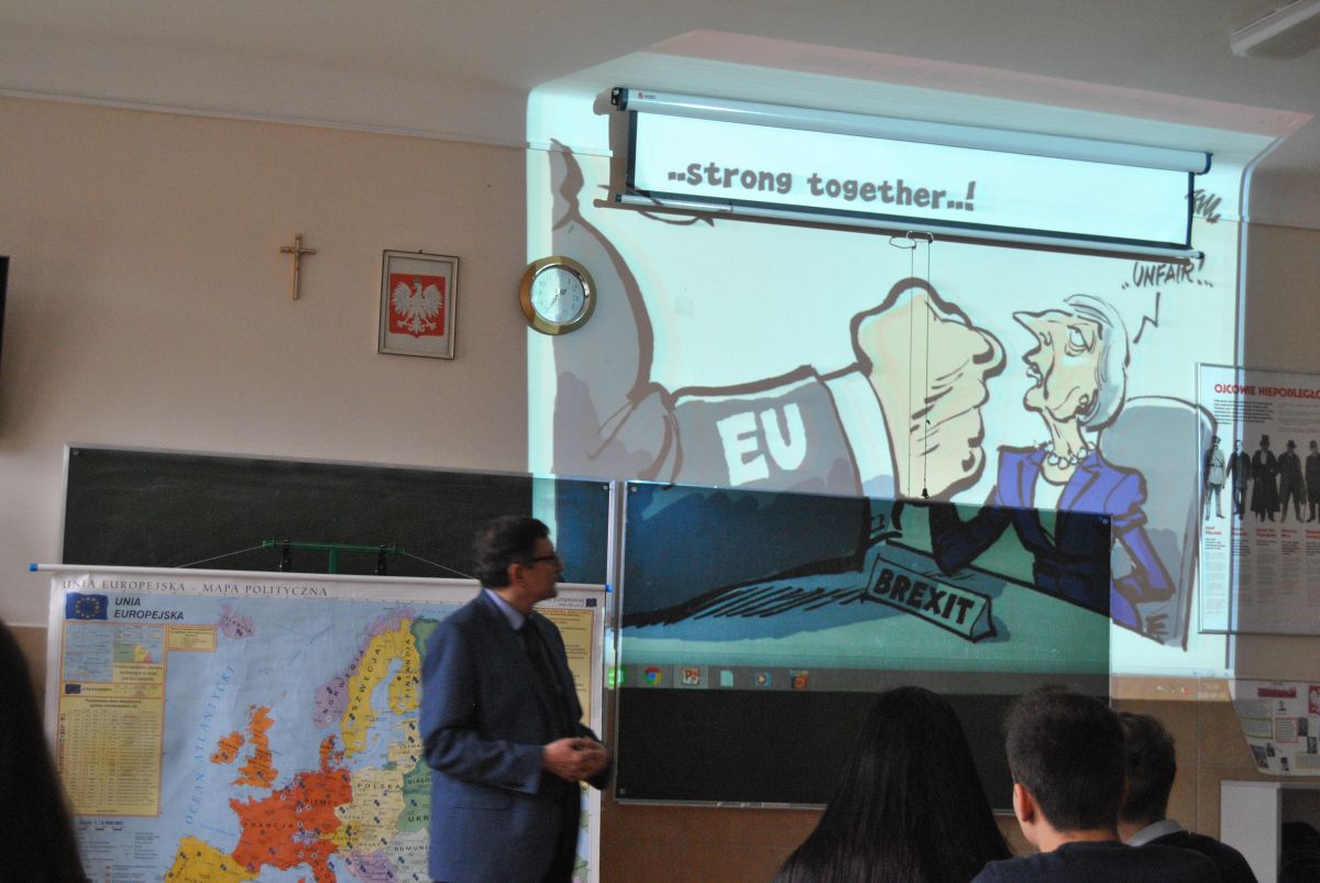 Tematem zajęć była "Unia Europejska przed i po Brexicie". Uczniowie poznali problemy ekonomiczne , społeczne i polityczne związane z wyjściem Wielkiej Brytanii z Unii Europejskiej. Koordynatorem spotkania była p. E. Derek